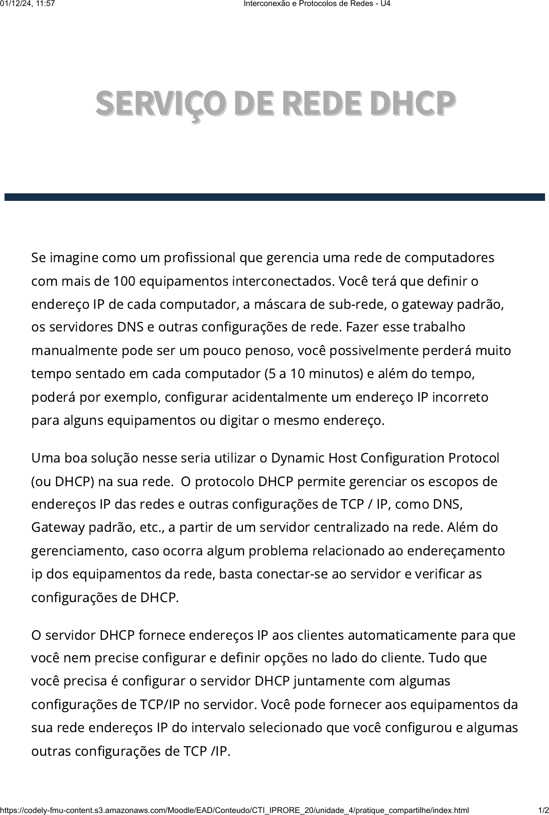 Se imagine como um pro�ssional que gerencia uma rede de computadores com mais de 100 equipamentos interconectados. Você terá que de�nir o endereço IP de cada computador, a máscara de sub-rede, o gateway padrão, os servidores DNS e outras con�gurações de rede. Fazer esse trabalho manualmente pode ser um pouco penoso, você possivelmente perderá muito tempo sentado em cada computador (5 a 10 minutos) e além do tempo, poderá por exemplo, con�gurar acidentalmente um endereço IP incorreto para alguns equipamentos ou digitar o mesmo endereço. Uma boa solução nesse seria utilizar o Dynamic Host Con�guration Protocol (ou DHCP) na sua rede. O protocolo DHCP permite gerenciar os escopos de endereços IP das redes e outras con�gurações de TCP / IP, como DNS, Gateway padrão, etc., a partir de um servidor centralizado na rede. Além do gerenciamento, caso ocorra algum problema relacionado ao endereçamento ip dos equipamentos da rede, basta conectar-se ao servidor e veri�car as con�gurações de DHCP. O servidor DHCP fornece endereços IP aos clientes automaticamente para que você nem precise con�gurar e de�nir opções no lado do cliente. Tudo que você precisa é con�gurar o servidor DHCP juntamente com algumas con�gurações de TCP/IP no servidor. Você pode fornecer aos equipamentos da sua rede endereços IP do intervalo selecionado que você con�gurou e algumas outras con�gurações de TCP /IP. SERVIÇO DE REDE DHCPSERVIÇO DE REDE DHCP 01/12/24, 11:57 Interconexão e Protocolos de Redes - U4 https://codely-fmu-content.s3.amazonaws.com/Moodle/EAD/Conteudo/CTI_IPRORE_20/unidade_4/pratique_compartilhe/index.html 1/2 Considere que você administra uma rede com 6 computadores e uma impressora que também está conectada na rede. Estes equipamentos estão conectados entre si através de um switch e utilizam como meio físico um cabo utp comum. Referências TANENBAUM, A. S. Redes de computadores. 4. ed. Rio de Janeiro: Editora Campus, 2003. Vamos Praticar Com base na rede descrita faça uma simulação de funcionamento da mesma utilizando o software Packet Tracer. Insira um servidor DHCP nesta rede e faça com que ele distribua ips para até 150 dispositivos utilizando a faixa de endereços que inicia em 192.168.1.1. Após a realização das con�gurações necessárias para o funcionamento, teste nas estações se o endereço IP foi enviado corretamente e se existe conectividade entre os dispositivos da rede. Ao �nal disponibilize o arquivo referente ao projeto simulado no Packet Tracer no fórum da seção. 01/12/24, 11:57 Interconexão e Protocolos de Redes - U4 https://codely-fmu-content.s3.amazonaws.com/Moodle/EAD/Conteudo/CTI_IPRORE_20/unidade_4/pratique_compartilhe/index.html 2/2