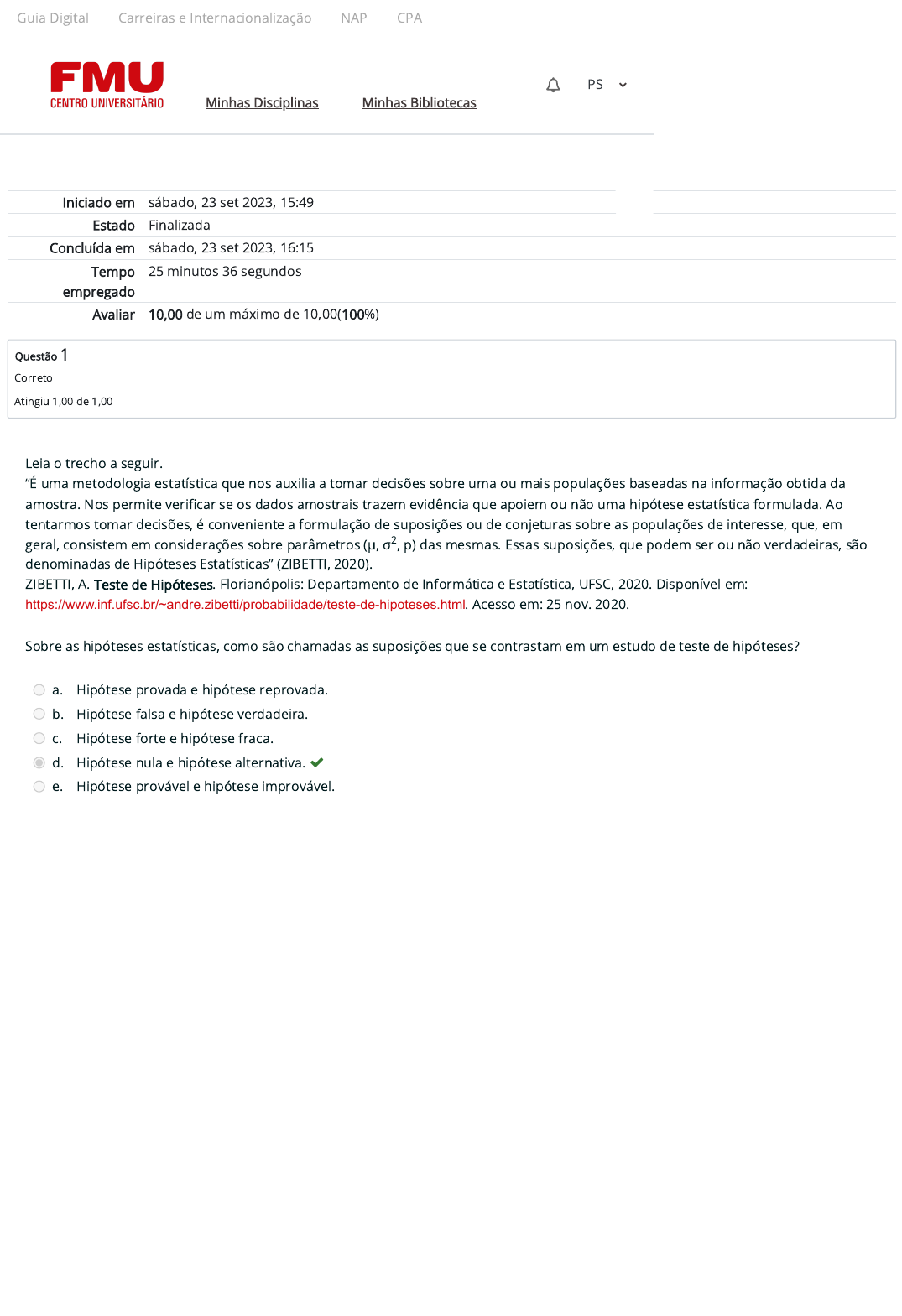 Iniciado em sábado, 23 set 2023, 15:49 Estado Finalizada Concluída em sábado, 23 set 2023, 16:15 Tempo empregado 25 minutos 36 segundos Avaliar 10,00 de um máximo de 10,00(100%) Questão 1 Correto Atingiu 1,00 de 1,00 Leia o trecho a seguir. “É uma metodologia estatística que nos auxilia a tomar decisões sobre uma ou mais populações baseadas na informação obtida da amostra. Nos permite veri�car se os dados amostrais trazem evidência que apoiem ou não uma hipótese estatística formulada. Ao tentarmos tomar decisões, é conveniente a formulação de suposições ou de conjeturas sobre as populações de interesse, que, em geral, consistem em considerações sobre parâmetros (μ, σ , p) das mesmas. Essas suposições, que podem ser ou não verdadeiras, são denominadas de Hipóteses Estatísticas” (ZIBETTI, 2020). ZIBETTI, A. Teste de Hipóteses. Florianópolis: Departamento de Informática e Estatística, UFSC, 2020. Disponível em: https://www.inf.ufsc.br/~andre.zibetti/probabilidade/teste-de-hipoteses.html. Acesso em: 25 nov. 2020. Sobre as hipóteses estatísticas, como são chamadas as suposições que se contrastam em um estudo de teste de hipóteses? a. Hipótese provada e hipótese reprovada. b. Hipótese falsa e hipótese verdadeira. c. Hipótese forte e hipótese fraca. d. Hipótese nula e hipótese alternativa. e. Hipótese provável e hipótese improvável. 2 Guia Digital Carreiras e Internacionalização NAP CPA Responsabilidade Socioambiental Minhas Disciplinas Minhas Bibliotecas PS https://www.inf.ufsc.br/~andre.zibetti/probabilidade/teste-de-hipoteses.html https://codely-fmu-content.s3.amazonaws.com/Moodle/GuiaDigital/Guia+digital/index.html https://carreiras.fmu.br/ https://codely-fmu-content.s3.amazonaws.com/Moodle/NAP/inicial/nap/fmu/index.html https://codely-fmu-content.s3.amazonaws.com/Moodle/CPA/landing_CPA/index.html https://portal.fmu.br/sustentabilidade https://ambienteacademico.com.br/ https://ambienteacademico.com.br/ https://ambienteacademico.com.br/course/view.php?id=236 Questão 2 Correto Atingiu 1,00 de 1,00 As hipóteses alternativas se contrapõem à hipótese nula. Assim, enquanto na hipótese nula é esperado uma observação sem efeito, na hipótese alternativa é indicado o efeito esperado. Todavia, a hipótese alternativa pode se apresentar de diferentes formas, dependendo do tipo e objetivo do estudo, sendo classificadas como bilaterais à esquerda, à direita ou unilaterais. Considere, então, que: 1. Teste unilateral à esquerda 2. Teste unilateral à direita 3. Teste bilateral Enumere as situações, indicando qual teste (1, 2 ou 3) seria mais indicado como hipótese alternativa nos seguintes estudos. ( ) Análise do efeito de um medicamento para redução da pressão arterial, com H = 140 mmHg. ( ) Estudo sobre suplemento de cálcio em pessoas com osteoporose, com H = 5 mg/dL. ( ) Controle de qualidade da concentração de um composto ativo em determinado ensaio, H = 10 mg/L. ( ) Estudo sobre a eficácia de vacinação, considerando a concentração inicial de anticorpos como H = 0 U/mL. ( ) Análise de lote medicamentoso, considerando uma concentração específica de dose segura, com H = 50 mg/100mg. Agora, assinale a alternativa que indica a sequência correta. a. 3 – 2 – 1 – 3 – 2. b. 2 – 1 – 3 – 1 – 3. c. 3 – 2 – 1 – 1 – 3. d. 1 – 2 – 2 – 3 – 2. e. 1 – 2 – 3 – 2 – 3. 0 0 0 0 0 Guia Digital Carreiras e Internacionalização NAP CPA Responsabilidade Socioambiental Minhas Disciplinas Minhas Bibliotecas PS https://codely-fmu-content.s3.amazonaws.com/Moodle/GuiaDigital/Guia+digital/index.html https://carreiras.fmu.br/ https://codely-fmu-content.s3.amazonaws.com/Moodle/NAP/inicial/nap/fmu/index.html https://codely-fmu-content.s3.amazonaws.com/Moodle/CPA/landing_CPA/index.html https://portal.fmu.br/sustentabilidade https://ambienteacademico.com.br/ https://ambienteacademico.com.br/ https://ambienteacademico.com.br/course/view.php?id=236 Questão 3 Correto Atingiu 1,00 de 1,00 Questão 4 Correto Atingiu 1,00 de 1,00 “O coe�ciente de correlação de Pearson (r) ou coe�ciente de correlação produto-momento ou o r de Pearson mede o grau da correlação linear entre duas variáveis quantitativas. É um índice adimensional com valores situados entre -1,0 e 1.0 inclusive, que re�ete a intensidade de uma relação linear entre dois conjuntos de dados” (CARMO, 2020). CARMO, V. Correlação. Florianópolis: Departamento de Informática e Estatística, UFSC, 2020. Disponível em: https://www.inf.ufsc.br/~vera.carmo/Correlacao/Correlacao_Pearson_Spearman_Kendall.pdf. Acesso em: 25 nov. 2020. Considerando o conceito de correlação, analise os grá�cos, a seguir, com dados hipotéticos, em que as variáveis analisadas são, no primeiro grá�co: exposição solar e concentração de vitamina D; e no segundo grá�co, o uso de protetor solar e incidência de câncer de pele. Fonte: Elaborada pela autora, 2020. Com base nos conceitos aprendidos e nos grá�cos apresentados, analise se as a�rmativas são verdadeiras (V) ou falsas (F). I. ( ) As variáveis exposição solar e vitamina D trazem uma correlação positiva e signi�cativa entre si. II. ( ) As variáveis exposição solar e câncer de pele trazem uma correlação negativa entre si. III. ( ) A correlação no grá�co da esquerda é mais signi�cativa que a no grá�co da direita, portanto r deve ser mais próximo do valor 1 no primeiro estudo. IV. ( ) A correlação entre uso de protetor solar e incidência de câncer de pele é negativa. V. ( ) O valor calculado de r é positivo em ambos os grá�cos. Agora, assinale a alternativa com a sequência correta. a. V - V - F- V- F. b. V - F - F- V- F. c. F- F - V- V- F. d. F - V - V- V- F. e. V - F - V- V- F. O coe�ciente correlação é um instrumento utilizado para a métrica de correlação linear de Pearson. As métricas de correlação informam sobre as relações ent