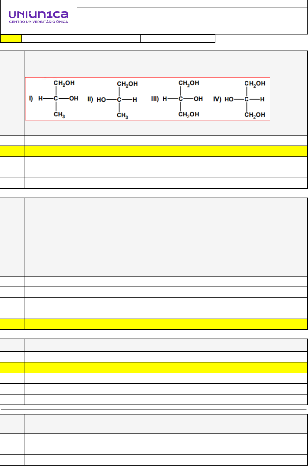 01/12/2024 15:28:58 1/2 REVISÃO DE SIMULADO Nome: JÉSSICA CAROLAINE SANTOS DUTRA Disciplina: Bioquímica Respostas corretas são marcadas em amarelo X Respostas marcardas por você. Questão 001 A condição necessária para a ocorrência de isomeria ótica é que a substância apresente assimetria. Considere as representações espaciais das estruturas a seguir: Em relação às estruturas I, II, III e IV afirma-se, corretamente A) somente a III e a IV apresentam atividade ótica. X B) somente a I e a II apresentam atividade ótica. C) somente a II e a IV apresentam atividade ótica. D) somente a I e a III apresentam atividade ótica. E) todas apresentam atividade ótica. Questão 002 O surgimento e a manutenção da vida, em nosso planeta, estão associados à água que é a substância mais abundante dentro e fora do corpo dos seres vivos. Considerando as funções exercidas nos seres vivos pela substância em destaque no texto, analise as afirmativas abaixo: I. Facilita o transporte das demais substâncias no organismo. II. Participa do processo da fotossíntese. III. Dissolve as gorduras facilitando sua absorção. IV. Auxilia na manutenção da temperatura do corpo. De acordo com as afirmativas acima, a alternativa correta é A) I, II e III. B) Todas. C) II, III e IV. D) Nenhuma. X E) I, II e IV. Questão 003 Complete a frase corretamente. “A água, substância essencial para a vida no planeta...” A) tende a aumentar seu percentual nos tecidos humanos com o passar da idade. X B) em geral é mais abundante em células com maior metabolismo. C) é uma molécula linear. D) apresenta-se em quantidade invariável, de espécie para espécie. E) é considerado um solvente universal por ser uma substância apolar. Questão 004 A distribuição de água nos organismos depende de uma série de fatores. Por que a água está distribuída de maneira desigual ao longo do corpo dos seres humanos? A) Alguns tecidos não necessitam de água para realizar suas funções. B) A gravidade tende a manter a água nas partes mais embaixo no corpo. C) A diferença de estados da água no corpo muda sua concentração. 01/12/2024 15:28:58 2/2 D) Há uma maior porcentagem em tecidos maiores. X E) Sua concentração está relacionada com a atividade metabólica dos tecidos. Questão 005 A água é uma molécula de extrema importância para os seres vivos, possuindo várias propriedades essenciais para a manutenção da vida. São propriedades da água: A) Antioxidante; capilaridade. X B) Coesão das moléculas; solvente universal. C) Quatro ligações covalentes; moderador de temperatura. D) Tensão superficial; pontes de oxigênio. E) Inflamável; reagente ou produtor.