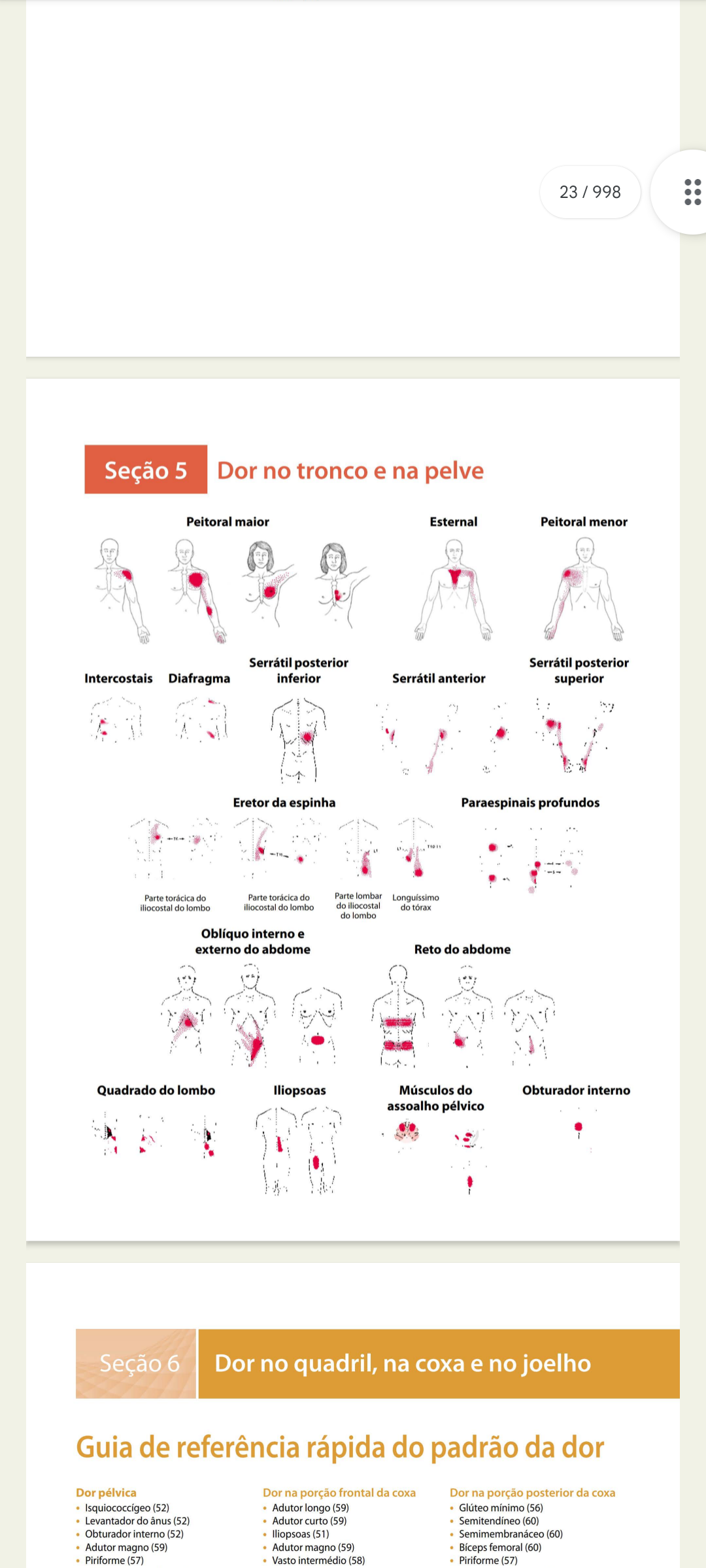 23 / 998 Seção 5 Dor no tronco e na pelve Peitoral maior Esternal Peitoral menor Serrátil posterior posterior Intercostais Diafragma inferior Serrátil anterior superior Eretor da espinha Paraespinais profundos Parte torácica do Parte torácica do Parte lombar Longuissimo iliocostal do lombo iliocostal do lombo do iliocostal do tórax do lombo Oblíquo interno e externo do abdome Reto do abdome Quadrado do lombo Músculos do Obturador interno assoalho pélvico Seção 6 Dor no quadril, na coxa e no joelho Guia de referência rápida do padrão da dor Dor pélvica Dor na porção frontal da coxa Dor na porção posterior da coxa (52) Adutor longo (59) Glúteo mínimo (56) Levantador do ânus (52) Adutor curto (59) Semitendíneo (60) Obturador interno (52) (51) Semimembranáceo (60) Adutor magno (59) Adutor magno (59) femoral (60) Piriforme (57) Vasto intermédio (58) Piriforme (57)