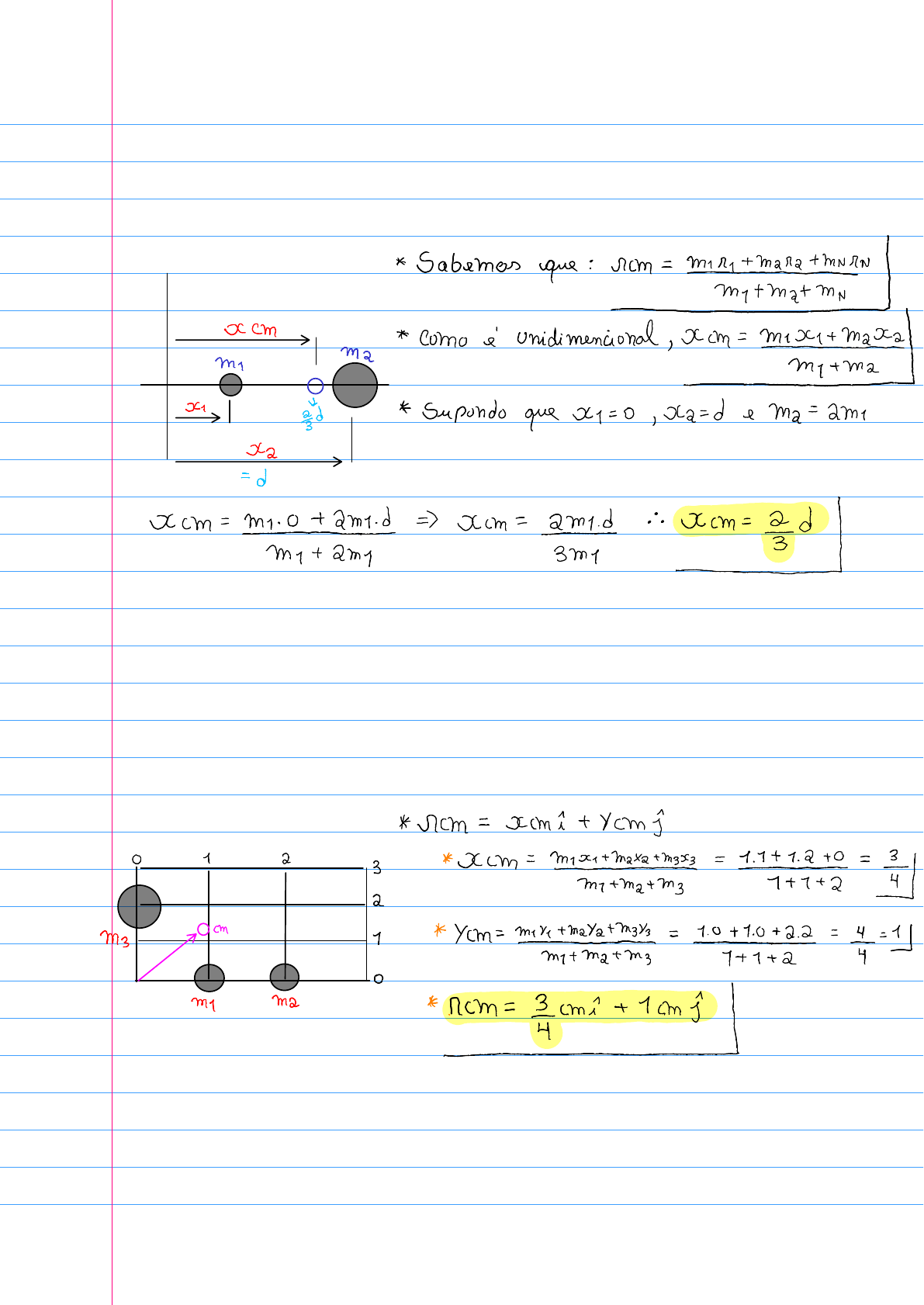 Exemplo 1 - Aula 01 - Centro de Massa Qual é a expressão para o centro de massa (CM) da figura abaixo: CM Exerc. 2 Um sistema consiste de três partículas localizadas como mostra a figura abaixo.Sendo m1= m2= 1,0 kg e m3= 2,0 kg, encontre o centro de massa do sistema. Exerc. 3 DISTRIBUIÇÃO CONT. DE MATÉRIA Exerc. 1 "Sabemos" que o centro de massa de um bastão de comprimento L e Massa M uniformemente distribuída é em seu centro geométrico. (a) Demonstre essa afirmação. (b) Suponha que o bastão não seja uniforme e, sim, que sua massa varie linearmente com x de acordo com a expressão λ = αx, onde α é uma constante. Encontre a coordenada x do seu centro de massa como fração de L. Exerc. 2 Exerc. 6 Quais são (a) a coordenada x e (b) a coordenada y do centro de massa da placa uniforme mostrada na figura abaixo se L = 5,0 cm? 1 2 3 4 4L2L 3L 4L 2L 2L 1. 2. 3. 4. Exerc. 03 EXERCICIOS DO SLIDE 2 - MOMENTO E CONSERVAÇÃO LINEAR Exemplo 1 Um homem de 91 kg está inicialmente em repouso sobre uma superfície de atrito desprezível e arremessa uma pedra, de 0,068 kg, para longe de si, imprimindo na mesma uma velocidade de 4,0 m/s. Como resultado, qual a velocidade que o homem adquire? Exemplo 2: Uma urna eleitoral com massa m=6,0kg desliza com velocidade v=4,0 m/s sobre um piso sem atrito no sentido positivo de um eixo X. A urna explode em dois pedaços. Um pedaço, com massa m1= 2,0 kg, se move no sentido positivo do eixo x com v1= 8,0 m/s. Qual a velocidade do segundo pedaço, com massa m2 ? Exemplo 3 Exercicios Slide 3 da Prova 2 de Física I Exemplo 1: Impulso numa colisão de bolas de bilhar (considere apenas uma dimensão). Suponhamos que, ao s Suponha que, ao ser atingida pela bola branca, uma bola de bilhar adquire a velocidade de 1m/s. Supondo que a sua massa seja de m = 0,3 kg, qual é a variação de seu momento linear? Qual é o impulso transmitido pela bola branca na colisão? Se o contato dura 10^-3s qual é a força média atuando na bola de bilhar? Exemplo 2: Um disco de 0,25 kg está inicialmente em repouso sobre uma superfície de gelo de atrito desprezível. No instante t = 0, uma força horizontal começa a atuar sobre o disco. A força é dada por F=(12-3,0t²)i, com F em metros e t em segundos, e atua até que seu módulo se anule. (A) Qual é o módulo do impulso da força sobre o disco de t=0,50s a t=1,25s ? (B) Qual é a variação no momento do disco de t=0 até o instante em que F=0 COLISÕES ELÁSTICAS EXEMPLO 1 Um carrinho de massa igual a 340 g movendo-se sobre um trilho de ar linear a uma velocidade inicial de 1,2 m/s sofre uma colisão elástica com outro carrinho inicialmente em repouso e massa desconhecida. Após a colisão, o primeiro carrinho continua no seu sentido original com 0,66 m/s (a) Qual é a massa do segundo carrinho (b) Qual é a sua velocidade após a colisão (c) Qual é a velocidade do centro de massa do sistema dos dois carrinhos? EXERCICIOS AULA 4 PROVA 2 DE FÍSICA TEO. I Exemplo 1 Exemplo 3 Uma bala de 5,20 g movendo-se a 672 m/s atinge um bloco de madeira de 700 g, inicialmente em repouso sobre uma superfície sem atrito. A bala atravessa o bloco e emerge, viajando no mesmo sentido, com sua velocidade reduzida a 428 m/s. (a) Qual é a velocidade final do bloco? (b) Qual é a velocidade do centro de massa do sistema bala-bloco? Exemplo 4 Um bloco de 5,0 kg com uma velocidade de 3,0 m/s colide com um bloco de 10 kg que tem uma velocidade de 2,00 m/s no mesmo sentido. Após a colisão, o bloco de 10 kg viaja no sentido original com uma velocidade de 2,5 m/s. (a) Qual é a velocidade do bloco de 5,0 kg imediatamente após a colisão? (b) De quanto varia a energia cinética total do sistema dos dois blocos por causa da colisão? (c) Suponha, ao invés disso, que o bloco de 10 kg termina com uma velocidade de 4,0m/s. Qual é, então, a variação na energia cinética total? (d) Explique o resultado que você obteve em (c). RESOLUÇÃO DE EXERCICIOS CAP. 9 EM SALA Exemplo 1 Uma pedra é solta em t = 0. Uma segunda pedra, com massa igual ao dobro da primeira, é solta do mesmo ponto em t = 100 m/s. (a) Quão abaixo do ponto de largada está o centro de massa das duas pedras em = 300 ms? (suponha que nenhuma das pedras atingiu o chão ainda.) (b) Qual é a velocidade do centro de massa das duas pedras em t = 300 ms ? Exemplo 2 Um brinquedo mecânico desliza ao longo de um eixo x sobre uma superfície sem atrito com uma velocidade (-0,40 m/s)i quando duas molas internas separam o brinquedo em três partes, como dadas na tabela abaixo. Qual é a velocidade da parte A? Parte Massa (kg) Velocidade (m/s) Um objeto deslizando sobre uma superfície sem atrito explode em duas partes de 2,0 kg, uma se deslocando a 3,0 m/s para norte e a outra a 5,0 m/s, 30º a nordeste. Qual é a velocidade original do objeto? Exemplo 3 Exemplo 4 Na Figura abaixo, um bloco inicialmente em repouso explode em dois pedaços, L e R, que deslizam sobre um piso em um trecho sem atrito e então entram em regiões com atrito onde terminam parando. O pedaço L, com uma massa de 2,0 kg, encontra um coeficiente de atrito cinético μL=0,40 e chega ao repouso em uma distância dL=0,15 m. O pedaço R encontra um coeficiente de atrito cinético μR=0,50 e desliza até o repouso por uma distância dR= 0,25 m. Qual era a massa do bloco? Exemplo 5 Uma partícula A e uma partícula B são empurradas uma contra a outra comprimindo uma mola entre elas. Quando são abandonadas, a mola as empurra em sentidos opostos até perderem contato com a mola. A massa de A é 2,0 vezes a massa de B e a energia armazenada na mola era de 60J. Suponha que a mola tenha massa desprezível e que toda a energia armazenada seja transferida para as partículas.Uma vez que esta transferência tenha sido completada, quais são as energias cinéticas (a) da partícula A e (b) da partícula B? Exemplo 6 Um veículo espacial está viajando a 4300 km/h em relação à Terra quando, após ter queimado todo