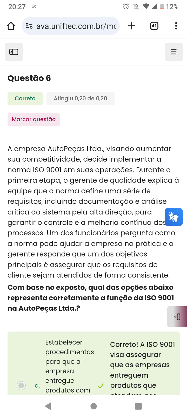 20:27 12% + 41 III Questão 6 Correto Atingiu 0,20 de 0,20 Marcar questão A empresa AutoPeças Ltda., visando aumentar sua competitividade, decide implementar a norma ISO 9001 em suas operações. Durante a primeira etapa, gerente de qualidade explica à equipe que a norma define uma série de requisitos, incluindo documentação e análise crítica do sistema pela alta direção, para garantir controle e a melhoria contínua dos processos. Um dos funcionários pergunta como a norma pode ajudar a empresa na prática e gerente responde que um dos objetivos principais é assegurar que os requisitos do cliente sejam atendidos de forma consistente. Com base no exposto, qual das opções abaixo representa corretamente a função da ISO 9001 na AutoPeças Ltda.? Estabelecer Correto! A ISO 9001 procedimentos visa assegurar para que a que as empresas empresa entreguem entregue a. produtos que produtos com