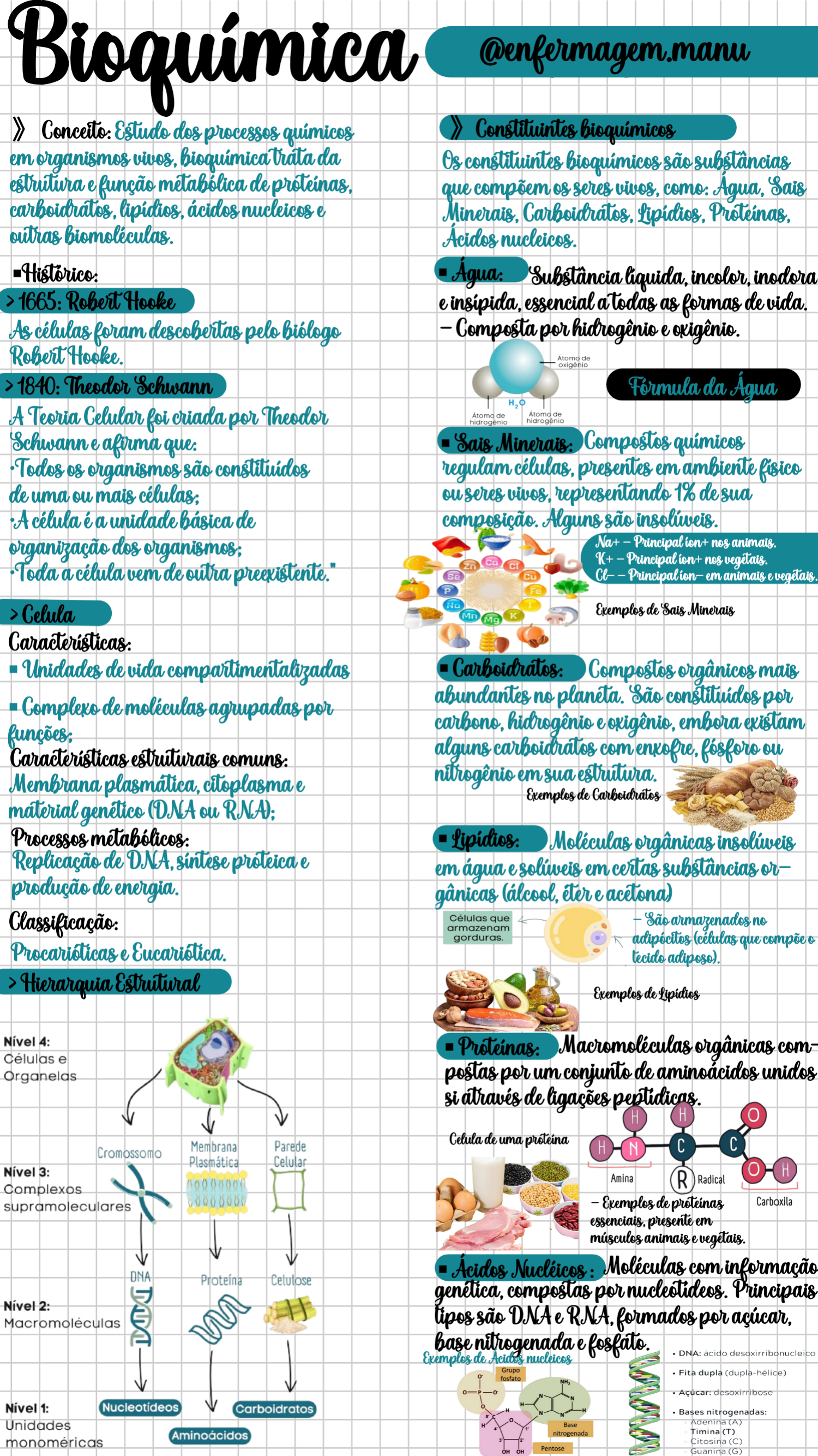 Bioquímica @enfermagem.manu Conceito: Estudo dos processos químicos Constituintes em organismos vivos, da Os constituintes são substâncias estrutura e função de que compõem os seres vivos, como: Agua, Sais carboidratos, ácidos nucleicos e Minerais, Lipídios, outras Acidos nucleicos. inodora 1665: Robert Hooke e insipida, essencial a todas as formas de As células foram descobertas pelo Biologo - Composta por hidrogênio e Robert Hooke. de Theodor Schwann Formula da Agua A Teoria Celular foi criada por Theodor de Atomo de hidrogênio Schwann e afirma que: Sais Minerais: Compostos químicos Todos os organismos são regulam células, presentes em ambiente fisico de uma ou mais ouseres vivos, representando 1% de sua A célula a unidade básica de composição. Alguns são organização dos organismos; Na+ Principalion+ nos animais. Zn K+ - Principalion+ nos vegetais. Toda a célula vem de outra preexistente." Cl- - em animais evegetais Celula Mr K Exemplos de Sais Minerais Unidades de vida Compostos orgânicos mais Complexo de agrupadas por abundantes no planeta. São por carbono, hidrogênio embora existam Características estruturais comuns: alguns carboidratos com ou Membrana plasmática, citoplasmae nitrogênio em sua Exemplos de Carboidratos material (DNA ou RNA); Processos Moleculas orgânicas Replicação de DNA, sintese proteica e em água e soliweis em certas or- produção de energia. gânicas eter e acetona) Células que armazenados no armazenam gorduras. (células que Procarioticas e Eucariotica. tecido adiposo). Hierarquia Exemplos de Nível 4: orgânicas com Células e postas por um conjunto de aminoácidos unidos através de ligações H H Cromossomo Membrana Parede Celula de uma proteina H N C C Plasmática Celular Nível 3: Amina R H Radical Complexos - Exemplos de Carboxila presente em músculos animais e vegetais. Acidos Nucleicos DNA Moleculas com informação Proteína genética, compostas por nucleotideos. Principais Nível 2: Macromoléculas tipos são DNA e RNA, formados por base nitrogenada e Exemplos de nucleicos DNA: ácido Grupo Fita dupla (dupla-hélice) fosfato Nível 1: Nucleotídeos Carboidratos Bases nit rogenadas: Unidades Base Adenina (A) Aminoácidos nitrogenada Timina (T) monoméricas Citosina (C) Pentose OH Guanina (G)Bioquimica @enfermagem.manu Ociclo de também chamado de ciclo > Processo : Ciclo de Krebs ocorre na matriz do ácido citrico ou ciclo do ácido tricarboxilico, é a fase da respiração celular produz energia para as células em oito etapas, que degrada produtos do metabolismo para ocorrendo na ou produzir São 8 reações com saldo de 2FADH2 e 2 ATPs. Acetil-CoA 1a Acetil-CoA +oxaloacetato Citrato forma citrato pela enzima citrato sintase. Oxaloacetato Isocitrato NADH CH3 NADH S CoA Malato Acetil-CoA CH2 H2O CoA-SH a Cetoglutarato CO2 HO COO Fumarato NADH CH2 Succinil-CoA FADH- Citrato Succinato CH2 COO GTP Oxaloacetato (ATP) O isocitrato é formado pela enzima 3a Isocitrato se converte em acetoglu que citrato em isocitrato com tarato pela enzima a ajuda do mediador cis aconitato Sofre descarboxilação e H NAD(P) NAD(P)H H+ HO COO CH COO H H COC H H HO Isocitrato COO Citrato cis- Aconitato desidrogenase H H CO HO H isocitrato cetoglutarato COO Isocitrato 5a Conversão de CoA em 13. com ação da enzima succinil 4a A enzimatransforma a sintetase. A CoA é retirada e essa saida libera a cetoglutarato em succinil- CoA, liberando CO2 nergia para união de GDP+Pi formando GTP e produzindo (ATP). CoA-SH NAD COO CH2 COO GDP + P GTP CoA-SH NADH CH2 CH2 2 CH2 + CO2 COO da S CoA Succini CH2 cetoglutarato desidrogenase COO Cetoglutarato Succinil-CoA Succinato Oxidação do succinato à furamato 7a fumarato é hidratado com uma +formação de FADH2. com ação da enzima de formando malato, por meio da da enzima fumarato H H OH COO FAD FAD H2 H H H H H Fumarato Carbânion do H C - H estado de transição Succinato H COO H Succinato Fumarato H 8a malato sofre uma desidrogenação ge- rando NADH e regenerando o oxaloacetato a partir OH H da e regerando oxaloacetato a partir da Ciclo de Krebs Malato da enzima Carboidrato (Papel) COO COO NAD NADH H+ CICLO Gordura Acetil-CoA DE (Carvão) (Cinzas) KREBS HO H Proteína CH2 CH2 (Madeira) L-malato desidrogenase COO COO ATP L-Malato Oxaloacetato