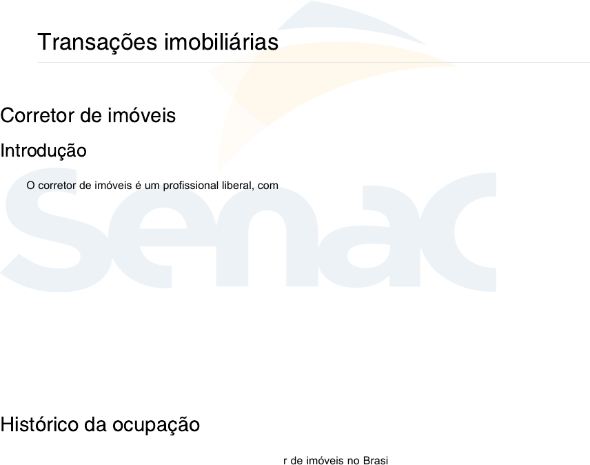 Transações imobiliárias Corretor de imóveis Introdução O corretor de imóveis é um profissional liberal, com atividade regulamentada por Lei Federal, subordinado à fiscalização pelo CRECI – Conselho Regional de Corretores de Imóveis. Sua profissão é reconhecida pela Lei Nº 6.530 e regulamentada pelo Decreto Nº 81.871/78. O corretor de imóveis pode exercer sua profissão como autônomo, acertando sua remuneração através de seus contratos particulares com seus clientes, respeitando a tabela de honorários homologada pela entidade de classe. Poderá ser dono de uma imobiliária ou trabalhar em uma, como profissional autônomo, em regime de parceria, dividindo os frutos de seu trabalho com a imobiliária, uma vez que ela deverá fornecer o suporte para o pleno exercício profissional. Poderá também trabalhar como incorporador imobiliário e também como administrador de condomínios residenciais, comerciais e locação de imóveis de terceiros. Histórico da ocupação Pode-se dizer que a história da profissão de corretor de imóveis no Brasil, está relacionada com a vinda da família real portuguesa para o país em 1808, o que resultou em uma progressiva e ampla reorganização administrativa no país. Para se ter uma ideia, durante a permanência de Dom João VI no Brasil, o número de habitantes da cidade do Rio de Janeiro passou de cerca de 50 mil para 100 mil, o que alterou significativamente a aparência da cidade. A partir daí, as cidades começaram a tomar forma com mais infraestrutura. Com o seu crescimento, começou a nascer uma nova profissão, na época chamada de agente de negócios imobiliários. No princípio, eram comerciantes locais que, através da intermediação imobiliária, passavam a aumentar seus lucros, ou, então, eram leiloeiros que se especializavam no ramo de agenciadores imobiliários. Com a ideia de sucesso da profissão, os agentes imobiliários tinham seus cadernos de apontamentos e muita disposição para intermediar negócios imobiliários. Em seguida, começou a utilização de anúncios nos jornais para divulgar as ofertas de imóveis para comercialização. Jornais antigos do Rio de Janeiro têm anúncios de imóveis já em suas primeiras edições, datadas de 1821. É também por meio das edições de jornais antigos que se pode resgatar a atuação do intermediário, que recebe “poderes” do dono do imóvel para vender. No início do século XX, a sociedade brasileira ainda era estratificada, a posição social era determinada pela propriedade fundiária e a maior parte da população vivia na zona rural. Começava a surgir uma pequena burguesia, ligada ao funcionalismo público e às atividades especulativas financeiras. Com o desenvolvimento das cidades, a especulação imobiliária ganhou força e essa atividade passou a se configurar como forma de vida, como profissão. A comercialização dos imóveis e o loteamento de novas áreas, para a criação de bairros, encontraram na figura do corretor de imóveis seu maior difusor. Graças a estes profissionais, bairros e até mesmo cidades tiveram seu crescimento organizado e a área urbana foi sendo valorizada. 22/04/2024, 13:07 Versão para impressão about:blank 1/5 Imagine naquela época a oportunidade de ganho com a abertura de novos bairros. A grande demanda, o maior boom imobiliário foi o do estado de São Paulo. O corretor imobiliário poderia vender a área a ser loteada, o parcelamento do solo em pequenos lotes, toda a construção de casas, prédios comerciais e residenciais e ainda construções das industrias e fábricas, que visavam o crescimento populacional, para a facilidade da mão de obra local. Muitos empresários e pessoas de outros segmentos viram na comercialização de imóveis uma boa possibilidade de lucro, deixaram, então, as suas cidades e migraram para grandes centros, com o objetivo de descobrir no mercado imobiliário sua verdadeira vocação. Como não existiam cursos de formação relativos à área imobiliária, quem decidia trabalhar como agente imobiliário acabava aprendendo com o que podemos chamar de “escola da vida”, ou seja, na prática. Naquele tempo não havia lei que obrigasse o vendedor ou comprador a pagar a comissão, no entanto instituía-se “a palavra” que, na maioria dos casos, valia mais que qualquer assinatura. Os primeiros corretores de imóveis, assim denominados profissionalmente, começaram a surgir por volta de 1900, nos capitais e grandes conglomerados urbanos, acompanhando a expansão do processo de urbanização no país. Com o surgimento das fábricas e a migração de pessoas do campo para as cidades, os centros urbanos se definiam frente as exigências de concentração da força de trabalho, passando a exigir certas condições, tais como: habitação, alimentação, transporte, energia, assistência à saúde, lazer, comunicações, saneamento etc. Conhecer todas as características do local passou a constituir um dos maiores patrimônios dos corretores. O mercado imobiliário passou, então, a ser uma fonte atraente de investimento. Profissionais liberais, donos de pequeno comércio ou de oficinas, fazendeiros, viúvas herdeiras, todos passaram a investir na construção de casas para locação. Essas iniciativas individuais começaram a se juntar a outras, na forma de companhias de capital aberto, que reuniam acionistas a fim de investir na construção de casas de aluguel, muitas vezes em forma de vilas. O primeiro Sindicato de Corretores de Imóveis a ser reconhecido como tal no Brasil foi o do Rio de Janeiro. A formação de uma Junta de Corretores de Imóveis, em 1936, foi o ponto de partida de todo o processo. No ano seguinte, 1937, já se conseguia a outorga da Carta Sindical, sendo um embrião do Sindicato dos Corretores de Imóveis do Município do Rio de Janeiro, o primeiro da categoria criado no país. Para saber mais: Se desejar conhecer mais sobre o histórico da profissão de corretor 