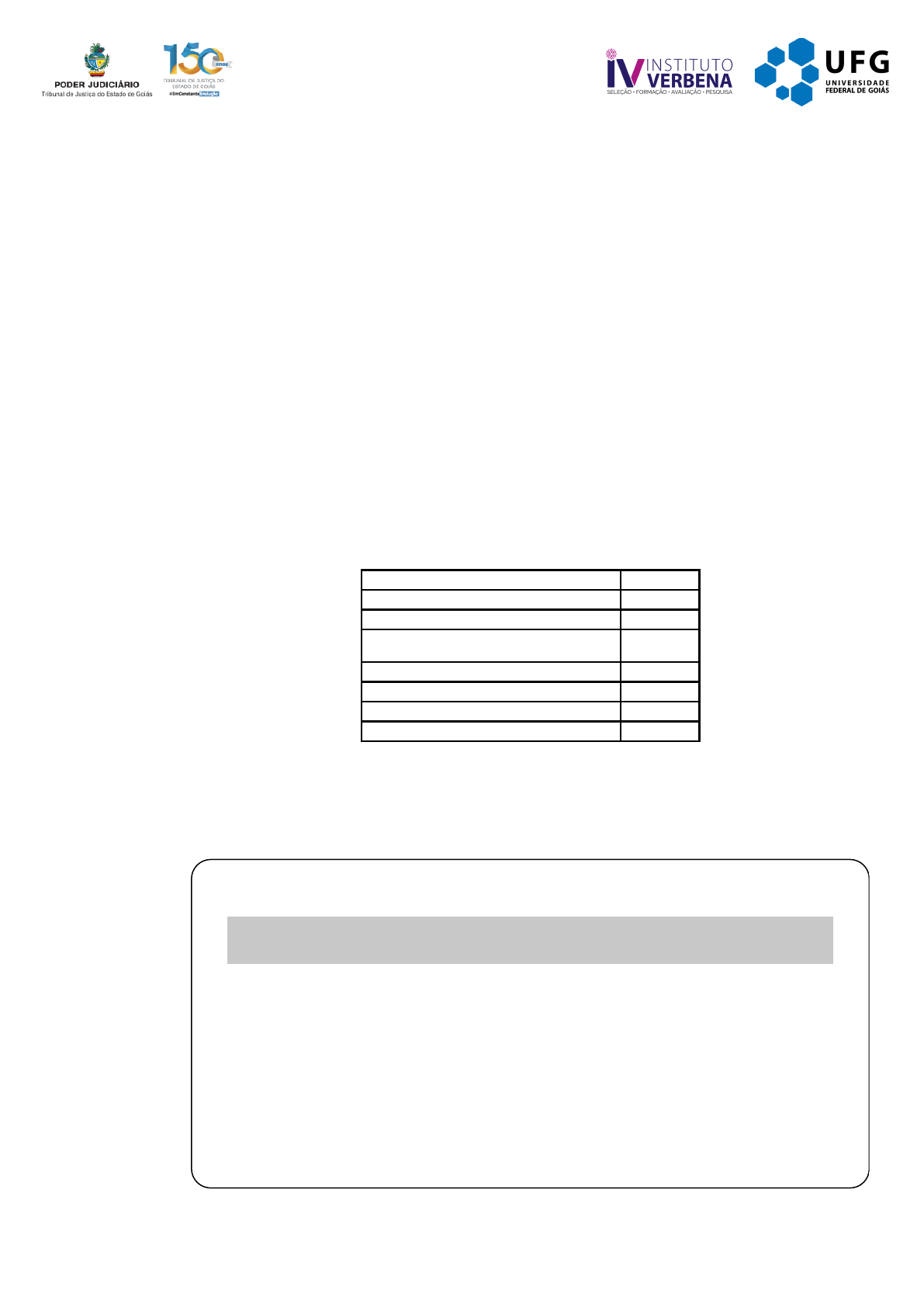 Constelações contam histórias. DISCIPLINA QUESTÕES Língua Portuguesa 01 a 10 Raciocínio Lógico e Matemático 11 a 15 Atualidades, História, Geografia e Conhecimentos Gerais do Brasil e de Goiás 16 a 20 Noções de Informática 21 a 25 Legislação 26 a 30 Conhecimentos Específicos do Cargo 31 a 60 Prova Discursiva - CO N CU RS O P Ú BL IC O 13/10/2024 CADERNO DE QUESTÕES ANALISTA JUDICIÁRIO – OFICIAL DE JUSTIÇA SOMENTE ABRA ESTE CADERNO QUANDO AUTORIZADO Atenção: Transcreva no espaço designado da sua FICHA DE IDENTIFICAÇÃO, com sua caligrafia usual, considerando as letras maiúsculas e minúsculas, a seguinte frase: LEIA ATENTAMENTE AS INSTRUÇÕES 1. Quando for autorizado abrir o caderno de questões, verifique se ele está completo ou se apresenta imperfeições gráficas que possam gerar dúvidas. Se isso ocorrer, solicite outro exemplar ao fiscal de sala. 2. Este caderno é composto por questões de múltipla escolha e prova discursiva. Cada questão de múltipla escolha apresenta quatro alternativas de respostas, das quais apenas uma é a correta. A prova discursiva é composta por 1 (uma) questão sobre o conteúdo programático previsto para os conhecimentos específicos do cargo e deverá ser respondida em, no máximo, 30 (trinta) linhas. 3. O cartão-resposta é personalizado e não será substituído em caso de erro no preenchimento. Ao recebê-lo, confira se seus dados estão impressos corretamente. Se houver erro de impressão, notifique o(a) fiscal de sala. 4. Preencha, integralmente, um alvéolo por questão, utilizando caneta de tinta AZUL ou PRETA, fabricada em material transparente. A questão deixada em branco, com rasura ou com marcação dupla terá pontuação ZERO. Concurso Público Unificado para provimento de cargos do quadro único do Poder Judiciário do Estado de Goiás TJGO UNIFICADO/2024 CONCURSO PÚBLICO IV/UFG Língua Portuguesa_Superior Leia o Texto 1 para responder às questões de 01 a 05. Texto 1 Até os meus 50 anos, escutei inúmeras vezes os seguintes "elogios": "Você não parece a idade que tem. Você está ótima para a sua idade. Você parece uma menina. Não acredito que você tem 50 anos". Adorava quando os mais mentirosos diziam que eu parecia ter 38 anos. Quanto mais mentiam, mais eu gostava. Até que, quando fiz 50 anos, levei dois tapas na cara e parei de achar que eram elogios. O primeiro foi de um aluno "sincerão". Quando perguntei para ele, aos 50, quantos anos ele achava que eu tinha, ele respondeu: "53". Como assim, 53? Logo em seguida fui para a Alemanha apresentar minhas pesquisas "O corpo como capital na cultura brasileira". Após minha palestra na Universidade Livre de Berlim, uma feminista alemã me questionou sobre a supervalorização da juventude. "Não consigo entender a lógica de você gostar quando dizem que você parece ter menos idade. Uma mulher de 50 não é mais madura, interessante e experiente do que uma de 38? Por que você acha bom pensarem que você é menos do que realmente é? Disponível em: . Acesso em: 14 ago. 2024. [Adaptado]. QUESTÃO 01 O texto acima pertence ao gênero (A) editorial. (B) reportagem. (C) notícia. (D) artigo. QUESTÃO 02 O excerto do texto, que trata do etarismo, revela o momento da (A) manutenção da opinião da autora. (B) inconstância da opinião da autora. (C) mudança da opinião da autora. (D) dubiedade da opinião da autora. QUESTÃO 03 No primeiro parágrafo, o termo “sincerão” está entre aspas por se tratar de (A) cultismo. (B) gíria. (C) estrangeirismo. (D) metonímia. QUESTÃO 04 No final do excerto, a argumentação posta em discurso direto apresenta-se pela primazia de uma sequência textual (A) dialogal. (B) narrativa. (C) descritiva. (D) injuntiva. QUESTÃO 05 Na frase “Após minha palestra na Universidade Livre de Berlim, uma feminista alemã me questionou sobre a supervalorização da juventude.”, o uso da vírgula se justifica por (A) inversão da ordem direta. (B) coordenação de orações. (C) separação de enumeração. (D) subordinação de orações. Leia o Texto 2 para responder às questões de 06 a 08. Texto 2 Um empresário que fez fortuna com criptomoedas comprou uma missão espacial privada da Spacex, empresa de Elon Musk, para partir no fim deste ano dos Estados Unidos e se tornar a primeira pessoa a sobrevoar os polos da Terra com uma tripulação a bordo. A missão, que durará entre três e cinco dias e transportará quatro pessoas, faz parte da nova era de desenvolvimento do turismo espacial privado, que tem crescido nos últimos anos nos Estados Unidos. Disponível em: . Acesso em: 15 ago. 2024. [Adaptado]. QUESTÃO 06 O tema principal do texto acima é o (A) avanço tecnológico. (B) turismo espacial. (C) empreendedorismo econômico. (D) sucesso de Elon Musk. TJGO UNIFICADO/2024 CONCURSO PÚBLICO IV/UFG Língua Portuguesa_Superior QUESTÃO 07 O excerto do texto, tal qual é apresentado, assume as características do gênero (A) crônica. (B) artigo. (C) notícia. (D) reportagem. QUESTÃO 08 A oração “que fez fortuna com criptomoedas” classifica-se como subordinada (A) substantiva subjetiva. (B) substantiva objetiva direta. (C) adjetiva explicativa. (D) adjetiva restritiva. Leia o Texto 3 para responder às questões 09 e 10. Texto 3 O aumento do limite para a emissão de carbono para a produção de hidrogênio verde previsto no marco sancionado no início deste mês atende às características do Brasil, segundo o chefe do programa de transformação industrial do Fórum Econômico Mundial. Ele é um dos responsáveis pelo relatório divulgado pela organização nesta quinta-feira (15) sobre a produção de hidrogênio verde na América Latina. Disponível em: . Acesso em: 16 ago. 2024. [Adaptado]. QUESTÃO 09 A crase presente no segmento “atende às características do Brasil” é marcada graficamente pelo acento (A) grave. (B) agudo. (C) diferencial. (D) circunflexo. QUESTÃO 10 A coesão referencial entre