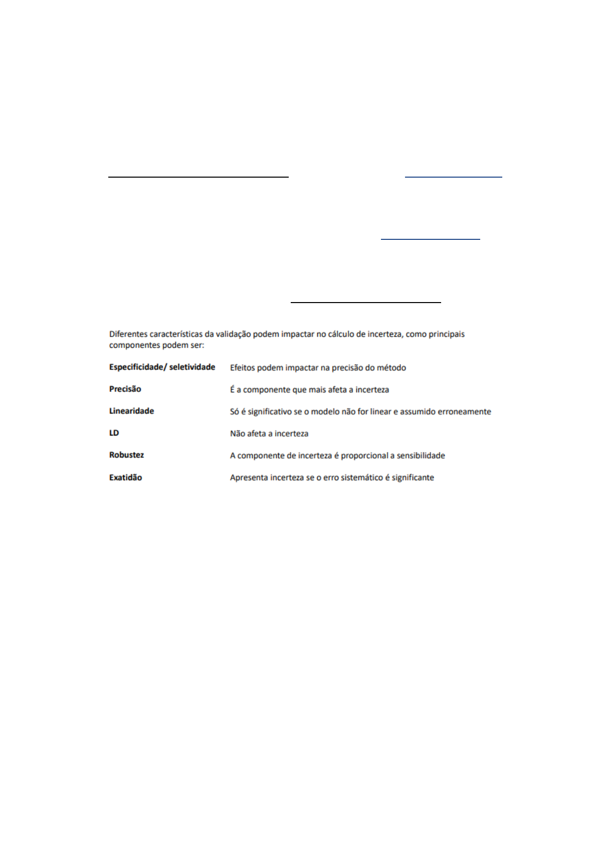 Incerteza expandida U é quando multiplicamos a incerteza padrão (u) por um fator de⇒ cobertura (K), que geralmente é 2 ou 3 (95 ou 99%) “Aleatoriedade das medidas em distintas análises no laboratório, reagentes, lotes de reagentes, sistemas e operadores, vários componentes que afetam o valor hipotético (valor verdadeiro) da concentração precisam ser considerados e tratados. Logo, de conhecimento das parcelas, suas estimações e o cálculo da incerteza conseguimos ter um intervalo dessas medidas” ● Incerteza padrão e incerteza expandida: “Comumente chamamos u de incerteza padrão, por muitas vezes ela pode ser obtida de analitos de referência e sua origem é advinda de cálculos realizados comparando metodologias de primeira linha. Mas não podemos esquecer que podemos obtê-la através da estimação do erro da média (ou mais costumeiramente chamado de Erro Padrão da Média, ou do inglês, SEM). Já a incerteza expandida U é quando multiplicamos a incerteza padrão (u) por um fator de cobertura (K), que geralmente é 2 ou 3 (95 ou 99%)” 10) Quais os parâmetros da validação que mais impactam na incerteza? Justifique a sua resposta. Logo, as principais características serão a especificidade/seletividade, precisão, robustez/sensibilidade, exatidão. Sendo a precisão o componente que mais afeta a incerteza. 11) Qual a importância de conhecermos a qualidade de um processo? O que esse conhecimento nos permite dizer sobre um processo? Proporciona melhoria, verificar se há capabilidade, eficiência e estimar a quantidade de erros. 12) Por que a métrica de defeitos por milhão de oportunidades (DPMO) é tão importante? Qual a relação entre capabilidade, variabilidade e métrica sigma? A DPMO é importante pois permite comparar processos com diferentes complexidades (ele permite que se enxergue com mais clareza que o valor da métrica sigma depende da menor quantidade de erros para que a maior qualidade apareça). Informa o quanto o resultado “está fora” ou não. Informa a capabilidade mínima (sigma⇒ 3), a qual é inversa à variabilidade biológica e é direta à métrica sigma.