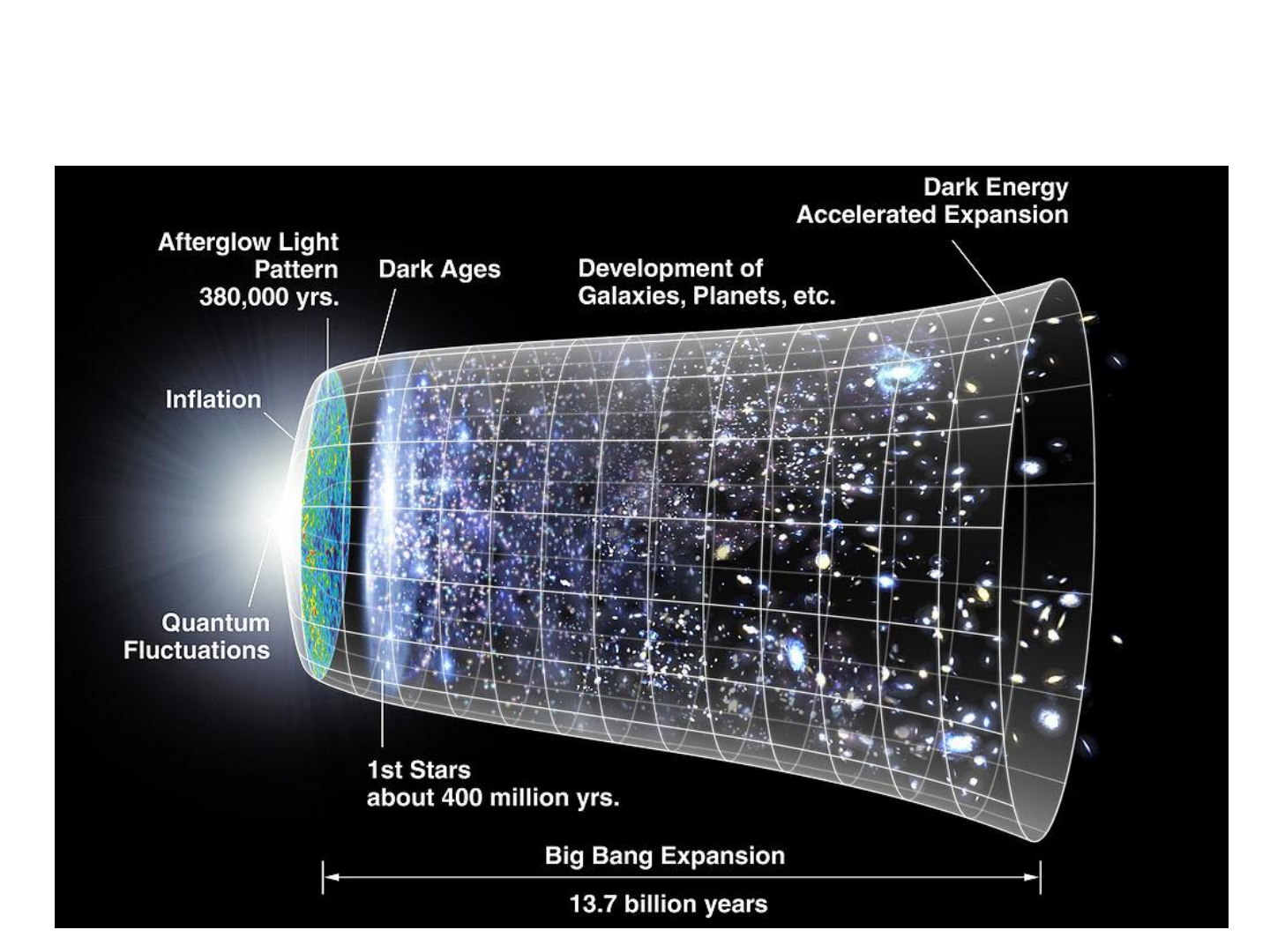 1 - O Universo e a Terra Prof. Dr. Ricardo Roberto Plaza Teixeira – IFSP-Caraguatatuba - 2015 Apostila 1 – Disciplina: História da Ciência e da Tecnologia (HCT) O Big Bang ocorreu a cerca de 13,7 bilhões de anos. Esta é a idade aproximada do Universo! Portanto o universo COM CERTEZA NÃO tem apenas cerca de 6 mil anos! Após milhões de anos Hidrogênio Estrelas Nebulosas Formação de corpos celestes Experiência / Analogia: A Expansão do Universo Hubble e a Expansão do Universo Até o início do século XX dominava a idéia de que o universo era fixo e imóvel. O golpe mortal na crença de um universo imóvel foi dado pelo famoso astrônomo inglês Edwin Hubble (1889 - 1953). Hubble observou que as galáxias (grandes aglomerados de estrelas) não ficavam paradas no céu, elas estavam se afastando de nós com velocidade proporcional à distância. Quanto mais longe a galáxia, maior a velocidade. O universo está se EXPANDINDO! Hubble chegou a essa conclusão utilizando-se da lei do efeito Doppler. Em 1927, foram encontradas soluções para as equações da relatividade, que indicavam que o universo estaria se expandindo. Mas se o universo está se expandindo, então, olhando para o futuro, daqui a milhões de anos as galáxias estarão mais longe umas das outras e o universo será maior. E olhando para o passado, para milhões de anos atrás, veremos o contrário: as galáxias mais e mais próximas entre si e o universo cada vez menor, até se chegar a um ponto em que todas as galáxias e estrelas se amontoam e a distância entre elas se torna infinitesimal. Esse ponto foi justamente onde o universo teve origem! O padre jesuíta Georges Lemaitre (1894-1966), foi o primeiro a sugerir a idéia de que o universo começou com explosão. A Teoria do Big Bang foi proposta em 1948 pelo cientista russo naturalizado norte-americano George Gamow (1904-1968). Um crítico que não concordava com a teoria, ironicamente apelidou de Big Bang (“Grande Bum”) aquela idéia “maluca” de explosão, mas a expressão pegou! Na verdade o Big Bang não foi uma Grande Explosão, mas uma Grande Expansão (Criação de espaço)! O Universo formou-se há cerca de 13,7 bilhões de anos, a partir de uma concentração de matéria e energia extremamente densa e quente. Há um instante-limite em que a distância entre as partículas do Universo seria zero e a temperatura infinita. Nesse momento, o instante zero do Big Bang, iniciou-se a expansão do Universo, verificada até hoje. Nos momentos seguintes após a explosão, o universo nascente foi se expandindo numa velocidade violenta. O universo se expande ~ 5% a cada bilhão de anos! Formação de mais espaço: Pode-se dizer que o Big Bang é um processo de criação de espaço. Um exemplo disso são as galáxias que se afastam cada vez mais a medida que mais espaço é criado entre elas. Distribuição uniforme da matéria: As partículas da matéria vão se descompactando e se distanciando umas das outras e preenchendo uniformemente todo o espaço Queda rápida e contínua da temperatura: Os astrofísicos calculam que a temperatura cai para a metade cada vez que o universo dobra de tamanho. - Uma evidência do Big Bang surgiu em 1965 com a descoberta por Arno Penzias (1933-) e Robert Wilson (1936-) de um traço da radiação deixada para trás no momento da grande explosão cósmica: um ruído que recebe o nome de radiação de fundo cósmica de ~2,7K. Ele é a energia térmica residual do Big Bang. - Stephen Hawking: Percebemos a insignificância do nosso próprio planeta na vastidão do universo e descobrimos que o tempo e o espaço são curvos e inseparáveis, que o universo está se expandindo e que teve um começo. Vamos ver o que ocorreu em alguns intervalos de tempo sucessivos ao da criação do tempo. Entre Zero (Big Bang) e 10-43 s após o Big Bang – Neste diminuto porém importante período pouca coisa conhecemos, pois as leis da física, como as conhecemos, não valiam – No 10-43 s, a temperatura do universo é cerca de 1023 K e o universo se expande rapidamente Obs: 10-43 s=0,000000000000000000000000000000000000000001 s - Até 1 milionésimo de segundo, o universo é uma mistura de partículas subatômicas (quarks, elétrons etc.) com velocidades próximas à da luz. A partir desse momento, os quarks deixam de existir como partículas livres e se associam para formar prótons e nêutrons. -- Entre 3 e 20 min de idade ocorre a nucleossíntese primordial, quando os prótons e nêutrons se fundem para formar os núcleos leves , como o hidrogênio (~75%) e o hélio (~25%), os dois principais elementos. - Cerca de 300 mil anos depois, com a união dos elétrons aos núcleos, a luz passa a caminhar livremente, a matéria e a radiação luminosa se separam e o Universo fica transparente. - Aproximadamente um bilhão de anos depois, a matéria agrega-se para formar as primeiras galáxias. Perguntas Frequentes sobre a Expansão do Universo • Onde é o centro do Universo? • Onde ocorreu o Big Bang no Universo? • Há a expansão da Terra com o Universo? • O que existe fora do Universo? • O que existia antes do Big Bang? • Se o Universo tem 14 bilhões de anos de idade como poderiam as galáxias ter viajado mais de 14 bilhões de anos-luz? Onde é o centro do Universo? Não há nenhum centro do universo porque não há nenhuma borda do universo. Em um universo finito, o espaço é curvado de modo que você poderia viajar bilhões de anos-luz em uma linha reta e eventualmente você terminaria onde você começou. É também possível que nosso universo seja infinito. Um exemplo de um universo muito pequeno que contem somente 48 estrelas. Uma nave espacial voando entre estas estrelas não pode encontrar a borda deste universo. Se sair em um lado do universo reentrará no outro lado. As pessoas na nave espacial vêem um número infinito de estrelas ao redor dela. Este universo não tem nenhum limite e nenhum centro. Onde ocorreu o Big