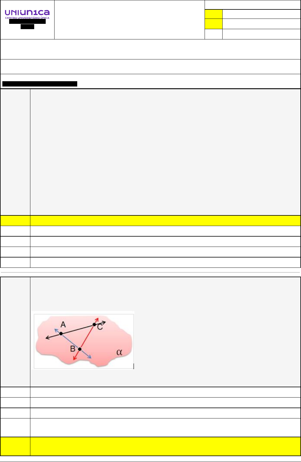 Pincel Atômico - 02/12/2024 18:56:33 1/4 Avaliação Online - Todos Capitulos/Referencias (Curso Online - Automático) Atividade finalizada em 14/10/2024 10:03:52 (2851143 / 1) LEGENDA Resposta correta na questão # Resposta correta - Questão Anulada X Resposta selecionada pelo Aluno Disciplina: GEOMETRIA: FUNDAMENTOS E MÉTODOS DE ENSINO E PRÁTICAS PEDAGÓGICAS [1352548] - Avaliação com 10 questões, com o peso total de 30,00 pontos [capítulos - Todos] Turma: Segunda Graduação: Segunda Graduação 6 meses - Licenciatura em Matemática - Grupo: FPD-OUT/2024 - SGegu0A071024 [146215] Aluno(a): - Respondeu 10 questões corretas, obtendo um total de 30,00 pontos como nota [360344_1525 05] Questão 001 Ao longo do percurso escolar, especialmente em Geografia, temos contato com muitos mapas e outros desenhos que utilizam um recurso bastante propício para representações de coisas grandes demais ou pequenas demais: a escala. Do ponto de vista da Matemática e das construções geométricas, a escala é uma relação entre duas dimensões lineares que guardam, entre si, uma proporção que permite desenhar um objeto pequeno ou grande demais com tamanhos que possamos enxergar em nosso campo visual natural. Isto é, conseguimos representar as dimensões reais de objetos por meio de desenhos ou construções que estão ligados, __________, por uma _________ com o objeto original. Assim, outros dois conceitos muito presentes ao se trabalhar com escalas são os de ________, que pode ser entendida como divisão ou relação de tamanho entre grandezas, e _________, que é a relação de igualdade entre as partes de uma grandeza. Analisando-se esse excerto, pode-se afirmar que as palavras ou expressões que melhor completam as lacunas são, nessa ordem: X proporcionalmente – razão – razão – proporção. racionalmente – razão – proporcionalmente – proporção. proporcionalmente – proporção – razão – razão. geometricamente – razão – proporção – proporção. de forma racional – proporcionalmente – razão – proporção. [360344_1528 80] Questão 002 A partir das proposições axiomáticas, postulares e primitivas foi possível estabelecer (por Euclides e por outras pessoas depois dele) relações diretas da aplicação das noções de ponto, reta, plano e espaço na própria Geometria geral e em outras áreas da Matemática. Analise a Figura 12 a seguir: Sobre essa figura, podemos destacar como verdadeira a seguinte relação direta e aplicada: Todos os ângulos retos são diferentes. Todos os ângulos retos são iguais Pode-se traçar um círculo com qualquer centro e qualquer raio. Partindo-se de dados particulares, suficientemente constatados, infere-se uma verdade geral ou universal. X A condição de existência de um plano é possuir, pelo menos, três pontos com um ponto não colinear. Pincel Atômico - 02/12/2024 18:56:33 2/4 [360344_1528 84] Questão 003 (UNESC/2017/Desenhista - adaptada) As linhas são classificadas também quanto à DEFINIÇÃO. Conforme esta classificação, a linha reta não possui início e fim conhecidos, podendo ser percorrida nos dois sentidos pelo ponto P gerador; percorrendo à esquerda, sentido negativo e à direita sentido positivo. Assinale V para verdadeiro e F para falso nas alternativas abaixo, conforme as demais classificações da linha e as suas definições. Após, marque a sequência correta de V e F: ( ) A linha é semirreta quando estiver definida apenas por uma extremidade, à esquerda ou à direita da mesma, e a outra indo ao infinito. ( ) A linha é segmento de reta quando a reta estiver definida nas duas extremidades. ( ) Segmentos adjacentes são segmentos que têm a mesma medida. ( ) Chama-se reta suporte aquela que contém o segmento ou os segmentos de reta. X V, V, F, V. V, F, F, V. F, V, F, V. V, V, V, F. F, V, V, F. [360344_1528 96] Questão 004 Não há dúvidas que os instrumentos e as técnicas utilizados nas construções geométricas são essenciais para que os axiomas e postulados da Geometria Euclidiana Plana sejam preservados e os objetos desenhados sejam, de fato, representativos das ideias abstratas e lógico-dedutivas subjacentes. Considere as seguintes afirmativas e julgue-as como verdadeiras (V) ou falsas (F): ( ) Com os ângulos disponíveis no par de esquadros é possível substituir um transferidor na medição de qualquer ângulo. ( ) Por usarem medidas internacionalmente aceitas, os instrumentos de desenho geométrico são adequados para construções mais simples em que a técnica axiomática precisa ser utilizada. ( ) Apenas uma régua graduada é suficiente para construir retas perpendiculares. Um compasso não é um instrumento adequado para fornecer a leitura direta de medidas, apesar de ser um instrumento utilizado para transportá-las. A sequência correta que preenche as lacunas é: F – F – F – V. V – V – V – V. V – V – F – V. F – V – V – V. X F – V – F – V. [360344_1587 42] Questão 005 A circunferência cuja equação geral é x2+y2-2x-10y+22=0 tem raio igual a: 1 4 5 X 2 3 [360345_1587 44] Questão 006 Um ponto P(x,y) se move de tal modo que sua distância ao ponto C(-2,3) é igual a 4. O lugar geométrico do ponto P tem equação Pincel Atômico - 02/12/2024 18:56:33 3/4 x2+y2+3x-2y+12=0 X x2+y2+4x-6y-3=0 x2+y2+3x-8y+7=0 x2+y2-2x-2y+8=0 x2+y2+4x+2y-10=0 [360345_1587 57] Questão 007 O volume do paralelepípedo formado pelos vetores u= 3i-4j+2k, v= 2i+5k-3k e w= 4i+7j+2k é 12 210 56 X 145 49 [360345_1525 04] Questão 008 (INEP/2017/Enem/adap.) A imagem apresentada na figura é uma cópia, em preto e branco, da tela quadrada intitulada O peixe, de Marcos Pinto, colocada numa parede para exposição e fixada nos pontos A e B. Por um problema na fixação de um dos pontos, a tela se soltou, girando rente à parede. Após o giro, ela ficou posicionada como ilustrado na figura, formando um ângulo de 45° com a linha do horizonte. Para recolocar 