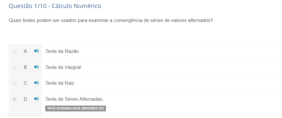 Questão 1/10 - Cálculo Numérico Quais testes podem ser usados para examinar a convergência de séries de valores alternados? A Teste da Razão B Teste de Integral Teste da Raiz D Teste de Séries Alternadas Você assinalou essa alternativa (D)