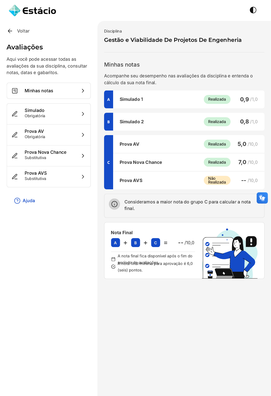 Voltar Avaliações Aqui você pode acessar todas as avaliações da sua disciplina, consultar notas, datas e gabaritos. Minhas notas Simulado Obrigatória Prova AV Obrigatória Prova Nova Chance Substitutiva Prova AVS Substitutiva Ajuda Disciplina Gestão e Viabilidade De Projetos De Engenheria Minhas notas Acompanhe seu desempenho nas avaliações da disciplina e entenda o cálculo da sua nota final. A Simulado 1 Realizada 0,9 /1,0 B Simulado 2 Realizada 0,8 /1,0 C Prova AV Realizada 5,0 /10,0 Prova Nova Chance Realizada 7,0 /10,0 Prova AVS Não Realizada -- /10,0 Nota Final A + B + C = -- /10,0 A nota final fica disponível após o fim do período de avaliações.A nota final mínima para aprovação é 6,0 (seis) pontos. Consideramos a maior nota do grupo C para calcular a nota final.