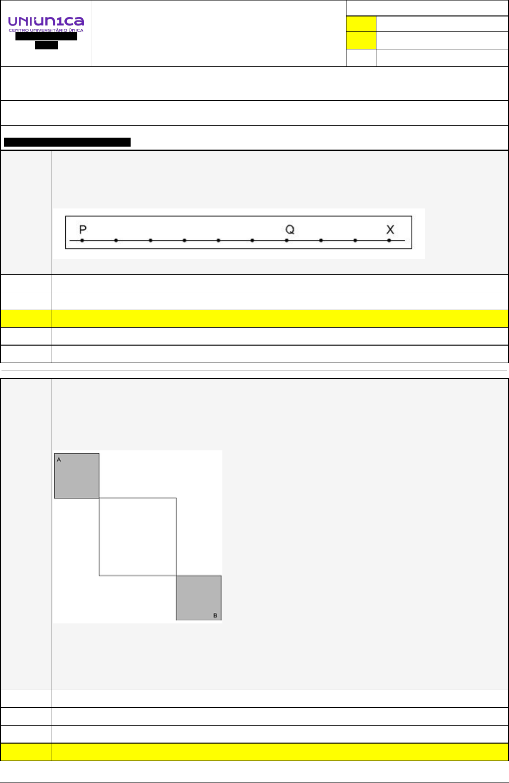 Pincel Atômico - 02/12/2024 19:16:28 1/3 Exercício Caminho do Conhecimento - Etapa 4 (21438) Atividade finalizada em 11/10/2024 07:02:37 (2853572 / 1) LEGENDA Resposta correta na questão # Resposta correta - Questão Anulada X Resposta selecionada pelo Aluno Disciplina: GEOMETRIA: FUNDAMENTOS E MÉTODOS DE ENSINO E PRÁTICAS PEDAGÓGICAS [1352548] - Avaliação com 8 questões, com o peso total de 1,67 pontos [capítulos - 2] Turma: Segunda Graduação: Segunda Graduação 6 meses - Licenciatura em Matemática - Grupo: FPD-OUT/2024 - SGegu0A071024 [146215] Aluno(a): - Respondeu 8 questões corretas, obtendo um total de 1,67 pontos como nota [359903_1528 83] Questão 001 (VUNESP/2021/Engenheiro - adaptada) O segmento de reta da figura representa um trecho de uma estrada. Os pontos destacados dividem o segmento de reta em intervalos congruentes. Esses pontos são os marcos quilométricos onde serão colocadas algumas placas. O ponto P representa o marco 5 e o ponto Q, o marco 89. Nessa representação, o marco correspondente ao ponto X é: 127,5. 125,0. X 131,0. 123,9. 139,4. [359905_1524 84] Questão 002 (IPEFAE/2020/Prefeitura de Campos do Jordão/SP/Guarda Municipal – adaptada) Uma prova de velocidade é feita em uma pista onde temos dois quadrados cinza e um quadrado branco central, como vemos na figura abaixo. Nos quadrados cinza, é permitido aos participantes utilizar toda a sua área, enquanto no branco, eles somente podem andar sobre os seus lados. Tendo em vista a ideia de que dois pontos determinam uma linha reta, as condições estabelecidas para a prova de velocidade e sabendo que o lado do quadrado cinza mede 2 metros e o lado do quadrado branco mede 4 metros, a menor distância, em metros, que pode ser percorrida para um atleta sair do ponto A e chegar ao ponto B é 8√2 4 + 8√2 16 X 8 + 4√2 Pincel Atômico - 02/12/2024 19:16:28 2/3 10 + 2√2 [359903_1528 92] Questão 003 Considere os axiomas de medição de segmentos. Tendo em vista que a todo segmento de reta corresponde um número maior ou igual a zero (ou seja, um número que corresponde ao comprimento ou à distância entre os pontos que definem um segmento de reta) e que os extremos que definem um segmento possuem correspondência biunívoca com os números reais, podemos afirmar que: Se os extremos de um segmento são distintos, o módulo entre eles sempre será negativo, especialmente se considerarmos a diferença da coordenada menor pela maior. Com quaisquer pontos de um segmento de reta é possível obter a distância entre os extremos desse segmento considerado originalmente. Se dois pontos pertencentes a um segmento coincidem, eles têm coordenadas distintas. Se dois pontos pertencentes a um segmento coincidem, eles têm coordenadas desconhecidas ou indeterminadas. X Conhecendo-se os dois extremos de um segmento, obtém-se o comprimento por meio do módulo da diferença entre as coordenadas desses pontos. [359903_1524 85] Questão 004 (EXATUS/2016/Oficial da PM ES/Combatente – adaptada) Acerca das posições relativas entre retas no plano, analise as seguintes afirmações e assinale V para as que forem verdadeiras e F para as que forem falsas: ( ) Por um ponto da reta r pode-se traçar infinitas retas perpendiculares à reta r. ( ) Por um ponto situado fora de uma reta, existe uma reta paralela à reta dada que passa por esse ponto. ( ) Se duas retas distintas são paralelas a uma terceira reta, então elas são paralelas entre si. ( ) Três retas concorrentes num mesmo ponto são coplanares. A sequência correta de V e F que completa as lacunas acima é X F – V – V – V. V – F – V – F. F – F – F – V. V – V – V – V. F – V – F – F. [359903_1528 84] Questão 005 (UNESC/2017/Desenhista - adaptada) As linhas são classificadas também quanto à DEFINIÇÃO. Conforme esta classificação, a linha reta não possui início e fim conhecidos, podendo ser percorrida nos dois sentidos pelo ponto P gerador; percorrendo à esquerda, sentido negativo e à direita sentido positivo. Assinale V para verdadeiro e F para falso nas alternativas abaixo, conforme as demais classificações da linha e as suas definições. Após, marque a sequência correta de V e F: ( ) A linha é semirreta quando estiver definida apenas por uma extremidade, à esquerda ou à direita da mesma, e a outra indo ao infinito. ( ) A linha é segmento de reta quando a reta estiver definida nas duas extremidades. ( ) Segmentos adjacentes são segmentos que têm a mesma medida. ( ) Chama-se reta suporte aquela que contém o segmento ou os segmentos de reta. F, V, V, F. V, V, V, F. X V, V, F, V. V, F, F, V. Pincel Atômico - 02/12/2024 19:16:28 3/3 F, V, F, V. [359903_1524 86] Questão 006 (CONSCAM/2018/SAAEDOCO/Contador – adaptada) De acordo com os conceitos e noções primitivas da Geometria Plana, assinale a alternativa correta ao se relacionar ponto, reta, plano e as posições relativas entre esses objetos abstratos. Duas retas coplanares são concorrentes quando não possuem ponto comum. Em um plano existe somente uma reta. X As retas paralelas coplanares classificam-se em distintas e coincidentes. As retas e semirretas coplanares possuem as mesmas características. Por um ponto dado no plano passa-se somente uma reta. [359903_1528 98] Questão 007 (CESGRANRIO/2016/Petrobras - adaptada) Considere a construção geométrica descrita a seguir. Com alguma inclinação sobre o segmento de reta AB dado, traça-se uma semirreta auxiliar s, com origem num dos extremos A ou B. Sobre esse segmento auxiliar, e a partir da origem escolhida, marcam-se comprimentos iguais, com uma abertura qualquer de compasso, de acordo com o número (n) de divisões desejadas, achando- se os pontos 1, 2, 3, ... , n. Une-se o último ponto marcado com o outro extremo do segmento de reta AB e traçam-se paralelas a essa linha que passam pelos pontos marcados na semirreta auxiliar s. Após realizar esse procedimento descrito, obtém-se a con