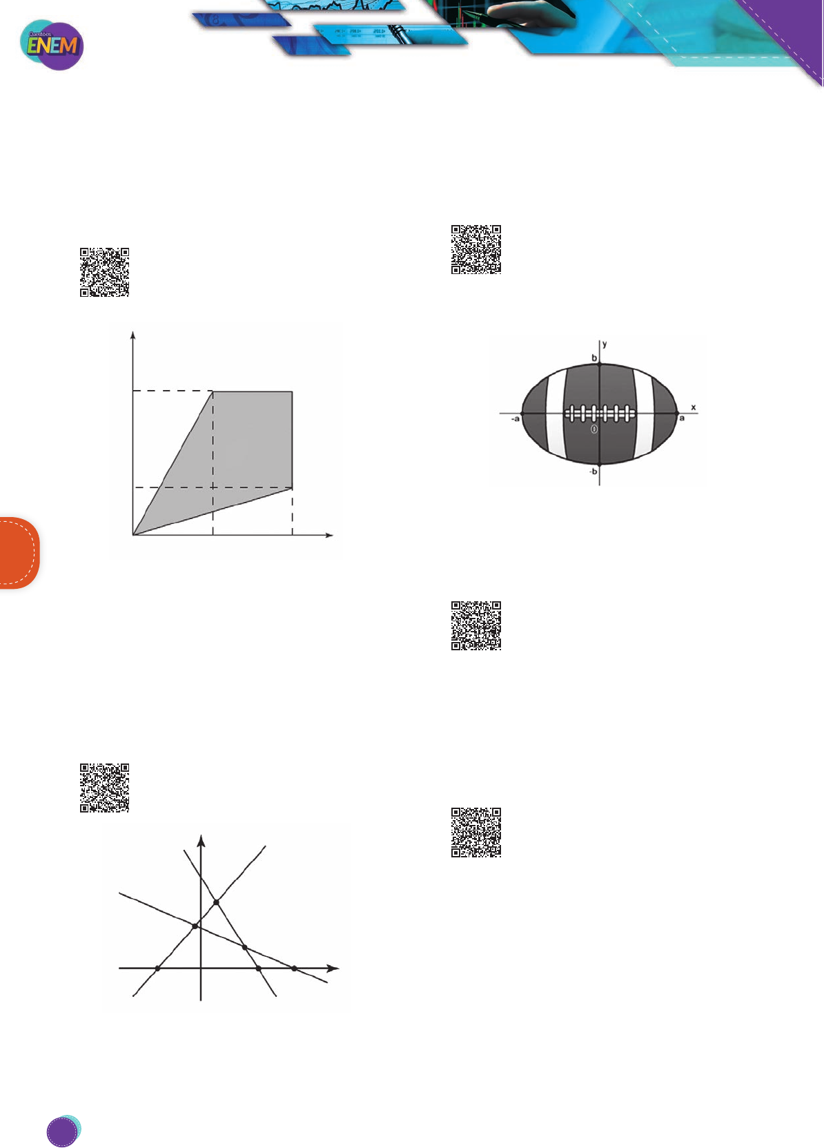 MatemáticaMatemática 190 MatemáticaMatemática 190190 7h da manhã de segunda-feira. Às 13h do mesmo dia, verificou- -se que já haviam sido usados 15% do volume da água existente na caixa. Um dispositivo eletrônico interrompe o funcionamento do sistema quando o volume restante na caixa é de 5% do vo- lume total, para reabastecimento. Supondo que o sistema funcione sem falhas, a que horas o dispositivo eletrônico interromperá o funcionamento? A) Às 15h de segunda-feira. B) Às 11h de terça-feira. C) Às 14h de terça-feira. D) Às 4h de quarta-feira. E) Às 21h de terça-feira. 192. (Enem-2016) Uma região de uma fábrica deve ser isolada, pois nela os empregados ficam expostos a riscos de acidentes. Essa região está representada pela porção de cor cinza (quadrilátero de área S) na figura. 0 4 8 x 3 9 y S Para que os funcionários sejam orientados sobre a localização da área isolada, cartazes informativos serão afixados por toda a fábrica. Para confeccioná-los, um programador utilizará um software que permite desenhar essa região a partir de um con- junto de desigualdades algébricas. As desigualdades que devem ser utilizadas no referido software, para o desenho da região de isolamento, são A) 3 0 2 0 8 9y x y x y x− ≤ − ≥ ≤ ≤; ; ; B) 3 0 2 0 9 8y x y x y x− ≤ − ≥ ≤ ≤; ; ; C) 3 0 2 0 9 8y x y x y x− ≥ − ≤ ≤ ≤; ; ; D) 4 9 0 8 3 0 8 9y x y x y x− ≤ − ≥ ≤ ≤; ; ; E) 4 9 0 8 3 0 9 8y x y x y x− ≤ − ≥ ≤ ≤; ; ; 193. (Enem-2016) Na figura estão representadas três retas no plano cartesiano, sendo P, Q e R os pontos de in- tersecções entre as retas e A, B e C os pontos de in- tersecções dessas retas com o eixo x. y t Q P R C xBA r s Essa figura é a representação gráfica de um sistema linear de três equações e duas incógnitas que A) possui três soluções reais e distintas, representadas pe- los pontos P, Q e R, pois eles indicam onde as retas se intersectam. B) possui três soluções reais e distintas, representadas pelos pontos A, B e C, pois eles indicam onde as retas intersectam o eixo das abscissas. C) possui infinitas soluções reais, pois as retas se intersectam em mais de um ponto. D) não possui solução real, pois não há ponto que pertença simultaneamente às três retas. E) possui uma única solução real, pois as retas possuem pon- tos em que se intersectam. 194. (Enem-2015) A figura representa a vista superior de uma bola de futebol americano, cuja forma é um elipsoide obtido pela rotação de uma elipse em torno do eixo das abscissas. Os valores a e b são, respecti- vamente, a metade do seu comprimento horizontal e a metade do seu comprimento vertical. Para essa bola, a diferença entre os comprimentos horizontal e vertical é igual à metade do comprimento vertical Considere que o volume aproximado dessa bola é dado por V = 4ab2. O volume dessa bola, em função apenas de b, é dado por A) 8b3 B) 6b3 C) 5b3 D) 4b3 E) 2b3 195. (Enem-2015) Um arquiteto está reformando uma casa. De modo a contribuir com o meio ambiente, decide reaproveitar tábuas de madeira retiradas da casa. Ele dispõe de 40 tábuas de 540 cm, 30 de 810 cm e 10 de 1 080 cm, todas de mesma largura e espessura. Ele pediu a um carpinteiro que cortasse as tábuas em pedaços de mesmo comprimento, sem deixar sobras, e de modo que as novas peças ficassem com o maior tamanho possível, mas de comprimento menor que 2 m. Atendendo o pedido do arquiteto, o carpinteiro deverá produzir A) 105 peças. B) 120 peças. C) 210 peças. D) 243 peças. E) 420 peças. 196. (Enem-2015) O gerente de um cinema fornece anual- mente ingressos gratuitos para escolas. Este ano serão distribuídos 400 ingressos para uma sessão vesper- tina e 320 ingressos para uma sessão noturna de um mesmo filme. Várias escolas podem ser escolhidas para recebe- rem ingressos. Há alguns critérios para a distribuição dos ingressos: 1. cada escola deverá receber ingressos para uma única sessão; 2. todas as escolas contempladas deverão receber o mesmo número de ingressos; 3. não haverá sobra de ingressos (ou seja, todos os ingressos serão distribuídos). O número mínimo de escolas que podem ser escolhidas para obter ingressos, segundo os critérios estabelecidos, é A) 2 B) 4 C) 9 D) 40 E) 80 PG18EA445SD00_QE_2018_MIOLO.indb 190 26/02/2018 16:43:43