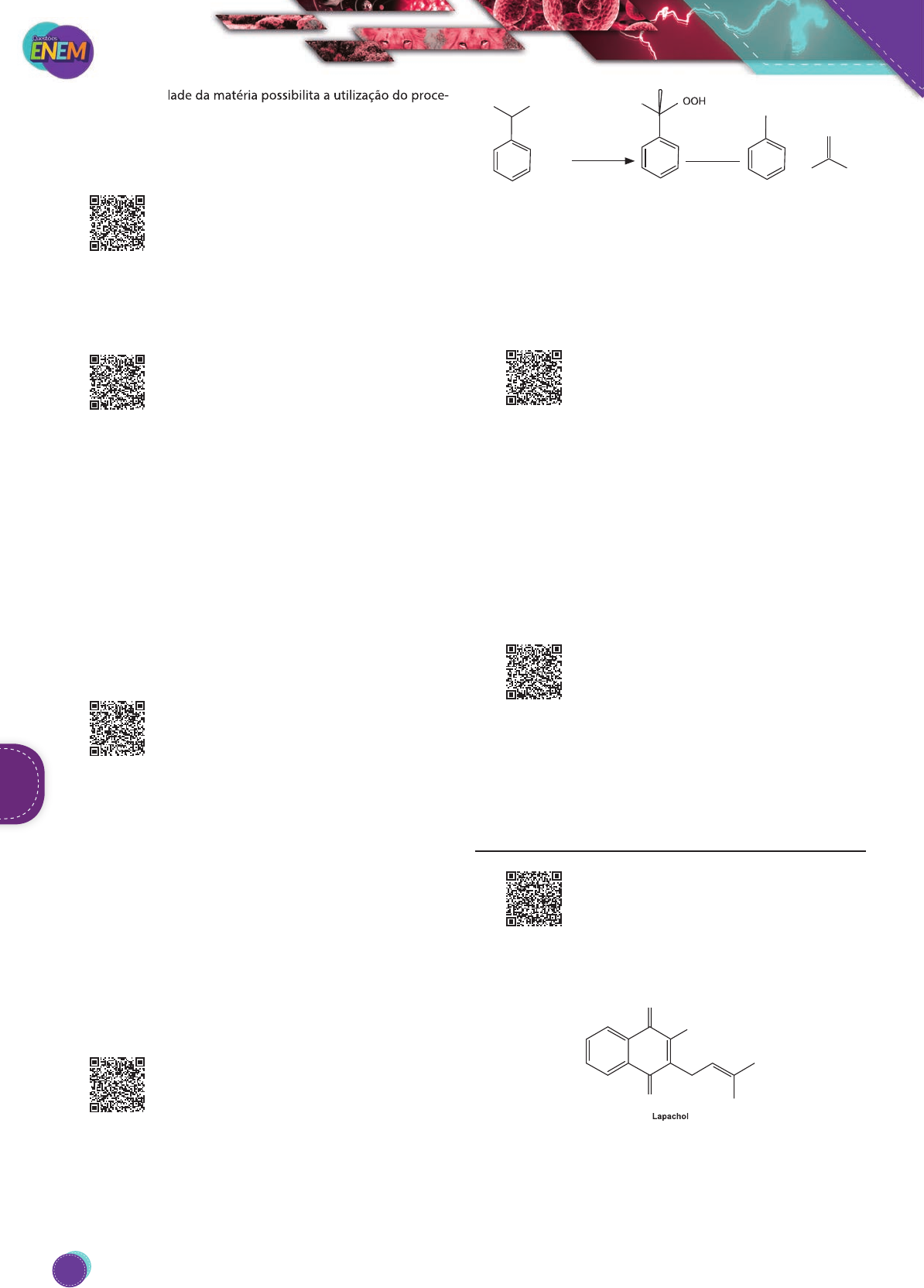 Qual propriedade da matéria possibilita a utilização do proce- dimento descrito? A) Massa. B) Volume. C) Densidade. D) Porosidade. E) Maleabilidade. 16. (Enem-2015) Na natureza a matéria é constantemente transformada por meio dos ciclos biogeoquímicos. Além do ciclo da água, existem os ciclos do carbono, do enxofre, do fósforo, do nitrogênio e do oxigênio. O elemento que está presente em todos os ciclos nomeados é o A) fósforo. B) enxofre. C) carbono. D) oxigênio. E) nitrogênio. 17. (Enem-2015) Um grupo de pesquisadores desenvol- veu um método simples, barato e eficaz de remoção de petróleo contaminante na água, que utiliza um plástico produzido a partir do líquido da castanha- -de-caju (LCC). A composição química do LCC é muito parecida com a do petróleo e suas moléculas, por suas características, interagem formando agregados com o petróleo. Para retirar os agregados da água, os pesquisadores misturam ao LCC nano- partículas magnéticas. (KIFFER, D. Novo método para remoção de petróleo usa óleo de mamona e castanha-de-cajú. Disponível em: . Acesso em: 31 jul. 2012. Adaptado.) Essa técnica considera dois processos de separação de misturas, sendo eles, respectivamente, A) flotação e decantação. B) decomposição e centrifugação. C) floculação e separação magnética. D) destilação fracionada e peneiração. E) dissolução fracionada e magnetização. 18. (Enem-2014) Para impedir a contaminação microbia- na do suprimento de água, deve-se eliminar as emissões de efluentes e, quando necessário, tratá-lo com desinfetante. O ácido hipocloroso (HCO), pro- duzido pela reação entre cloro e água, é um dos compostos mais empregados como desinfetante. Contudo, ele não atua somente como oxidante, mas também como um ativo agente de cloração. A presença de matéria orgânica dissolvida no suprimento de água clorada pode levar à formação de clorofórmio (CHC3) e outras espécies orgânicas cloradas tóxicas. (SPIRO, T. G., STIGLIANI, W. M. Química ambiental. São Paulo: Pearson, 2009. Adaptado.) Visando eliminar da água o clorofórmio e outras moléculas orgânicas, o tratamento adequado é a A) filtração, com o uso de filtros de carvão ativo. B) fluoretação, pela adição de fluoreto de sódio. C) coagulação, pela adição de sulfato de alumínio. D) correção do pH, pela adição de carbonato de sódio. E) floculação, em tanques de concreto com a água em movimento. 19. (Enem-2014) O principal processo industrial utilizado na produção de fenol é a oxidação do cumeno (iso- prilbenzeno). A equação mostra que esse processo envolve a formação do hidroperóxido de cumila, que em seguida é decomposto em fenol e acetona, ambos usados na indústria química como precursores de moléculas mais complexas. Após o processo de síntese, esses dois insumos devem ser separados para comercialização individual. O Cumeno Hidroperóxido de cumila Fenol Acetona +O2 OOH H2O/H2SO4Catalisador OH + Considerando as características físico-químicas dos dois insumos formados, o método utilizado para a separação da mistura, em escala industrial, é a A) filtração. B) ventilação. C) decantação. D) evaporação. E) destilação fracionada. 20. (Enem-2013) Química Verde pode ser definida como a criação, o desenvolvimento e a aplicação de produ- tos e processos químicos para reduzir ou eliminar o uso e a geração de substâncias nocivas à saúde hu- mana e ao ambiente. Sabe-se que algumas fontes energéticas desenvolvidas pelo homem exercem, ou têm potencial para exercer, em algum nível, impactos ambientais negativos. (CORREA, A. G.; ZUIN, V. G. (Orgs.). Quimica verde: fundamentos e aplicações. São Carlos: EdUFSCar, 2009.) À luz da Química Verde, métodos devem ser desenvolvidos para eliminar ou reduzir a poluição do ar causada especialmente pelas A) hidrelétricas. B) termelétricas. C) usinas geotérmicas. D) fontes de energia solar. E) fontes de energia eólica. 21. (Enem-2013) Entre as substâncias usadas para o trata- mento de água está o sulfato de alumínio que, em meio alcalino, forma partículas em suspensão na água, às quais as impurezas presentes no meio se aderem. O método de separação comumente usado para retirar o sulfato de alumínio com as impurezas aderidas é a A) flotação. B) levigação. C) ventilação. D) peneiração. E) centrifugação. Equilíbrio iônico 22. (Enem-2017) Diversos produtos naturais podem ser obtidos de plantas por processo de extração. O lapa- chol é da classe das naftoquinonas. Sua estrutura apresenta uma hidroxila enólica (pKa = 6,0) que permite que este composto seja isolado da serragem dos ipês por extração com solução adequada, seguida de filtração sim- ples. Considere que pKa = –log Ka, em que Ka é a constante ácida da reação de ionização do lapachol. OH O O (COSTA. P. R. R. et al. Ácidos e bases em química orgânica. Porto Alegre: Bookman. 2005. Adaptado.) Qual solução deve ser usada para extração do lapachol da ser- ragem do ipê com maior eficiência? QuímicaQuímica Qual propriedade da matéria possibilita a utilização do proce- OOH QuímicaQuímica 282 PG18EA445SD00_QE_2018_MIOLO.indb 282 26/02/2018 16:45:49
