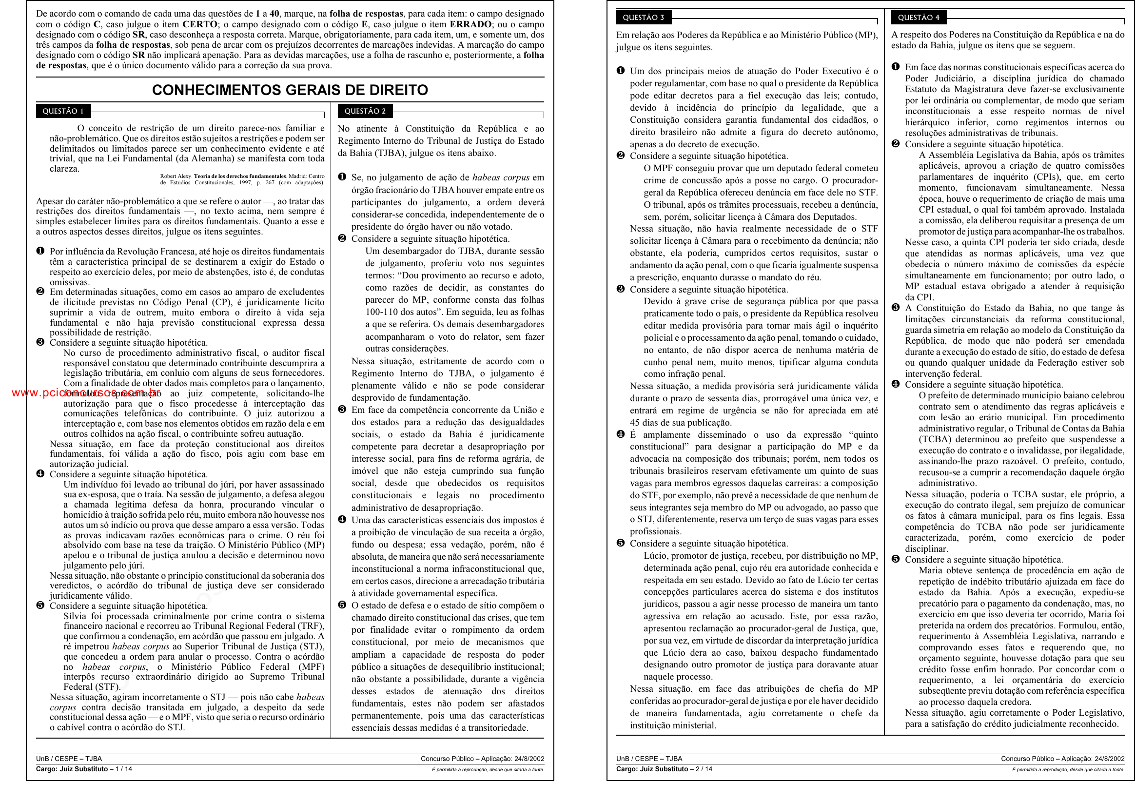 pcimarkpci MjgwNDowMDE4OjA4MDc6YThiNDoxNDQ3OmVjYjM6YjIzNTplZDAy:TW9uLCAwMiBEZWMgMjAyNCAyMzo1MTowMiAtMDMwMA== www.pciconcursos.com.br UnB / CESPE – TJBA Concurso Público – Aplicação: 24/8/2002 Cargo: Juiz Substituto – 1 / 14 É permitida a reprodução, desde que citada a fonte. De acordo com o comando de cada uma das questões de 1 a 40, marque, na folha de respostas, para cada item: o campo designado com o código C, caso julgue o item CERTO; o campo designado com o código E, caso julgue o item ERRADO; ou o campo designado com o código SR, caso desconheça a resposta correta. Marque, obrigatoriamente, para cada item, um, e somente um, dos três campos da folha de respostas, sob pena de arcar com os prejuízos decorrentes de marcações indevidas. A marcação do campo designado com o código SR não implicará apenação. Para as devidas marcações, use a folha de rascunho e, posteriormente, a folha de respostas, que é o único documento válido para a correção da sua prova. CONHECIMENTOS GERAIS DE DIREITO QUESTÃO 1 O conceito de restrição de um direito parece-nos familiar e não-problemático. Que os direitos estão sujeitos a restrições e podem ser delimitados ou limitados parece ser um conhecimento evidente e até trivial, que na Lei Fundamental (da Alemanha) se manifesta com toda clareza. Robert Alexy. Teoría de los derechos fundamentales. Madrid: Centro de Estudios Constitucionales, 1997, p. 267 (com adaptações). Apesar do caráter não-problemático a que se refere o autor —, ao tratar das restrições dos direitos fundamentais —, no texto acima, nem sempre é simples estabelecer limites para os direitos fundamentais. Quanto a esse e a outros aspectos desses direitos, julgue os itens seguintes. Ø Por influência da Revolução Francesa, até hoje os direitos fundamentais têm a característica principal de se destinarem a exigir do Estado o respeito ao exercício deles, por meio de abstenções, isto é, de condutas omissivas. Ù Em determinadas situações, como em casos ao amparo de excludentes de ilicitude previstas no Código Penal (CP), é juridicamente lícito suprimir a vida de outrem, muito embora o direito à vida seja fundamental e não haja previsão constitucional expressa dessa possibilidade de restrição. Ú Considere a seguinte situação hipotética. No curso de procedimento administrativo fiscal, o auditor fiscal responsável constatou que determinado contribuinte descumprira a legislação tributária, em conluio com alguns de seus fornecedores. Com a finalidade de obter dados mais completos para o lançamento, formulou representação ao juiz competente, solicitando-lhe autorização para que o fisco procedesse à interceptação das comunicações telefônicas do contribuinte. O juiz autorizou a interceptação e, com base nos elementos obtidos em razão dela e em outros colhidos na ação fiscal, o contribuinte sofreu autuação. Nessa situação, em face da proteção constitucional aos direitos fundamentais, foi válida a ação do fisco, pois agiu com base em autorização judicial. Û Considere a seguinte situação hipotética. Um indivíduo foi levado ao tribunal do júri, por haver assassinado sua ex-esposa, que o traía. Na sessão de julgamento, a defesa alegou a chamada legítima defesa da honra, procurando vincular o homicídio à traição sofrida pelo réu, muito embora não houvesse nos autos um só indício ou prova que desse amparo a essa versão. Todas as provas indicavam razões econômicas para o crime. O réu foi absolvido com base na tese da traição. O Ministério Público (MP) apelou e o tribunal de justiça anulou a decisão e determinou novo julgamento pelo júri. Nessa situação, não obstante o princípio constitucional da soberania dos veredictos, o acórdão do tribunal de justiça deve ser considerado juridicamente válido. Ü Considere a seguinte situação hipotética. Sílvia foi processada criminalmente por crime contra o sistema financeiro nacional e recorreu ao Tribunal Regional Federal (TRF), que confirmou a condenação, em acórdão que passou em julgado. A ré impetrou habeas corpus ao Superior Tribunal de Justiça (STJ), que concedeu a ordem para anular o processo. Contra o acórdão no habeas corpus, o Ministério Público Federal (MPF) interpôs recurso extraordinário dirigido ao Supremo Tribunal Federal (STF). Nessa situação, agiram incorretamente o STJ — pois não cabe habeas corpus contra decisão transitada em julgado, a despeito da sede constitucional dessa ação — e o MPF, visto que seria o recurso ordinário o cabível contra o acórdão do STJ. QUESTÃO 2 No atinente à Constituição da República e ao Regimento Interno do Tribunal de Justiça do Estado da Bahia (TJBA), julgue os itens abaixo. Ø Se, no julgamento de ação de habeas corpus em órgão fracionário do TJBA houver empate entre os participantes do julgamento, a ordem deverá considerar-se concedida, independentemente de o presidente do órgão haver ou não votado. Ù Considere a seguinte situação hipotética. Um desembargador do TJBA, durante sessão de julgamento, proferiu voto nos seguintes termos: “Dou provimento ao recurso e adoto, como razões de decidir, as constantes do parecer do MP, conforme consta das folhas 100-110 dos autos”. Em seguida, leu as folhas a que se referira. Os demais desembargadores acompanharam o voto do relator, sem fazer outras considerações. Nessa situação, estritamente de acordo com o Regimento Interno do TJBA, o julgamento é plenamente válido e não se pode considerar desprovido de fundamentação. Ú Em face da competência concorrente da União e dos estados para a redução das desigualdades sociais, o estado da Bahia é juridicamente competente para decretar a desapropriação por interesse social, para fins de reforma agrária, de imóvel que não esteja cumprindo sua função social, desde que obedecidos os requisitos constitucionais e legais no procedimento
