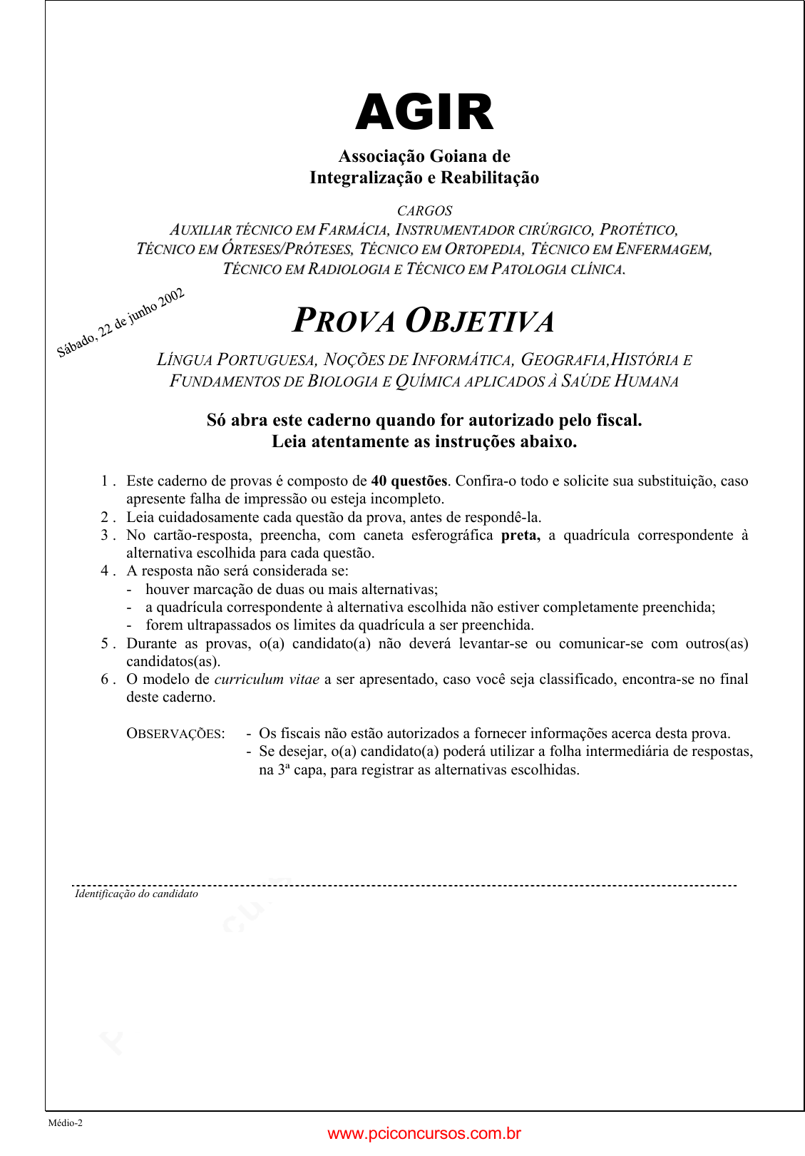 pcimarkpci MjgwNDowMDE4OjA4MDc6YThiNDoxNDQ3OmVjYjM6YjIzNTplZDAy:TW9uLCAwMiBEZWMgMjAyNCAyMzo0ODo0NSAtMDMwMA== www.pciconcursos.com.br AGIR Associação Goiana de Integralização e Reabilitação CARGOS AAUUXXIILLIIAARR TTÉÉCCNNIICCOO EEMM FFAARRMMÁÁCCIIAA,, IINNSSTTRRUUMMEENNTTAADDOORR CCIIRRÚÚRRGGIICCOO,, PPRROOTTÉÉTTIICCOO,, TTÉÉCCNNIICCOO EEMM ÓÓRRTTEESSEESS//PPRRÓÓTTEESSEESS,, TTÉÉCCNNIICCOO EEMM OORRTTOOPPEEDDIIAA,, TTÉÉCCNNIICCOO EEMM EENNFFEERRMMAAGGEEMM,, TTÉÉCCNNIICCOO EEMM RRAADDIIOOLLOOGGIIAA EE TTÉÉCCNNIICCOO EEMM PPAATTOOLLOOGGIIAA CCLLÍÍNNIICCAA.. 1 . 2 . 3 . 4 . 5 . 6 . PROVA OBJETIVA LÍNGUA PORTUGUESA, NOÇÕES DE INFORMÁTICA, GEOGRAFIA,HISTÓRIA E FUNDAMENTOS DE BIOLOGIA E QUÍMICA APLICADOS À SAÚDE HUMANA Só abra este caderno quando for autorizado pelo fiscal. Leia atentamente as instruções abaixo. Este caderno de provas é composto de 40 questões. Confira-o todo e solicite sua substituição, caso apresente falha de impressão ou esteja incompleto. Leia cuidadosamente cada questão da prova, antes de respondê-la. No cartão-resposta, preencha, com caneta esferográfica preta, a quadrícula correspondente à alternativa escolhida para cada questão. A resposta não será considerada se: - houver marcação de duas ou mais alternativas; - a quadrícula correspondente à alternativa escolhida não estiver completamente preenchida; - forem ultrapassados os limites da quadrícula a ser preenchida. Durante as provas, o(a) candidato(a) não deverá levantar-se ou comunicar-se com outros(as) candidatos(as). O modelo de curriculum vitae a ser apresentado, caso você seja classificado, encontra-se no final deste caderno. OBSERVAÇÕES: - Os fiscais não estão autorizados a fornecer informações acerca desta prova. - Se desejar, o(a) candidato(a) poderá utilizar a folha intermediária de respostas, na 3ª capa, para registrar as alternativas escolhidas. Identificação do candidato Médio-2 www.pciconcursos.com.br pcimarkpci MjgwNDowMDE4OjA4MDc6YThiNDoxNDQ3OmVjYjM6YjIzNTplZDAy:TW9uLCAwMiBEZWMgMjAyNCAyMzo0ODo0NSAtMDMwMA== www.pciconcursos.com.br 1 LÍNGUA PORTUGUESA O texto abaixo refere-se às questões de 1 a 5. FURTO DE FLOR Furtei uma flor daquele jardim. O porteiro do edifício cochilava e eu furtei a flor. Trouxe-a para casa e coloquei-a no copo com água. Logo senti que ela não estava feliz. O copo destina- se a beber, e flor não é para ser bebida. Passei-a para o vaso, e notei que ela me agradecia, revelando melhor sua delicada composição. Quantas novidades há numa flor, se a contemplarmos bem. Sendo autor do furto, eu assumira a obrigação de conservá-la. Renovei a água do vaso, mas a flor empalidecia. Temi por sua vida. Não adiantava restituí-la ao jardim. Nem apelar para o médico das flores. Eu a furtara, eu a via morrer. Já murcha, e com a cor particular da morte, peguei-a docemente e fui depositá-la no jardim onde desabrochara. O porteiro estava atento e repreendeu-me: – Que idéia a sua, vir jogar lixo de sua casa neste jardim! ANDRADE, Carlos Drummond de. Contos plausíveis. Rio de Janeiro: Record, 1991. Questão 1 Leia atentamente o texto e analise as proposições a seguir: I. É possível notar que o narrador-personagem experimenta, no decorrer do texto, diferentes estados de alma, após o furto da flor: alegria, a princípio; depois, tristeza, aborrecimento, arrependimento, compaixão e, por fim, raiva da repreensão do porteiro. II. O narrador-personagem, ao longo do texto, vai atribuindo características humanas à flor. É o que se pode perceber nas passagens: “ela não estava feliz”; “ela me agradecia”; “a flor empalidecia”. III. A atitude do porteiro, no final do texto, por ser puramente técnica e funcional – o porteiro apenas cumpre a sua função de zelar pelo edifício – , contrapõe-se ao envolvimento emocional que o narrador-personagem estabelece com a flor, à medida que conta a história. Assinale a alternativa CORRETA: a) Apenas as proposições I e II são verdadeiras. b) Apenas as proposições I e III são verdadeiras. c) Apenas as proposições II e III são verdadeiras. d) Apenas a proposição II é verdadeira. Questão 2 Assinale a alternativa que indica os referentes dos termos destacados a seguir: “Já murcha, e com a cor particular da morte, peguei-a docemente e fui depositá-la no jardim onde desabrochara. O porteiro estava atento e repreendeu-me”: a) a morte, a flor, o jardim, o porteiro. b) a flor, a morte, o jardim, o autor do furto da flor. c) a cor, a flor, o lixo, o narrador-personagem.. d) a flor, a flor, o jardim, o autor do furto da flor. Questão 3 Assinale a alternativa que NÃO expressa idéia de causa e efeito entre as ações: a) “Quantas novidades há numa flor, se a contemplarmos bem.” b) “O porteiro do edifício cochilava, e eu furtei a flor”. c) “Eu a furtara, eu a via morrer” d) “Passei-a para o vaso, e notei que ela me agradecia.” www.pciconcursos.com.br pcimarkpci MjgwNDowMDE4OjA4MDc6YThiNDoxNDQ3OmVjYjM6YjIzNTplZDAy:TW9uLCAwMiBEZWMgMjAyNCAyMzo0ODo0NSAtMDMwMA== www.pciconcursos.com.br 2 Questão 4 Furto define-se como o “ato de subtrair, para si ou para outrem, coisa alheia móvel”. No sentido jurídico, difere do roubo, porque não pressupõe o uso de violência ou de grave ameaça em relação à vítima. Com base nessas afirmações, assinale a alternativa CORRETA. A partir da análise do texto, percebe-se que o narrador-personagem a) confessa-se autor do furto da flor, mas procura amenizar o ato ilícito cometido, por meio de argumentos que o isentam de culpa. b) confessa-se autor de um furto – o furto da flor – e reforça a idéia de que cometeu um ato ilícito e de que se sente culpado por isso. c) nega a autoria do furto, à medida que usa de todos os meios para salvar a flor da morte. d) confessa-se autor de um roubo, arrepende-se do ato ilícito e entrega-se ao porteiro para ser punido por ele. Questão 5 O sentido