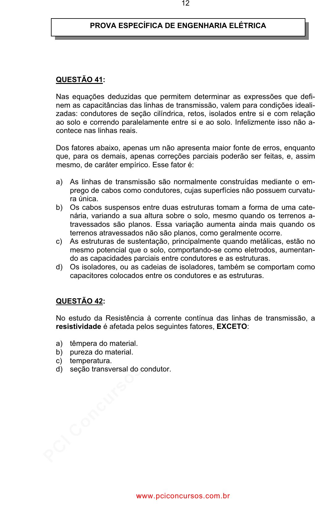 pcimarkpci MjgwNDowMDE4OjA4MDc6YThiNDoxNDQ3OmVjYjM6YjIzNTplZDAy:TW9uLCAwMiBEZWMgMjAyNCAyMzozNTowNiAtMDMwMA== www.pciconcursos.com.br 12 QUESTÃO 41: Nas equações deduzidas que permitem determinar as expressões que defi- nem as capacitâncias das linhas de transmissão, valem para condições ideali- zadas: condutores de seção cilíndrica, retos, isolados entre si e com relação ao solo e correndo paralelamente entre si e ao solo. Infelizmente isso não a- contece nas linhas reais. Dos fatores abaixo, apenas um não apresenta maior fonte de erros, enquanto que, para os demais, apenas correções parciais poderão ser feitas, e, assim mesmo, de caráter empírico. Esse fator é: a) As linhas de transmissão são normalmente construídas mediante o em- prego de cabos como condutores, cujas superfícies não possuem curvatu- ra única. b) Os cabos suspensos entre duas estruturas tomam a forma de uma cate- nária, variando a sua altura sobre o solo, mesmo quando os terrenos a- travessados são planos. Essa variação aumenta ainda mais quando os terrenos atravessados não são planos, como geralmente ocorre. c) As estruturas de sustentação, principalmente quando metálicas, estão no mesmo potencial que o solo, comportando-se como eletrodos, aumentan- do as capacidades parciais entre condutores e as estruturas. d) Os isoladores, ou as cadeias de isoladores, também se comportam como capacitores colocados entre os condutores e as estruturas. QUESTÃO 42: No estudo da Resistência à corrente contínua das linhas de transmissão, a resistividade é afetada pelos seguintes fatores, EXCETO: a) têmpera do material. b) pureza do material. c) temperatura. d) seção transversal do condutor. PROVA ESPECÍFICA DE ENGENHARIA ELÉTRICA wwww.pciconcursos.com.br pcimarkpci MjgwNDowMDE4OjA4MDc6YThiNDoxNDQ3OmVjYjM6YjIzNTplZDAy:TW9uLCAwMiBEZWMgMjAyNCAyMzozNTowNiAtMDMwMA== www.pciconcursos.com.br 13 QUESTÃO 43: São manifestações do efeito corona que apresentam maiores preocupações nos projetos das linhas de transmissão, EXCETO: a) radiointerferência. b) ruídos auditivos. c) harmônicas ímpares. d) perdas de energia. QUESTÃO 44: Segundo o OLLE ELGERD, “Uma máquina síncrona é uma caixa preta com duas entradas e quatro saídas.” São saídas dessa caixa preta, EXCETO: a) tensão. b) potência ativa. c) potência reativa. d) corrente de armadura. QUESTÃO 45: Um gerador síncrono superexcitado trabalha: a) fornecendo potência ativa e potência reativa indutiva. b) fornecendo potência ativa e potência reativa capacitiva. c) consumindo potência ativa e potência reativa indutiva. d) consumindo potência ativa e potência reativa capacitiva. QUESTÃO 46: Um transformador com tensões típicas de 345/500 KV, que é usado para a transformação de potência entre os diferentes níveis de tensão do sistema, é definido como sendo transformador de: a) geração. b) transmissão. c) regulação. d) isolamento. wwww.pciconcursos.com.br pcimarkpci MjgwNDowMDE4OjA4MDc6YThiNDoxNDQ3OmVjYjM6YjIzNTplZDAy:TW9uLCAwMiBEZWMgMjAyNCAyMzozNTowNiAtMDMwMA== www.pciconcursos.com.br 14 QUESTÃO 47: Nos modelamentos e análise de fluxo de carga em sistemas de energia em regime permanente, podemos dividir o funcionamento global do sistema nas subáreas abaixo, EXCETO: a) Modelos de sistemas e análise do fluxo de carga. b) Desenvolvimento de estratégia ótima de geração. c) Controle de sistemas. d) Análise subtransitória. QUESTÃO 48: No modelamento de sistemas, a sigla EEFC significa: a) Energia Elétrica de Freqüência e Controle. b) Estudo Estatístico Físico de Consumo. c) Equações Estáticas de Fluxo de Carga. d) Envoltória Escalar de Faraday-Coulomb QUESTÃO 49: Em terminologia de redes, são nomenclaturas usuais, EXCETO: a) Ramo b) FET c) Fontes de tensão e de corrente d) Barra QUESTÃO 50: Nos aspectos computacionais do problema do fluxo de carga, são exigências necessárias que devem ser atendidas por quaisquer técnicas de cálculo que venhamos a propor, EXCETO: a) Devem permitir o manejo de equações algébricas não lineares. b) Devem permitir o manejo de sistemas tendo, talvez, centenas de barras. c) Devem ser suficientemente precisas. d) Devem consumir muito tempo, posto que deveremos realizar muitas sé- ries de cálculos com várias combinações e especificações de potência e tensão de barra. wwww.pciconcursos.com.br pcimarkpci MjgwNDowMDE4OjA4MDc6YThiNDoxNDQ3OmVjYjM6YjIzNTplZDAy:TW9uLCAwMiBEZWMgMjAyNCAyMzozNTowNiAtMDMwMA== www.pciconcursos.com.br 15 QUESTÃO 51: Um amplificador alimentado por um sinal senoidal de “5 mV” de pico entrega na saída uma onda senoidal de “1 V” de pico em uma resistência de carga de “2 k ”. A corrente de entrada no amplificador é senoidal com “5 A” de pico. Assinale o ganho de potência dada pela razão e em dB. a) 2x104 W/W , 43 dB b) 2x104 W/W , 46 dB c) 4x104 W/W , 49 dB d) 2x104 W/W , 52 dB QUESTÃO 52: O circuito da figura abaixo usa um amplificador operacional ideal, exceto quanto ao seu ganho “A”, que é finito.Os instrumentos indicam Vo = 3,5 V e Vi = 3,5 mV. Qual é o valor do ganho “A”? a) 1010 V/V b) 1050 V/V c) 1020 V/V d) 1001 V/V + - 1 M 1 k Vi + - Vo + - 1 M 1 k Vi + - Vi + - Vo wwww.pciconcursos.com.br pcimarkpci MjgwNDowMDE4OjA4MDc6YThiNDoxNDQ3OmVjYjM6YjIzNTplZDAy:TW9uLCAwMiBEZWMgMjAyNCAyMzozNTowNiAtMDMwMA== www.pciconcursos.com.br 16 QUESTÃO 53: Um amplificador inversor com a topologia mostrada abaixo usa um amplifica- dor operacional ideal com R1 = 33 k e R2 = 330 k . Qual é o seu ganho em malha fechada? a) –20 V/V b) –10 V/V c) –200 V/V d) –100 V/V QUESTÃO 54: O amplificador abaixo tem ganho em malha aberta de 100.000. Caso Vi = 1 mV, qual seria aproximadamente a sua tensão de saída? a) 100 mV b) 50 mV c) 25 mV d) 10 mV + - 98 k Vi + - Vo + 15V - 15V 2 k + - 98 k Vi + - Vi + - Vo + 15V - 15V 2 k - + Vi + - + Vcc - Vcc R1 R2 Vo - + Vi + - + Vcc - Vcc R1 R2 Vo wwww.pciconcursos.com.br pcima