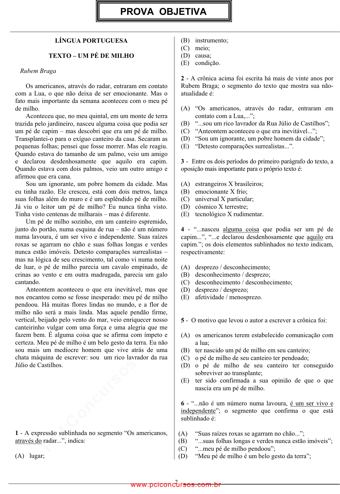 pcimarkpci MjgwNDowMDE4OjAwZjY6ZDM0YzoxNDQ3OmVjYjM6YjIzNTplZDAy:VHVlLCAwMyBEZWMgMjAyNCAwNDoxMDo1NyAtMDMwMA== www.pciconcursos.com.br2 PROVA OBJETIVA LÍNGUA PORTUGUESA TEXTO – UM PÉ DE MILHO Rubem Braga Os americanos, através do radar, entraram em contato com a Lua, o que não deixa de ser emocionante. Mas o fato mais importante da semana aconteceu com o meu pé de milho. Aconteceu que, no meu quintal, em um monte de terra trazida pelo jardineiro, nasceu alguma coisa que podia ser um pé de capim – mas descobri que era um pé de milho. Transplantei-o para o exíguo canteiro da casa. Secaram as pequenas folhas; pensei que fosse morrer. Mas ele reagiu. Quando estava do tamanho de um palmo, veio um amigo e declarou desdenhosamente que aquilo era capim. Quando estava com dois palmos, veio um outro amigo e afirmou que era cana. Sou um ignorante, um pobre homem da cidade. Mas eu tinha razão. Ele cresceu, está com dois metros, lança suas folhas além do muro e é um esplêndido pé de milho. Já viu o leitor um pé de milho? Eu nunca tinha visto. Tinha visto centenas de milharais – mas é diferente. Um pé de milho sozinho, em um canteiro espremido, junto do portão, numa esquina de rua – não é um número numa lavoura, é um ser vivo e independente. Suas raízes roxas se agarram no chão e suas folhas longas e verdes nunca estão imóveis. Detesto comparações surrealistas – mas na lógica de seu crescimento, tal como vi numa noite de luar, o pé de milho parecia um cavalo empinado, de crinas ao vento e em outra madrugada, parecia um galo cantando. Anteontem aconteceu o que era inevitável, mas que nos encantou como se fosse inesperado: meu pé de milho pendoou. Há muitas flores lindas no mundo, e a flor de milho não será a mais linda. Mas aquele pendão firme, vertical, beijado pelo vento do mar, veio enriquecer nosso canteirinho vulgar com uma força e uma alegria que me fazem bem. É alguma coisa que se afirma com ímpeto e certeza. Meu pé de milho é um belo gesto da terra. Eu não sou mais um medíocre homem que vive atrás de uma chata máquina de escrever: sou um rico lavrador da rua Júlio de Castilhos. 1 - A expressão sublinhada no segmento “Os americanos, através do radar...”, indica: (A) lugar; (B) instrumento; (C) meio; (D) causa; (E) condição. 2 - A crônica acima foi escrita há mais de vinte anos por Rubem Braga; o segmento do texto que mostra sua não- atualidade é: (A) “Os americanos, através do radar, entraram em contato com a Lua,...”; (B) “...sou um rico lavrador da Rua Júlio de Castilhos”; (C) “Anteontem aconteceu o que era inevitável...”; (D) “Sou um ignorante, um pobre homem da cidade”; (E) “Detesto comparações surrealistas...”. 3 - Entre os dois períodos do primeiro parágrafo do texto, a oposição mais importante para o próprio texto é: (A) estrangeiros X brasileiros; (B) emocionante X frio; (C) universal X particular; (D) cósmico X terrestre; (E) tecnológico X rudimentar. 4 - “...nasceu alguma coisa que podia ser um pé de capim...”, “...e declarou desdenhosamente que aquilo era capim.”; os dois elementos sublinhados no texto indicam, respectivamente: (A) desprezo / desconhecimento; (B) desconhecimento / desprezo; (C) desconhecimento / desconhecimento; (D) desprezo / desprezo; (E) afetividade / menosprezo. 5 - O motivo que levou o autor a escrever a crônica foi: (A) os americanos terem estabelecido comunicação com a lua; (B) ter nascido um pé de milho em seu canteiro; (C) o pé de milho de seu canteiro ter pendoado; (D) o pé de milho de seu canteiro ter conseguido sobreviver ao transplante; (E) ter sido confirmada a sua opinião de que o que nascia era um pé de milho. 6 - “...não é um número numa lavoura, é um ser vivo e independente”; o segmento que confirma o que está sublinhado é: (A) “Suas raízes roxas se agarram no chão...”; (B) “...suas folhas longas e verdes nunca estão imóveis”; (C) “...meu pé de milho pendoou”; (D) “Meu pé de milho é um belo gesto da terra”; www.pciconcursos.com.br pcimarkpci MjgwNDowMDE4OjAwZjY6ZDM0YzoxNDQ3OmVjYjM6YjIzNTplZDAy:VHVlLCAwMyBEZWMgMjAyNCAwNDoxMDo1NyAtMDMwMA== www.pciconcursos.com.br3 PROVA OBJETIVA (E) “...afirmou que era cana”. 7 - Considerando o segundo e o terceiro parágrafos do texto, o segmento que pode ser considerado uma interrupção da narrativa é: (A) “Quando estava com dois palmos, veio outro amigo e afirmou que era cana”; (B) “-mas descobri que era um pé de milho”; (C) “Mas ele reagiu”; (D) “Sou um ignorante, um pobre homem da cidade”; (E) “Ele cresceu, está com dois metros...”. 8 - A substituição correta do termo sublinhado por um sinônimo está em: (A) “Transplantei-o para o exíguo canteiro...” = raso; (B) “...e declarou desdenhosamente que aquilo era capim” = depreciativamente; (C) “...veio enriquecer o nosso canteirinho vulgar...” = popular; (D) “Anteontem aconteceu o que era inevitável...” = imprevisível; (E) “...que se afirma com ímpeto e certeza” = velocidade. 9 - A substituição da expressão sublinhada por um só termo é INADEQUADA em: (A) “Sou um ignorante, um pobre homem da cidade” = urbano; (B) “...tal como vi numa noite de luar...” = enluarada; (C) “...beijado pelo vento do mar...” = marinho; (D) “...exíguo canteiro da casa.” = doméstico; (E) “...é um belo gesto da terra.” = terrestre. 10 - Em todos os segmentos abaixo há um sintagma construído por um substantivo + adjetivo (ou vice-versa); o sintagma em que a troca de posições entre esses vocábulos pode trazer mudança de sentido é: (A) “Transplantei-o para o exíguo canteiro da casa”; (B) “Secaram as pequenas folhas”; (C) “Sou um ignorante, um pobre homem da cidade”; (D) “...e é um esplêndido pé de milho”; (E) “...em um canteiro espremido...”. 11 - “Detesto comparações surrealistas...”; apesar disso, o autor do texto faz uma dessas co