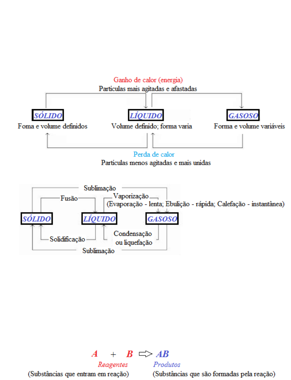 Transformações da matéria (Modificações que a matéria pode sofrer) Transformações físicas ou fenômenos físicos: A substância que constitui a matéria não passa por transformação alguma. Sendo assim, sua forma, tamanho, aparência podem mudar, mas não sua composição (passageiras e reversíveis). Estados físicos da matéria: Mudanças de estado físico da matéria: Transformações químicas ou fenômenos químicos: A composição da matéria passa por mudanças, ou seja, uma ou mais substâncias alteram-se, dando origem a compostos diferentes – Alteração na cor, surgimento de chama ou luminosidade, liberação de gás (profundas e irreversíveis). Moléculas iniciais são “desmontadas” e seus átomos são aproveitados para “montar” as moléculas finais. Equação química: É a forma de se descrever uma reação química. Coeficiente: Indica a proporção de moléculas que participam da reação. Balanceamento das equações químicas: Iguala o número total de átomos de cada elemento no 1º (reagentes) e no 2º (produtos) membros da equação. Classificação das reações químicas: Síntese ou adição: Duas ou mais substâncias reagem para se transformar em uma. Análise ou decomposição: Uma substância se divide em duas ou mais substâncias. Simples troca ou deslocamento: Uma substância simples troca de lugar com um elemento de uma substância composta. Dupla troca ou permutação: Duas substâncias compostas reagem e trocam seus elementos, produzindo duas novas substâncias compostas.