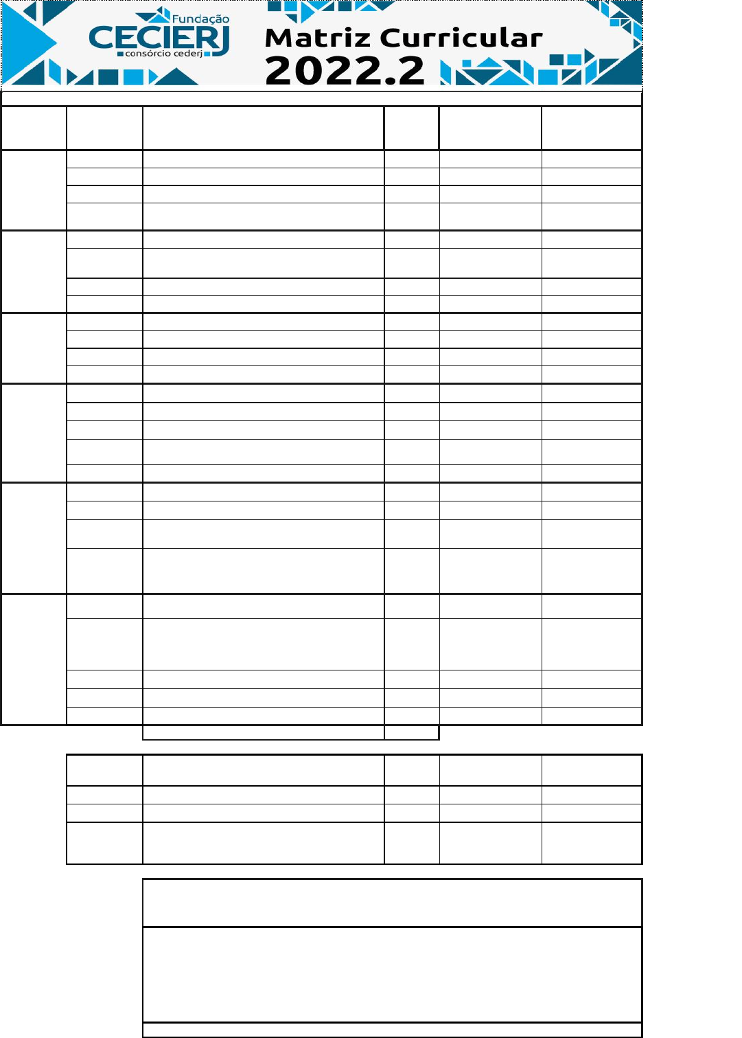 CURSO DE TECNOLOGIA EM SISTEMAS DE COMPUTAÇÃO 2022-2 UFF Períodos Códigos Disciplina Carga horária Pré-requisito Univer Resp pela Disciplina 1º EAD05001 Introdução à Informática 80 não tem UFRJ EAD05002 Construção de Página Web 40 não tem UFF/UFRJ EAD05003 Inglês Instrumental 40 não tem UFF EAD05005 Projeto e Desenvolvimento de Algoritmos 80 não tem UFRJ 2º EAD05006 Álgebra Linear 80 não tem UFRJ EAD05004 Fundamentos de Algoritmos para Computação 80 não tem UFRJ EAD05010 Organização de Computadores 80 Intr Inform UFF/UFRJ EAD05029 Fundamentos de Programação 80 PDA UFF 3º EAD05007 Estrutura de Dados 80 PDA UFF EAD05008 Matemática para Computação 80 FAC UFF EAD05015 Física para Computação 80 não tem UFF EAD05030 Programação com Interfaces Gráficas 80 Fund Prog UFRJ 4º EAD05014 Banco de Dados 80 Estr Dados UFF/UFRJ EAD05011 Modelagem de Informação 80 não tem UFRJ EAD05012 Probabilidade e Estatística 80 Mat. Comp. UFF EAD05016 Sistemas Operacionais 80 Org Comput. e Estr. Dados UFRJ EAD05032 Programação Orientada a Objetos 80 Fund. Prog. UFF 5º EAD05033 Análise de Sistemas 80 Banco Dados UFF/UFRJ EAD05019 Engenharia de Software 80 Mod. de Inf. UFRJ EAD05020 Redes de Computadores I 120 Sist Operac. e Fís. Comp. UFF EAD05031 Programação de Aplicações Web 80 Fund. de Programação e Banco de Dados UFF/UFRJ 6º EAD05034 Arquitetura e Projeto de Sistemas 80 Análise de Sistemas UFF EAD05023 Computação Gráfica 80 Álgebra Linear e Programação com Interfaces Gráficas UFF EAD05024 Empreendedorismo e Ética Profissional 80 não tem UFF / UFRJ EAD05025 Redes de Computadores II 120 Redes Comp I UFRJ EAD05026 Trabalho de Conclusão de Curso 120 1280H cursadas UFF / UFRJ CARGA HORÁRIA TOTAL 2.120 EAD05027 Estágio Supervisionado (não obrigatório) Atender às regras do Curso UFF EAD01038 Matemática Básica (*) 60 não tem UFF EAD00031 Linguagem Brasileira de Sinais (**) 60 não tem UFF EAD05035 "Desafios de Programação" (**) 80 correquisito; Fundamentos de Programação UFF Estágio: Serão autorizados estágios de alunos que atenderem às regras descritas em "Regras para Autorização de Estágio dos Alunos do Curso de Tecnologia em Sistemas de Computação" (*) A disciplina Matemática Básica é oferecida para os calouros conforme a sua nota no Vestibular/ENEM. Os alunos que tiverem acertado no Vestibular menos de 3 questões das 8 possíveis na prova de múltipla escolha de Matemática, deverão cursar a disciplina Matemática Básica. A inscrição é recomendada a todos os alunos que precisam rever conceitos básicos de matemática. A disciplina é eletiva. Se o aluno ficar reprovado, ele pode optar se quer se inscrever novamente ou não. (**) Disciplina Eletiva.