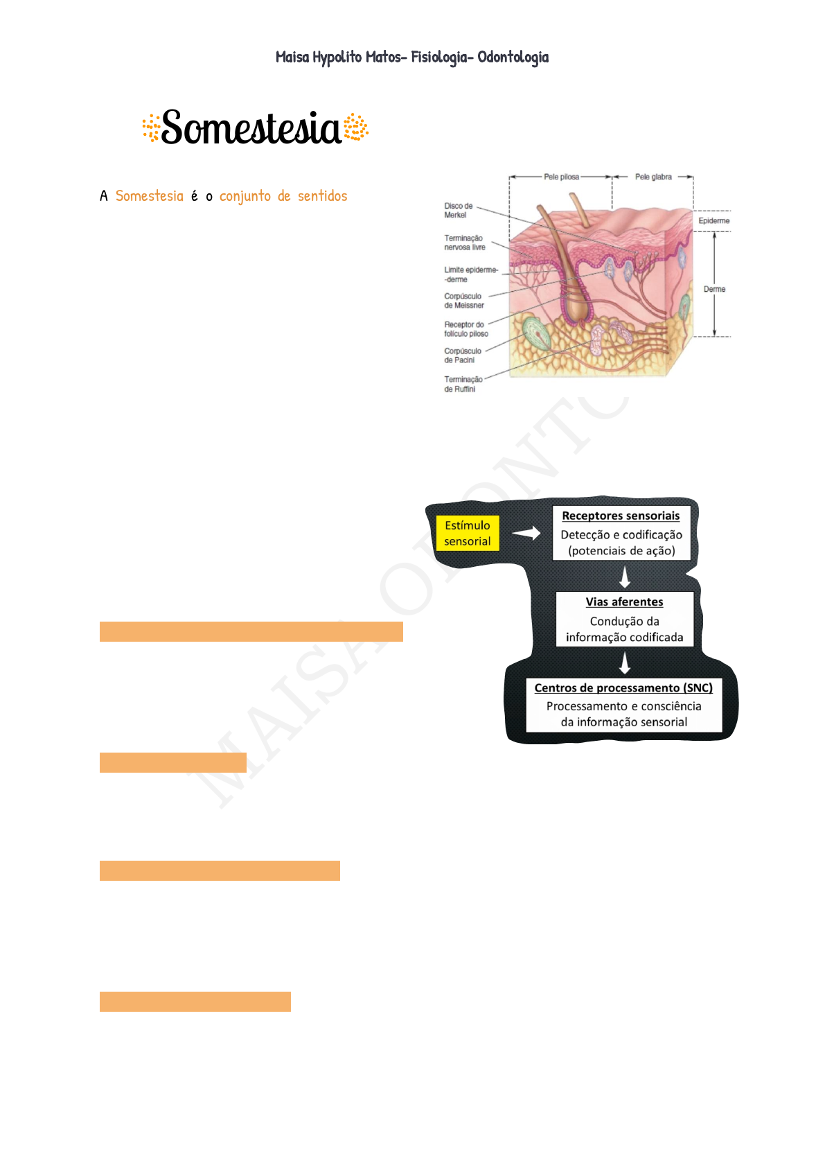 MAIS A O DONTO Maisa Hypolito Matos- Fisiologia- Odontologia Somestesi� A Somestesia é o conjunto de sentidos que nos permite perceber estímulos físicos e químicos em nosso corpo. Ela inclui a sensação tátil, a percepção da dor, a temperatura e a propriocepção (sensação de posição e movimento do corpo). Os receptores sensoriais envolvidos na somestesia são distribuídos pela pele, músculos, articulações e órgãos internos, permitindo a detecção de uma ampla variedade de estímulos. Estímul� Sensoriai� Os estímulos sensoriais são qualquer tipo de informação que o nosso corpo recebe do ambiente externo ou interno, ativando nossos sentidos. Eles podem ser divididos em diferentes tipos de acordo com o tipo de sensação que provocam: →Estímulos Mecânicos (Mecanorreceptores)= São aqueles que provocam sensações de toque, pressão ou vibração. Eles são detectados pelos receptores mecânicos da pele, como os corpúsculos de Meissner e de Pacini. →Estímulos Térmicos= Envolvem a sensação de calor e frio, e são captados por receptores especí�cos na pele chamados termorreceptores, que detectam mudanças de temperatura. →Estímulos Dolorosos (Nociceptivos)= Estes são os estímulos que causam dor, como uma lesão ou um calor intenso. São detectados pelos nociceptores, que sinalizam quando o corpo está em perigo. →Estímulos Proprioceptivos= Relacionados ao movimento e à posição do corpo, são captados por receptores localizados nos músculos, tendões e articulações, ajudando a manter o equilíbrio e a coordenação. Para �car mais fácil de entender, os estímulos sensoriais funciona da seguinte maneira: Receptore� Sensoriai� São células neurais (neurônios) ou não-neurais (outro tipo celular) especializadas em detectar e transformar estímulos físicos ou químicos em sinais elétricos . Os Receptores Neurais são basicamente terminações nervosas de neurônios sensoriais que podem ser livres e eles são pseudopolares como mostra abaixo: MAIS A O DONTO Maisa Hypolito Matos- Fisiologia- Odontologia Esses estímulos ativam proteínas receptores presentes na membrana das terminações nervosas livres, oque resulta em abertura ou fechamento de canais iônicos especí�cos iniciando um sinal elétrico pois modi�cam o potencial de membrana causando a onda de despolarização ou de hiperpolarização, e essas ondas são chamadas de potenciais receptores. Os Receptores Não-Neurais são células especializadas em detectar certos tipos de estímulos sensoriais, como mostra baixo: Transduçã� Sensoria� Transforma os estímulos físicos e químicos em sinais elétricos (potenciais receptores). Por exemplo, os Mecanoreceptores, tem canais iônicos com portão que quando pressionados eles abrem e se chamam canais de membrana e ou canais mecânicos, então quando a pele é pressionada eles se abrem eles permitem a entrada de Na+ (sódio), assim causando uma onda de despolarização, um potencial receptor! MAIS A O DONTO Maisa Hypolito Matos- Fisiologia- Odontologia É importante destacar que, toda transdução vai envolver a abertura ou fechamento de canais iônicos, assim resultando em uma onda de despolarização ou uma onda de hiperpolarização, que são os potenciais receptores. Sensaçõe� d� Corp� Referência� *Slides da Aula; *Video:https://youtu.be/-M3odx7EKn8?si=6rrbAB Rvx1CVul1_. https://youtu.be/-M3odx7EKn8?si=6rrbABRvx1CVul1_ https://youtu.be/-M3odx7EKn8?si=6rrbABRvx1CVul1_