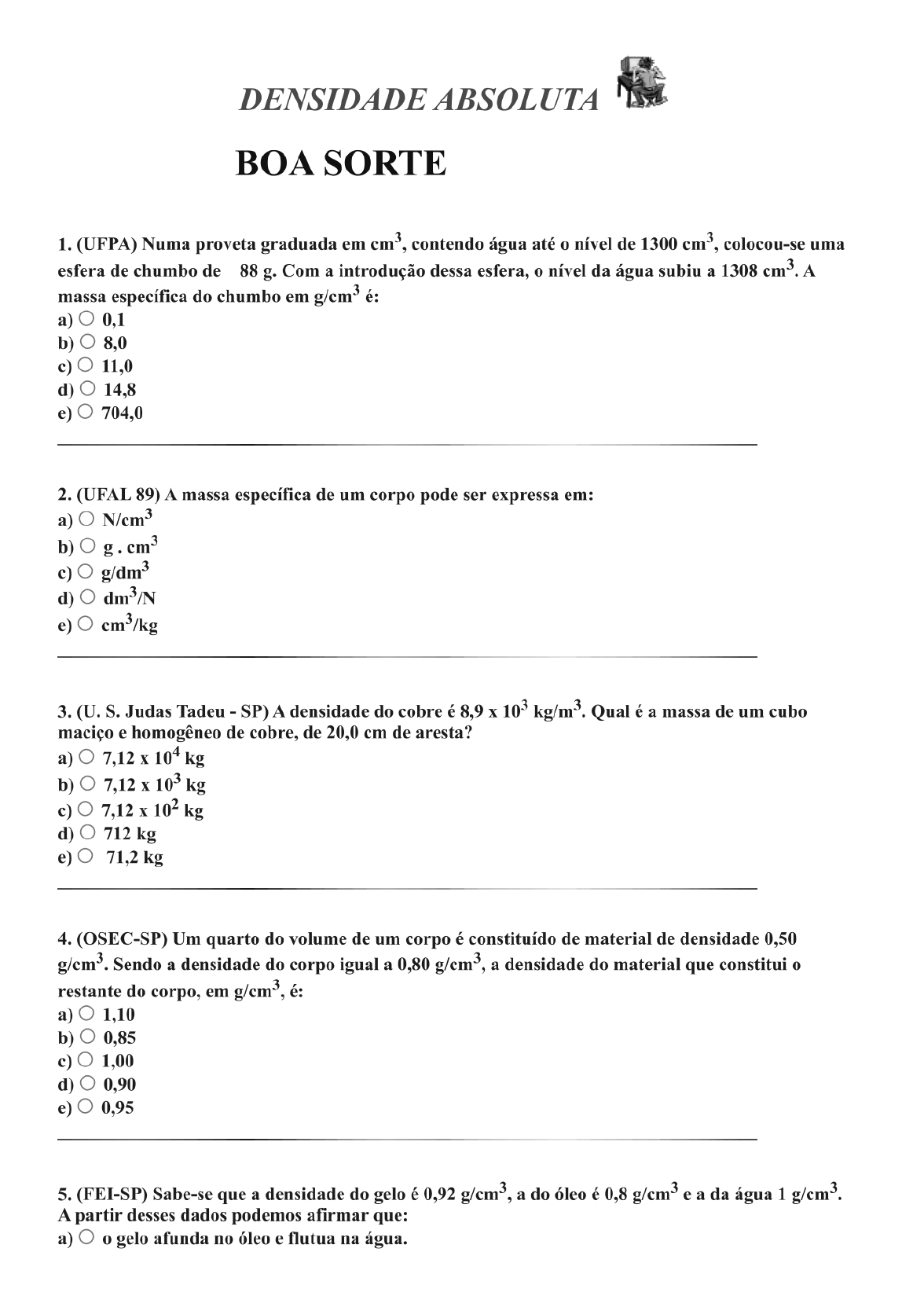 DENSIDADE ABSOLUTA & BOA SORTE 3 1. (UFPA) Numa proveta graduada em em”, contendo água até o nivel de 1300 cms, colocou-se uma esfera de chumbo de 88 g. Com a introdução dessa esfera, o nível da água subiu a 1308 em?. A massa específica do chumbo em g/emº é: a) O 0,1 b) O 8,0 0) O 11,0 d) O 14,8 e) O 704,0 2. (UFAL 89) A massa especifica de um corpo pode ser expressa em: a) O N/em® b) O g.cm? ¢ O gamº? d) O dmº/N ¢) O em’/kg 3. (U. S. Judas Tadeu - SP) A densidade do cobre é 8,9 x 103 kg/m3. Qual é a massa de um cubo maciço e homogéneo de cobre, de 20,0 cm de aresta? a) O 7,12 x 10º kg b) O 7,12 x 10> kg 0) O 7,12x 10 kg d) O 712 kg e)O 71,2 kg 4. (OSEC-SP) Um quarto do volume de um corpo é constituido de material de densidade 0,50 g/cm3. Sendo a densidade do corpo igual a 0,80 gcmª, a densidade do material que constitui o restante do corpo, em g/cmª, é: a) O 1,10 b) O 0,85 ¢) O 1,00 d) O 0,90 e) O 0,95 5. (FEI-SP) Sabe-se que a densidade do gelo é 0,92 g/cm3, a do óleo é 0,8 g/cm3 eadaagual g/cmª. A partir desses dados podemos afirmar que: a) O o gelo afunda no óleo e flutua na água. b) O o gelo flutua no óleo e na água. ¢) O o gelo flutua no óleo e afunda na água. d) O o óleo flutua sobre a água e o gelo flutua sobre o óleo. ¢) O a dgua flutua sobre o gelo e afunda sobre o óleo. 6. (Uneb-BA) Com uma massa M de ferro, Cuba densidade absoluta (massa especifica) é 7,85 g/cm3, constroi-se uma esfera oca de volume V. Sobre a densidade dessa esfera é correto afirmar que: a) O é igual a 7,85 g/em?. b) O é menor que 7,85 g/em>. ¢) O é maior que 7,85 g/em?. d) O pode ser maior ou igual a 7,85 g/cmª, dependendo dos valore de Me V. e) O pode ser maior ou menor que 7,85 g/cm3, dependendo dos valore de M e V. 7. (UFCE) A massa de 1 litro de leite integral ¢ 1 032 g. A nata que ocupa 4 % do volume, tem massa especifica de 0,865 g/cm3. Podemos concluir que a massa especifica do leite desnatada é: a) O 0,875 g/em>. b) O 0,910 g/em?>. ¢) O 1,04 g/em®. d) O 1,06 g/em®. e) O n.d.a. 8. (U. F. de Uberlandia-MG) Uma peca de museu, macica, contém uma mistura de ouro (p =20 g/cm3 ) e uma outra substincia S, Cuba massa especifica é 10 g/cmª. Sabe-se que a peça tem massa 3 kg e seu volume é igual a 250 emº. A massa da substância S encontrada na mistura é: a) O 0,5 kg b) O 1,0 kg ¢) O 1,5kg d) O 2,0 kg ¢) O 2,5 kg 9. (PUC-PR) Um trabalho publicado em revista cientifica informou que todo o ouro extraido pelo homem, até os dias de hoje, seria suficiente para encher um cubo de aresta igual a 20 m. Sabendo que a massa especifica do ouro é de, aproximadamente, 20 g/cmª, podemos concluir que a massa total do ouro extraído pelo homem, até agora, é de aproximadamente: a) O 1,6' 10º kg b) O 4,0 105 kg ¢) O 8000 t d) O 2,0* 10º kg ¢) O 20 milhões de toneladas. 10. Um cristal de quartzo de forma irregular tem massa de 42,5 g. Quando submerso em água num tubo de ensaio de raio 1,5 cm, o nivel da água sobe de 2,26 cm. A densidade do cristal, em kg/mª, é: a) O 2,66 b) O 26,6 0) O 2,66.10% d) O 2,66 . 103 ) O 2,66. 10º 11. (ITA-SP) Um anel, que parece ser de ouro maciço, tem massa de 28,5 g. O anel desloca 3 em? de agua quando submerso. Considere as seguintes afirmacdes: I- O anel é de ouro macico. II - O anel é oco e o volume da cavidade é 1,5 em?. 1N - O anel é oco e o volume da cavidade é 3,0 cm?. IV - O anel é feito de material cuja massa especifica é a metade da do ouro. Das afirmativas mencionadas: (dado: massa específica do ouro = 19 g/cm3). a) O apenas I é falsa. b) O apenas III é falsa. ¢) O IeIll são falsas. d) O I eV são falsas. e) O qualquer uma pode ser correta. 12. (ITA-SP) Tem-se duas solu¢des de um mesmo sal. A massa especifica da primeira é 1,7 g . em e a da segunda 1,2g. em?. Deseja-se fazer um 1 litro de solução de massa especifica 1,4g . em?. Devemos tomar de cada uma das soluções originais: a) O 0,50 litro e 0,50 litro. b) O 0,52 litro da primeira e 0,48 litro da segunda. ¢) O 0,48 litro da primeira e 0,52 litro da segunda. d) O 0,40 litro da primeira e 0,60 litro da segunda. e) O 0,60 litro da primeira e 0,40 litro da segunda. 13. (Fesp-SP) Um cubo oco de aluminio apresenta 100 g de massa e volume de 50 em?. O volume da parte vazia é 10 cm?. A densidade do cubo e a massa especifica do aluminio são respectivamente: a) O 0,5 g/em® e 0,4 g/em®. b) O 2,5 g/em® e 2,0 g/em®. ¢) O 0,4 g/em® e 0,5 g/em®. d) O 2,0 gremô e 2,5 g/em?. ¢) O 2,0 g/em® e 10,0 g/em?. 14. (FCC-BA) Um cubo macigo. De aresta igual a 10 cm, tem massa igual a 10 kg. Qual é, em g/cm3 a densidade absoluta do material de que é feito esse cubo? a)O 1,0 b) O 2,0 90 30 3O 1,0 , O 5,0 15. (UFRS) Um estudante tem um bastão de alumínio de 25 cm de comprimento cuja massa é igual a 300 g e um bastão de cobre , de mesmo diâmetro e comprimento, cuja massa é de 996 g. Desses bastões, ele corta uma peça de 100 g de alumínio e uma peça de cobre com exatamente o mesmo comprimento. Qual é a massa da peça de cobre? a) O 100 g b) O 250g ¢)O 300 g d) O 332g e)O 498g 16. (PUC-SP) Misturam-se dois líquidos A e B. O líquido A possui volume de 120 em e densidade 0,78 g/cmª. O líquido B possui volume de 200 cm” e densidade 0,56 g/cm3. A densidade da mistura, em g/cm3, é: a) O 0,64 b) O 0,67 ¢) O 0,70 d) O 1,34 e) O n.d.a. 17. (U.E. Londrina — PR) Dois blocos maci¢os de aluminio são tais que as dimensdes de um deles correspondem a exatamente trés vezes as dimensdes homoélogas do outro. A razio entre as massas dos blocos maior e menor é: 2)O 3 DO 6 oOoOss 0O 18 e) O 27 18. (FUC-MT) Um tambor cheio de gasolina ( 1u = 0,70 g/cm3 ) tem drea da base A=0,75m2 e altura h = 2,0 m. Qual é a massa de gasolina contida contida no tambor? a) O 1,05 kg b) O 1,05.10% kg 0) O 0,375 kg d) O 0,375.10% kg ¢) O 0,21 . 10º kg 19. (Mackenzie-SP) Um certo corpo apresenta a densidade 2,0 . 10 gramas / litro. Em unidades do S1, essa densidade é: 