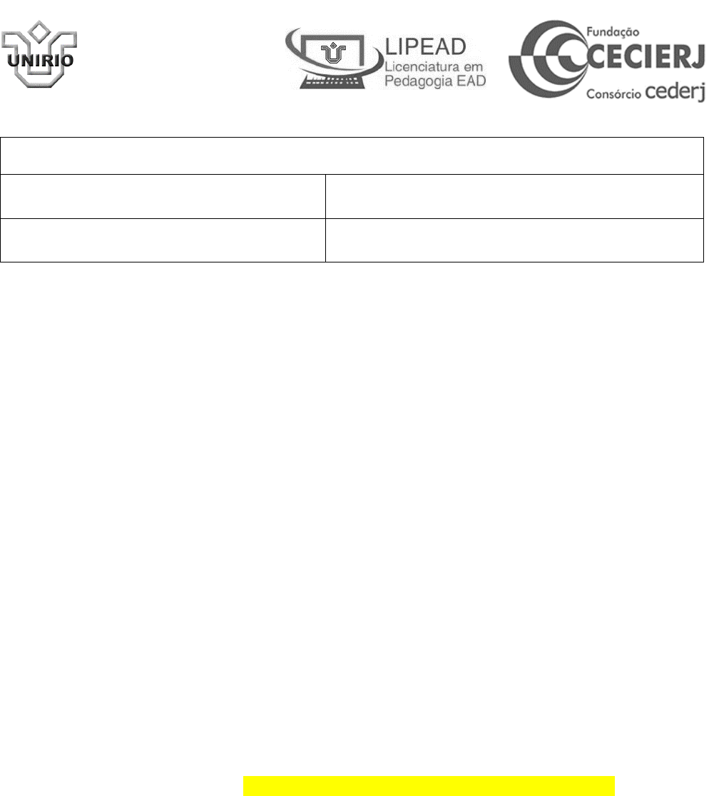 Nome: Matrícula: Email: Polo: Cidade em que reside: AD1 – 2024.2 DISCIPLINA: HISTÓRIA DA EDUCAÇÃO Coordenador: Prof. Vinicius de Moraes Monção Tutor(a) presencial: __________________________________ Caro(a) aluno(a): Essa é a sua Primeira Avaliação a Distância (AD1) da disciplina História da Educação. Leia atentamente as instruções abaixo: Orientações: 1) A AD1 deverá ser enviada pela plataforma em arquivo na extensão .pdf, .doc. .docx ou .odt. 2) ATENÇÃO: Em caso de envio do arquivo em formato não indicado a avaliação não será corrigida! 3) Prazo final para entrega: 18 de agosto de 2024 (domingo), até às 23h55 UNIVERSIDADE FEDERAL DO ESTADO DO RIO DE JANEIRO MEMORIAL DE FORMAÇÃO Você sabe o que é um memorial de formação? O memorial de formação é um depoimento escrito a respeito da história de vida de alguém, destacando a trajetória escolar e profissional. Trata-se de um exercício de rememorar, buscar as lembranças daquilo que vivenciou como estudante e/ou profissional. Sendo assim, nossa intenção é que você elabore um memorial de formação, relatando por escrito sua história de vida escolar. Atividade: Produção de texto sobre sua história de vida com ênfase em sua trajetória escolar. (Valor: 10,0 pontos; Formatação do trabalho: 02 páginas; Fonte: Times New Roman ou Arial; Tamanho: 12; Espaço: 1,5; Margens: 2,0.) Segue abaixo um roteiro de perguntas que você pode utilizar para escrever seu depoimento acerca da sua trajetória escolar. Se desejar, inclua outras perguntas. Mas, se seguir ou não o roteiro, seja explícito em suas respostas, ou seja, escreva tudo sobre o que foi perguntado, pois queremos conhecer os/as alunos/as. Caso tenha disponível, inclua uma imagem de algum documento, como foto de um boletim, caderneta escolar, de um caderno, de uma excursão relacionado ao seu memorial de formação, que faça lembrar esses momentos de sua trajetória de vida escolar. As perguntas abaixo são apenas auxiliares na estruturação do trabalho. Apresente sua resposta por meio de uma redação. E, um Memorial deve ser escrito na primeira pessoa do singular. • Apresente-se para seu leitor. Diga seu nome, ano e local de nascimento. • Como se compõe sua família? Tem muitos irmãos? • Você viveu sempre no mesmo lugar? (cidade, estado, etc.) Se não viveu no mesmo lugar, por que houve mudança? • Situe minimamente a trajetória de escolarização da sua família. Qual o nível de escolarização de seus pais e de seus avós? • Apresente sua trajetória de escolarização, informando o tipo de instituições e níveis de ensino que frequentou, nome/local dos lugares e se as instituições eram públicas ou privadas; Em qual instituição você mais gostou de estudar, por quê? • Houve algum tipo de interrupção nos seus estudos? Se sim, explique por quanto tempo e porque isso aconteceu? Foi problema familiar ou de doença? Como se sentiu quando voltou a estudar? • Você enfrentou algum tipo de dificuldade em sua trajetória escolar? Se sim, como como foi solucionada? • Sua escola primária e/ou secundária era próxima da sua casa? Como você fazia para chegar e sair da escola? • Explique se houve algum tipo de interrupção nos seus estudos e o porquê, por quanto tempo; • Quais as disciplinas que você mais gostava? E de quais não gostava? • Você recorda algum momento triste ou situação difícil que tenha vivido na escola? • Quais as suas melhores lembranças dos tempos de escola? • Nas instituições que você estudou, havia uniformes? Como eram? Você gostava de usar? • Havia algum tipo de material ou brinquedo que fazia sucesso na sua época de escola? • Como eram as festas escolares? Havia excursões ou passeios? Você lembra de alguma em especial? Gostava de participar? • Você guardou materiais, cadernos ou livros do seu tempo de escola? O que lembra sobre o material usado na escola (canetas, lápis, estojos, mochilas, pastas, livros, cadernos, réguas, etc.) • Como você caracteriza o tipo de aluno(a) que você foi quanto aos estudos e ao seu comportamento? • Quando você era criança ou adolescente, pensou em seguir quais carreiras? • Essa é a sua primeira ou segunda graduação? Por que você escolheu fazer o curso de Licenciatura em Pedagogia e na modalidade a distância? • O que te motivou a se tornar professor(a)? • Já trabalha? Em quê? Se for docente, informe em que instituição leciona, em qual série e desde quando. • Como tem sido suas experiências como estudante de Pedagogia? Quais são suas expectativas em relação ao curso? Nessa atividade, você será avaliado(a) de acordo com os seguintes critérios: CRITÉRIOS DE AVALIAÇÃO Indicadores Pontuação 1-Coerência da resposta ao enunciado proposto; Capacidade argumentativa e clareza na exposição de ideias/fatos (escrita do relato de história de vida, destacando a trajetória escolar) 8,0 2-Correção Gramatical 1,0 3-Formatação do trabalho 1,0