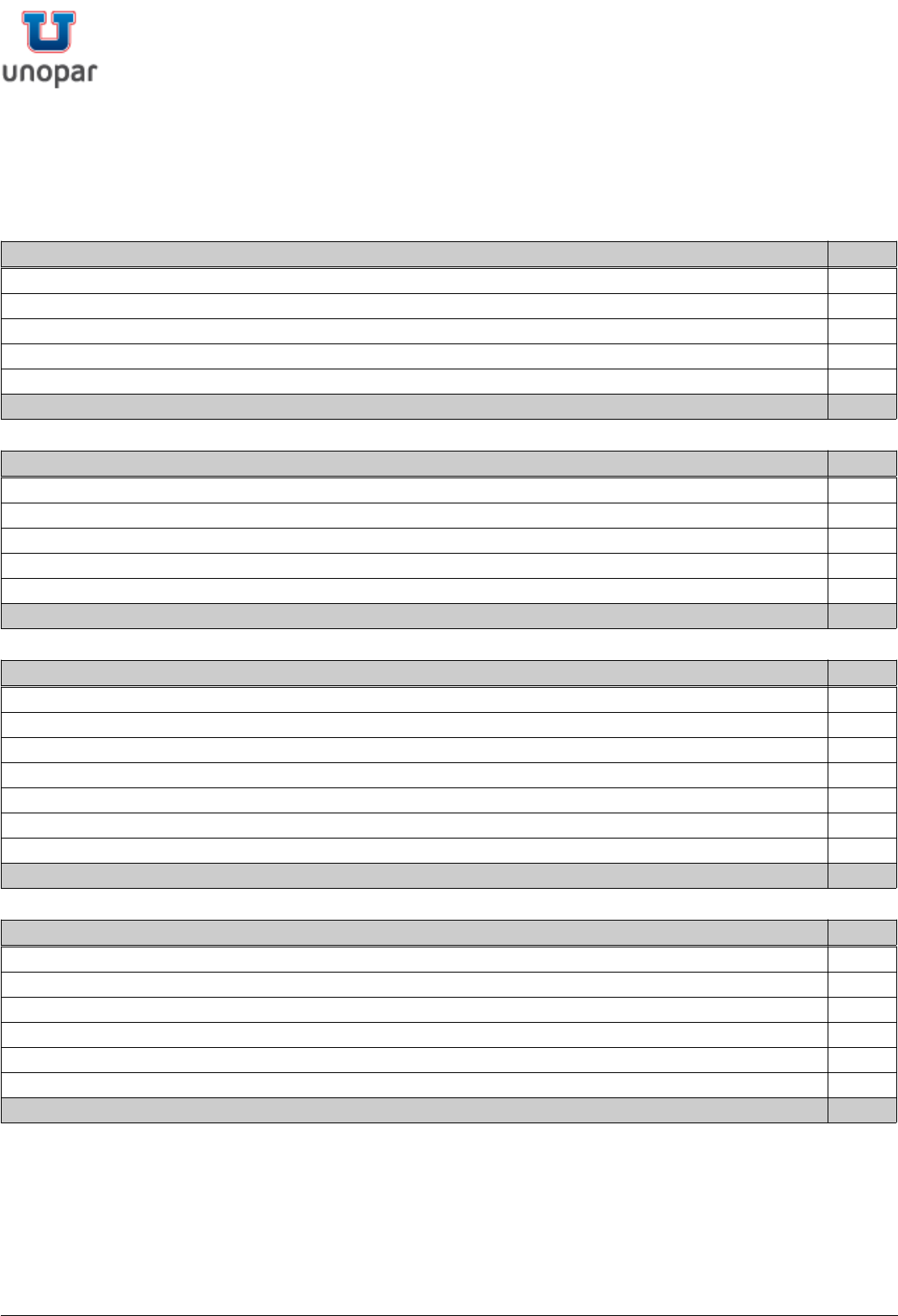 Pró-Reitoria Acadêmica - Secretaria Acadêmica Setorial EaD. PEDAGOGIA - LICENCIATURA Universidade Pitágoras Unopar Anhanguera Disciplina CH 1º SEMESTRE EDUCAÇÃO E DIVERSIDADE 60 EDUCAÇÃO INCLUSIVA 60 INOVAÇÃO EDUCACIONAL 60 LIBRAS - LÍNGUA BRASILEIRA DE SINAIS 60 SOCIEDADE BRASILEIRA E CIDADANIA 60 Total CH: 300 Disciplina CH 2º SEMESTRE FUNCIONAMENTO DA EDUCAÇÃO BRASILEIRA E POLÍTICAS PÚBLICAS 60 FUNDAMENTOS DA EDUCAÇÃO 60 PENSAMENTO CIENTÍFICO 60 PRÁTICAS PEDAGÓGICAS: IDENTIDADE DOCENTE 80 PSICOLOGIA DA EDUCAÇÃO E DA APRENDIZAGEM 60 Total CH: 320 Disciplina CH 3º SEMESTRE CAMPOS DE EXPERIÊNCIA E PRÁTICA EDUCATIVA 60 CORPO E MOVIMENTO 60 DIDÁTICA 60 HISTÓRIA DA EDUCAÇÃO 60 ORGANIZAÇÃO DO TRABALHO PEDAGÓGICO NA EDUCAÇÃO INFANTIL 60 PRÁTICAS EDUCATIVAS EM ESPAÇOS NÃO ESCOLARES 40 PRÁTICAS PEDAGÓGICAS EM GESTÃO DA APRENDIZAGEM 80 Total CH: 420 Disciplina CH 4º SEMESTRE LETRAMENTOS E ALFABETIZAÇÃO 60 LUDICIDADE E EDUCAÇÃO 40 NATUREZA E SOCIEDADE 60 ORGANIZAÇÃO DO TRABALHO PEDAGÓGICO NOS ANOS INICIAIS DO ENSINO FUNDAMENTAL 60 PRODUÇÃO E ANÁLISE DE MATERIAL DIDÁTICO 40 PROJETO DE EXTENSÃO I - PEDAGOGIA 140 Total CH: 400 24/11/2024 11:34:30 Diretoria de Informática Página 1 Pró-Reitoria Acadêmica - Secretaria Acadêmica Setorial EaD. PEDAGOGIA - LICENCIATURA Universidade Pitágoras Unopar Anhanguera Disciplina CH 5º SEMESTRE AVALIAÇÃO NA EDUCAÇÃO 60 CURRÍCULO E INOVAÇÕES 60 EDUCAÇÃO E ARTES 60 ESTRATÉGIAS E PROCEDIMENTOS PARA ALFABETIZAÇÃO 40 ESTÁGIO SUPERVISIONADO DE OBSERVAÇÃO E DIAGNÓSTICO DO CONTEXTO ESCOLAR 100 PROFISSIONALIZAÇÃO DOCENTE 40 PRÁTICAS PEDAGÓGICAS: BNCC E A ARTE DE EDUCAR 80 Total CH: 440 Disciplina CH 6º SEMESTRE ENSINO E APRENDIZAGEM DA GEOGRAFIA E HISTÓRIA 60 ENSINO E APRENDIZAGEM DA LÍNGUA PORTUGUESA 60 ENSINO E APRENDIZAGEM DA MATEMÁTICA 60 ENSINO E APRENDIZAGEM DAS CIÊNCIAS NATURAIS 60 ESTÁGIO SUPERVISIONADO DE INTERVENÇÃO NA EDUCAÇÃO INFANTIL 100 PRÁTICAS PEDAGÓGICAS NA EDUCAÇÃO INFANTIL 80 Total CH: 420 Disciplina CH 7º SEMESTRE ESTÁGIO SUPERVISIONADO DE INTERVENÇÃO NOS ANOS INICIAIS DO ENSINO FUNDAMENTAL 100 LINGUAGEM E ORALIDADE 60 LITERATURA INFANTO-JUVENIL 60 PROJETO DE EXTENSÃO II - PEDAGOGIA 180 PRÁTICAS PEDAGÓGICAS NOS ANOS INICIAIS DO ENSINO FUNDAMENTAL 80 Total CH: 480 Disciplina CH 8º SEMESTRE EDUCAÇÃO DE JOVENS E ADULTOS 60 ESTÁGIO SUPERVISIONADO - GESTÃO EDUCACIONAL 100 GESTÃO EDUCACIONAL 60 GESTÃO PEDAGÓGICA E PROJETO EDUCATIVO 60 LÍNGUA PORTUGUESA PARA DOCENTES 60 TRABALHO DE CONCLUSÃO DE CURSO - PEDAGOGIA 40 Total CH: 380 24/11/2024 11:34:30 Diretoria de Informática Página 2