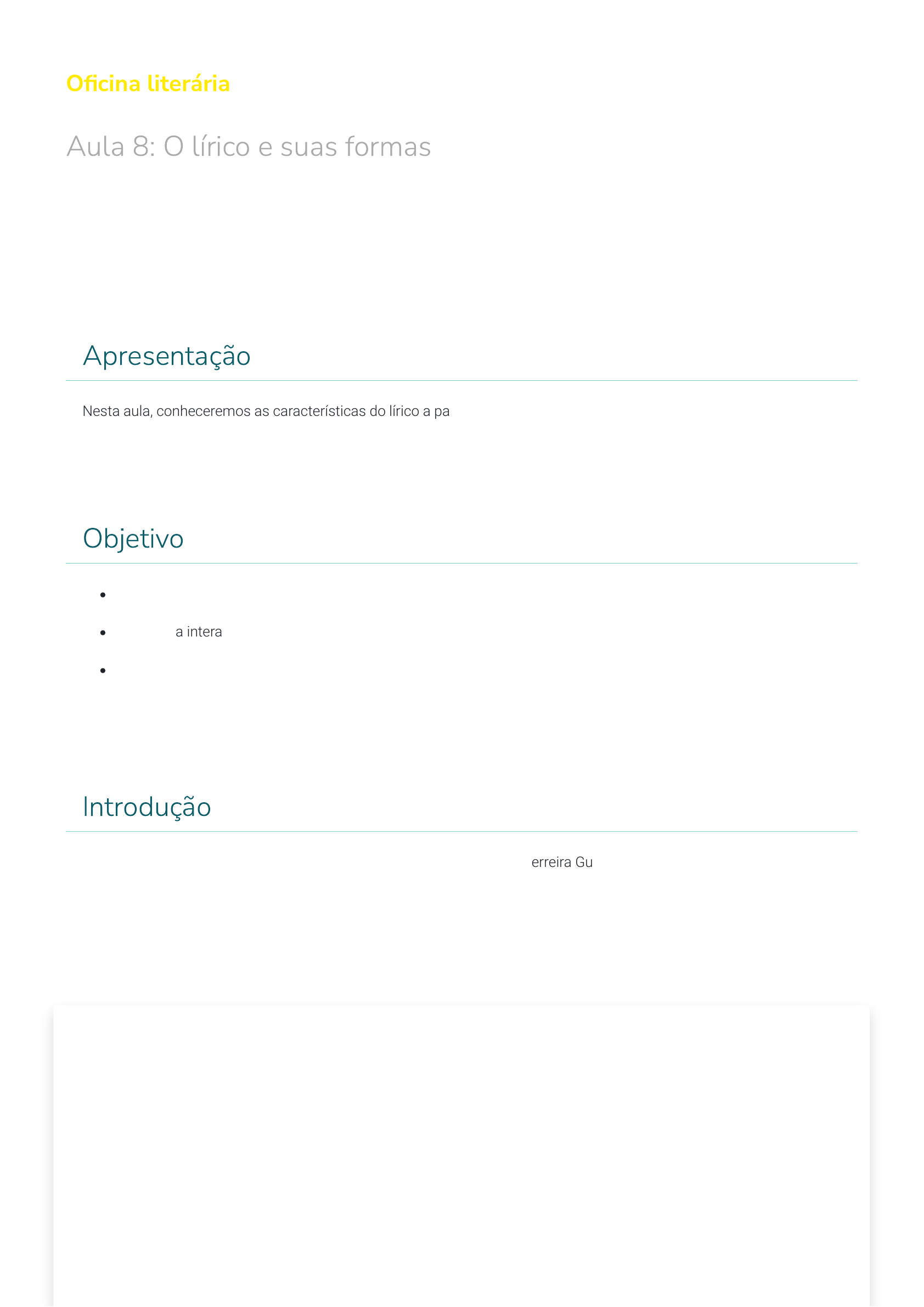 O�cina literária Aula 8: O lírico e suas formas Apresentação Nesta aula, conheceremos as características do lírico a partir da análise de algumas obras. Veremos também a diferença entre eu lírico e eu biográ�co. Objetivo Conhecer as características que compõem o lírico. Entender a interação estabelecida entre leitor e texto lírico. Identi�car questões sociais através do poema. Introdução A música Traduzir-se, música de Raimundo Fagner sobre o poema de Ferreira Gullar, fala sobre a di�culdade que o EU tem de se equilibrar entre os dois lados que o compõe, isto é, o lado racional e o passional. Traduzir-se - Raimundo Fagner Clique no botão acima. "Uma parte de mim é todo mundo Outra parte é ninguém, fundo sem fundo Uma parte de mim é multidão Outra parte estranheza e solidão Uma parte de mim pesa, pondera Outra parte delira Uma parte de mim almoça e janta Outra parte se espanta Uma parte de mim é permanente Outra parte se sabe de repente Uma parte de mim é só vertigem Outra parte linguagem Traduzir uma parte na outra parte Que é uma questão de vida e morte Fonte: Disponível em: //www.fagner.com.br/Letras/L_traduzir-se.html. Acesso em: jul. 019. Nesse processo contraditório, o EU exterioriza o seu con�ito, o seu interior dividido e difícil de ser compreendido: “Uma parte de mim/ é multidão;/outra parte estranheza/ e solidão.” É deixando vir à tona o lado racional que o EU diz: “Uma parte de mim/ pesa, pondera”, mas a racionalidade, em muitos momentos, dá espaço a emoção, a paixão dentro de cada ser humano. Por isso, o EU diz que “outra parte/delira.” A grande di�culdade é, para o ser humano, fazer uma leitura de si mesmo. A grande di�culdade é cada um tentar se entender para harmonizar o que tem de racional e passional. É o “Traduzir-se uma parte/ na outra parte”. Trata-se de algo que vai além da questão de vida ou morte. É a arte do equilíbrio existencial: “Será arte?” Esta música é o exemplo de que o lírico é o espaço onde o EU representa o mundo ao redor a partir de sua subjetividade. O sujeito, na literatura, surge com o lírico. É, no lírico, que esse sujeito deixa a�orar os seus sentimentos mais recônditos. Mas, você sabe o que é o lírico? A palavra lírica deriva do grego lyrikós que signi�ca algo referente à lira ou som da lira. Este é um instrumento primitivo de quatro cordas que, por sua musicalidade, tem vínculo com o surgimento da poesia lírica, pois o texto lírico tem, na sua estrutura, musicalidade. Ainda, quanto à origem, a poesia lírica tem seu pés �ncados em hinos religiosos e na tradição popular. Dentro desse mergulho, no túnel do tempo, encontramos, na Antiguidade, os momentos comuns da vida vinculados à poesia cantada. Assim, cantigas de ninar, lamentos de morte, cantos de pastores, hinos de vitória e adoração, cantigas de amor, manifestações coletivas ou isoladas de alegria ou tristeza tinham um viés poético. A lírica está ligada à livre imaginação onde a emoção supera o pensamento. (Fonte: Pexels por Pixabay ). Na Antiguidade, também falava-se numa lírica pessoal e outra impessoal. Você faz ideia do que isto signi�ca? A lírica pessoal é aquela em que o poeta fala de si, dos seus sentimentos e de suas ideias. A expressão máxima de sua subjetividade está direcionada para ele mesmo. Na lírica impessoal, o poeta assume a voz da coletividade. O poeta expressa os sentimentos da coletividade. Ele fala em nome de todos, mas, claro, segundo o seu olhar. Os sentimentos dele estão ali irmanados. Ele jamais se isenta de alguma coisa. Tudo é visto e expresso de acordo com a sua forma de sentir. Muitas formas líricas surgiram desde o século VII a.C. Por exemplo: a elegia, a poesia iâmbica, a ode, égloga, idílio, balada e o soneto. O que existe de importante no lírico é a relação entre o conteúdo e a forma, ou seja, é a relação entre o que está sendo dito e como está sendo apresentado. Assim, cada palavra é insubstituível. Toda palavra aliada ao som permite o acontecimento da lírica. (Fonte: delo por Pixabay ). Diante de um poema, nem sempre surge, no leitor, um estado de compreensão, de entendimento claro daquilo que está apresentado. Antes de atingir o entendimento, o leitor passa pelo plano da emoção. No entanto, para o leitor se emocionar é preciso estar de coração aberto. A sua sensibilidade tem que estar desperta. A�nal de contas, antes de entender, ele tem que sentir. Portanto, a alma tem que estar desarmada e a�nada com a alma do poeta. Há um estado de receptividade por parte do leitor. Você sabe o que é eu lírico e eu biográ�co? 1 Eu lírico É o eu comum de todos nós. Trata-se de um eu que vive as di�culdades do cotidiano e as alegrias da vida. É aquela parte do ser humano que está comprometida com os fatos, com o mundo e com a lógica. 2 Eu biográ�co É algo, totalmente, diferente do eu biográ�co. É aquele que não consegue se traduzir, porque não se compreende. Ele segue o �uxo da existência, deixando-se levar por tudo que está dentro e fora dele. Isso �ca claro no poema Meus oito anos, de Casimiro de Abreu: O eu lírico quebra as distâncias temporais e espaciais. Dessa forma, ele, através da emoção, resgata fatos que estão localizados no passado como se fossem atuais. Toda a subjetividade do eu lírico é ativada neste processo de recordar. "Meus oito anos" de Casimiro de Abreu Clique no botão acima. "Oh! que saudades que tenho Da aurora da minha vida, Da minha infância querida Que os anos não trazem mais! Que amor, que sonhos, que �ores,/p> Naquelas tardes fagueiras À sombra das bananeiras, Debaixo dos laranjais! Como são belos os dias De despontar da existência! – Respira a alma inocência Como perfumes a �or; O mar é – lago sereno, O céu – um manto azulado, O mundo – um sonho dourado, A vida – um hino d’amor! Que auroras, que sol, que vid