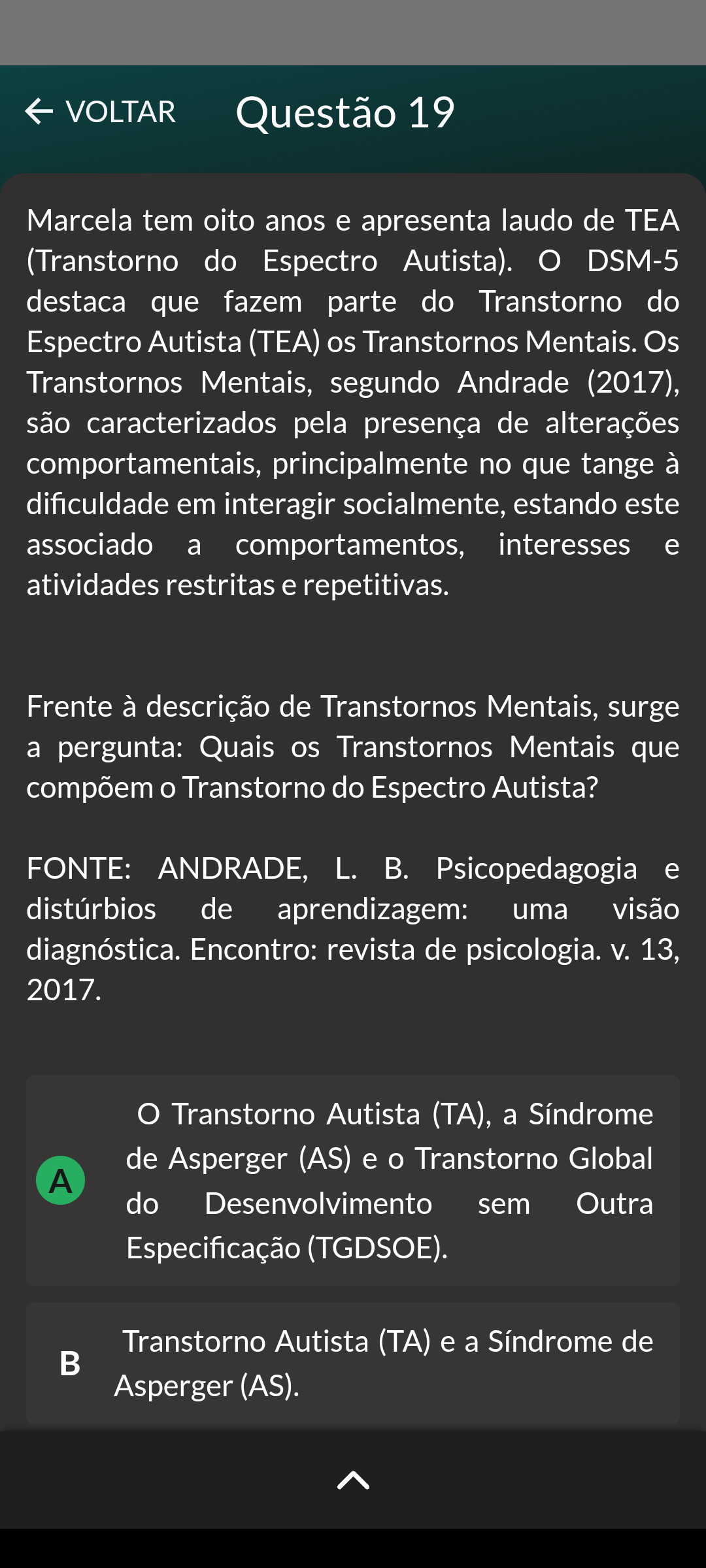 VOLTAR Questão 19 Marcela tem oito anos e apresenta laudo de TEA (Transtorno do Espectro Autista). O DSM-5 destaca que fazem parte do Transtorno do Espectro Autista (TEA) os Transtornos Mentais. Os Transtornos Mentais, segundo Andrade (2017), são caracterizados pela presença de alterações comportamentais, principalmente no que tange à dificuldade em interagir socialmente, estando este associado a comportamentos, interesses e atividades restritas e repetitivas. Frente à descrição de Transtornos Mentais, surge a pergunta: Quais os Transtornos Mentais que compõem O Transtorno do Espectro Autista? FONTE: ANDRADE, L. B. Psicopedagogia e distúrbios de aprendizagem: uma visão diagnóstica. Encontro: revista de psicologia. V. 13, 2017. O Transtorno Autista (TA), a Síndrome de Asperger (AS) e O Transtorno Global A do Desenvolvimento sem Outra Especificação (TGDSOE). Transtorno Autista (TA) e a Síndrome de B Asperger (AS).