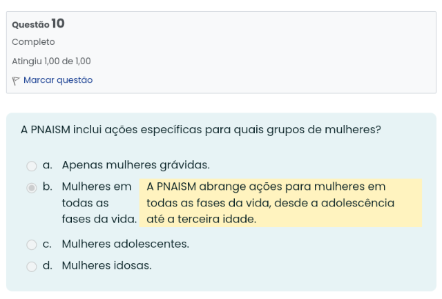 Questão 10 Completo Atingiu 1,00 de 1,00 Marcar questão A PNAISM inclui ações específicas para quais grupos de mulheres? a. Apenas mulheres grávidas. b. Mulheres em A PNAISM abrange ações para mulheres em todas as todas as fases da vida, desde a adolescência fases da vida. até a terceira idade. C. Mulheres adolescentes. d. Mulheres idosas.