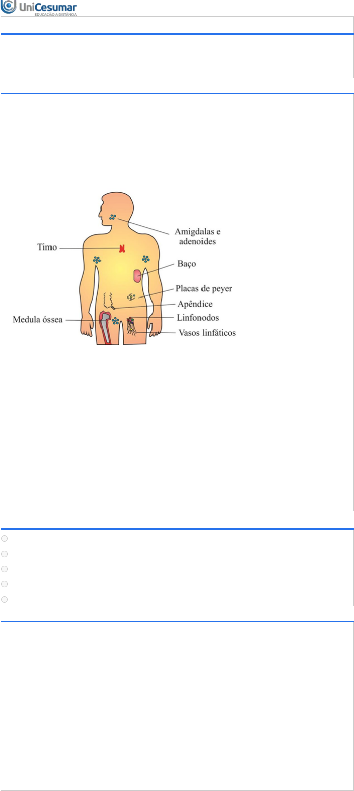 ATIVIDADE 3 - FUNDAMENTOS DE MICROBIOLOGIA E IMUNOLOGIA - 54_2024 Período:21/10/2024 08:00 a 24/11/2024 23:59 (Horário de Brasília) Status:ABERTO Nota máxima:0,50 Gabarito:Gabarito será liberado no dia 25/11/2024 00:00 (Horário de Brasília) Nota obtida: 1ª QUESTÃO Os órgãos linfoides são um conjunto de órgãos nos quais as células predominantes são os linfócitos. Estão, portanto, relacionados com a defesa do organismo contra moléculas e contra organismos cujas moléculas são consideradas pelo organismo como estranhas. Os linfócitos estão presentes em quase todos os locais do organismo. Estão concentrados em maior quantidade em estruturas anatomicamente distintas –os chamados órgãos linfoides– ou difusos no tecido conjuntivo do corpo. Disponível em: . Acesso em: 13 abr. 2023. A figura a seguir é uma representação dos órgãos linfoides. Fonte: Lima (2013). Considerando o texto e a figura apresentada, avalie as afirmações a seguir. I – Os órgãos linfoides podem ser classificados em órgãos linfoides primários e secundários. Os secundários são responsáveis pela síntese e maturação dos linfócitos B e T, e os primários são onde ocorrem as respostas imunes adaptativas. II – Os órgãos linfoides primários estão indicados do lado esquerdo da figura, enquanto os órgãos linfoides secundários estão indicados do lado direito. III – Os linfonodos são órgãos linfoides primários que fazem parte de uma rede de vasos que compõem o sistema linfático. Os linfonodos filtram o fluido que passa dos espaços intercelulares para o sistema linfático, assim, têm acesso aos antígenos, iniciando a resposta imune adaptativa. IV - O baço é o maior dos órgãos linfoides secundários e atua como um linfonodo, servindo como filtro sanguíneo muito efetivo para a remoção de células em degeneração (idosas ou danificadas) e na captação e concentração de substâncias estranhas transportadas no sangue. É correto o que se afirma em: ALTERNATIVAS I, apenas. II e III, apenas. II e IV, apenas. I, III e IV, apenas. I, II, III e IV. 2ª QUESTÃO Podemos entender as doenças infecciosas como uma batalha travada entre o poder dos agentes infecciosos de invadir o corpo e causar-lhe dano e o poder desse corpo de resistir a essas invasões. Sobre o sistema imunológico, analise as afirmativas a seguir: I. O sistema imune é composto por diversas células e moléculas, e a resposta deste sistema pode ser dividida didaticamente em resposta inata e adaptativa. II. São componentes da resposta imune inata: barreiras naturais, fagócitos, moléculas de reconhecimento de padrão e mediadores solúveis no plasma sanguíneo. III. A resposta imune adaptativa é a única que possui memória, ou seja, em um segundo contato com o mesmo agente infeccioso esta resposta imune será mais rápida e mais eficiente. IV. A resposta imune adaptativa é composta por elementos celulares e humorais, ao passo que a resposta imune inata é composta apenas por elementos celulares. V. Em uma exposição a um agente infeccioso ambiental, ambas as respostas imune, a inata e a adaptativa, sempre serão ativadas e gerarão memória imunológica. É correto o que se afirma em: ALTERNATIVAS I e III, apenas. I, II e III, apenas. II, III e V, apenas. IV e V, apenas. I, II, III, IV e V. 3ª QUESTÃO “Usualmente, uma célula produtora de citocinas recebe um estímulo e, a partir daí, passa a produzi-las. Após a liberação, elas se ligam em um receptor compatível com uma estrutura em uma célula-alvo, desencadeando uma sequência sinal e estimulando um efeito necessário para o combate do antígeno. As citocinas utilizam três padrões específicos de sinalização que são importantes para cada resposta imune desejada.” Fonte: Jean Carlos Fernando; BONI, Sara Macente. Fundamentos da Microbiologia e Imunologia. Maringá - PR: Unicesumar, 2022. P. 244. ISBN: 978-85-459-2265-0 Assim, com base nos padrões específicos de sinalização utilizado pelas citocinas, analise as asserções abaixo: I- Sinalização autócrina, ocorre quando a célula secreta a citocina e ela mesma reconhece. Isso acontece porque os receptores são compatíveis. PORQUE II- Uma célula (A) secreta a citocina e a outra célula (B) reconhece. Isso ocorre porque os receptores da célula B são compatíveis com a estrutura da citocina secretada pela célula A. A respeito dessas asserções, responda: ALTERNATIVAS As asserções I e II são proposições verdadeiras e a II é uma justificativa correta da I. As asserções I e II são proposições verdadeiras, mas a II não é uma justificativa correta da I. A asserção I é uma proposição verdadeira e a II é uma proposição falsa. A asserção I é uma proposição falsa e a II é uma proposição verdadeira. As asserções I e II são proposições falsas. 4ª QUESTÃO A gripe H1N1, ou influenza A, é provocada pelo vírus H1N1, um subtipo do influenzavírus do tipo A. Ele é resultado da combinação de segmentos genéticos do vírus humano da gripe, do vírus da gripe aviária e do vírus da gripe suína (daí o nome pelo qual ficou conhecida inicialmente), que infectaram porcos simultaneamente. Disponível em: . Acesso em: 19 abr. 2023. Uma pessoa foi vacinada contra o vírus da gripe H1N1. Ao entrar em contato com esse vírus, não desenvolveu a doença, pois já havia uma resposta imunológica pronta para combater a infecção viral. Considerando as informações apresentadas, avalie as afirmações a seguir. I. A resposta imunológica apresentada pela pessoa vacinada no texto é a resposta imune adaptativa. II. A resposta imune adaptativa que ocorreu na pessoa vacinada é ativada e representada pelas células fagocitárias (fagócitos) que após a digestão do patógeno libera anticorpos. III. Após a vacina, os linfócitos T realizam a fagocitose e a produção de anticorpos, ambas etapas da resposta imune adaptativa. IV. A resposta imune adaptativa é 