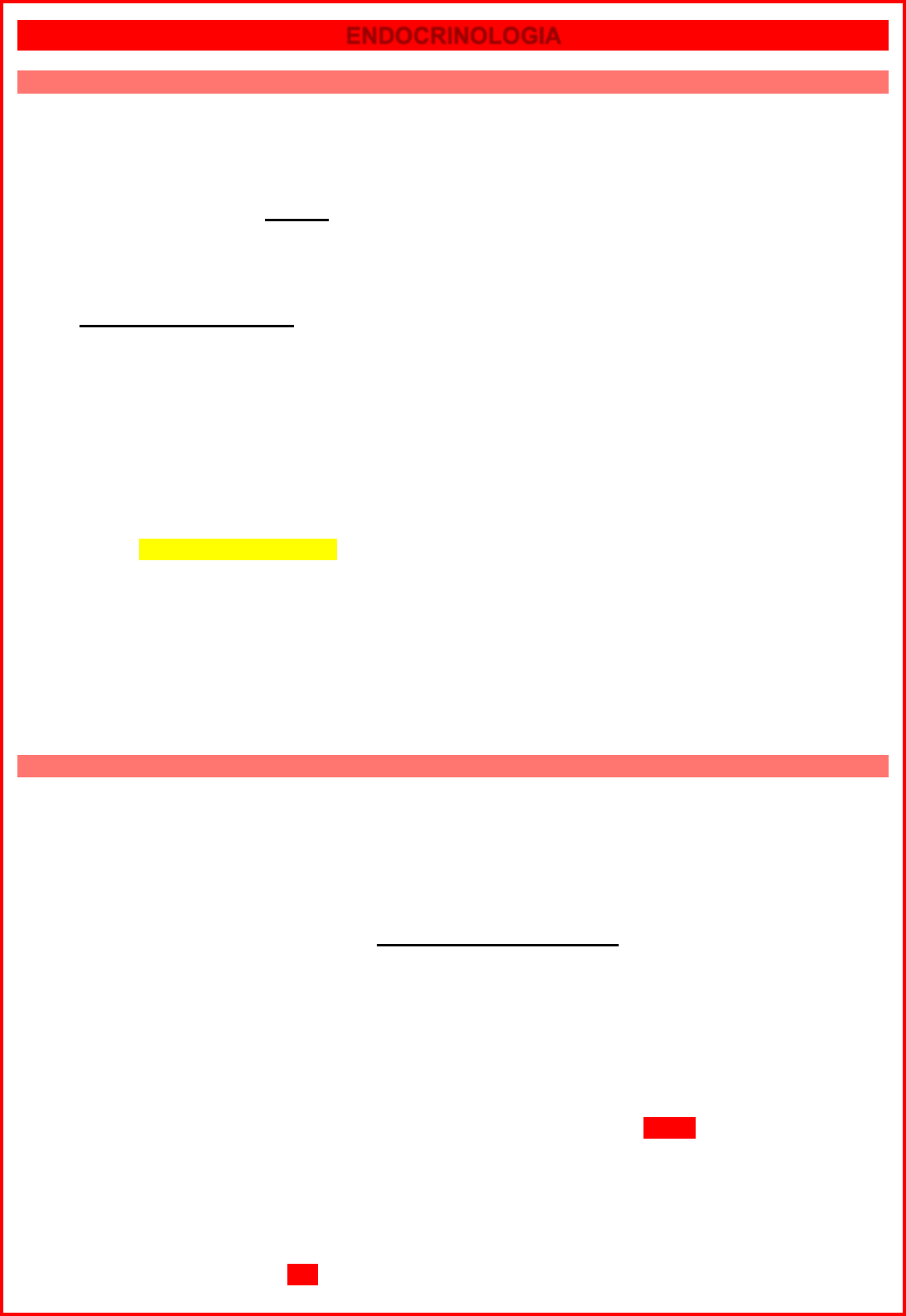 Joana Pscheidt – Medicina UNOESC, 12ª fase, 2023.1 ENDOCRINOLOGIA NÓDULOS TIREOIDIANOS Conduta: • Se ¯TSH: Cintilografia o Hipercaptante: Adenoma tóxico o Frio: USG • Se TSH normal: USG (Ti-Rads) o 1-2: Seguimento o 3: PAAF se >3.5 o 4: PAAF se >1.5 o 5: PAAF se >=1 • Classificação de Bethesda (pós PAAF): o 1 (insatisfatório): PAAF o 2 (benigno): Seguimento o 3 (atipia indeterminada): PAAF o 4 (aumento de células foliculares): Cirurgia o 5 (suspeito): Cirurgia o 6 (maligno): Cirurgia CA tireoide: • Bem diferenciado: Bom prognóstico. Seguimento pós tireoidectomia com levotiroxina (manter TSH suprimido para diminuir chances de recidiva) e USG após 6 meses (descartar remanescente) o Papilífero: Mais comum, mulheres 20-40a. Se =1cm, 2cm ou CA em histopatológico, tireoidectomia total • Pouco diferenciado: o Medular: Tireoidectomia + linfadenectomia. Seguimento com calcitonina. Pesquisar protooncogene RET em parentes de 1º grau (familiar em 20%) o Anaplásico/indiferenciado: Pior prognóstico, raro, baixa sobrevida TIREOIDIOPATIAS TRH (hipotálamo) à TSH (hipófise) à T3/funcionante e T4/inativo (tireoide) Hipertireoidismo: • Se TSH T4L: Hipertireoidismo secundário (geralmente adenoma hipofisário) • Se ¯TSH T4L (clínico)/T4 normal (subclínico): Hipertireoidismo primário • Quadro clínico: Hiperestimulação do metabolismo (insônia, agitação, polifagia, sudorese, PA divergente/alta, taquicardia), bócio (por hiperatividade da tireoide), oftamopatia de Graves, fácies Basedowiana, mixedema pré tibial • Se presença de nódulo: Cintilografia o Toda tireoide captante: Graves o Hipocaptante: Tireoidite subaguda o Nódulo único hipercaptante: Plummer/adenoma tóxico (nódulo produtor de hormônio tireoidiano de forma autônoma) à Tireoidectomia ou iodo o Múltiplos nódulos hipercaptantes: BMT à Tireoidectomia • Doença de Graves: Mais comum o Diagnóstico: TRAb estimulante positivo (estimula TSH) ou clínico (exoftalmia + bócio + dermatite/mixedema pré tibial/ocre) o Tratamento medicamentoso: Metimazol (menos efeitos colaterais) ou propiltiouracil (se gestantes do 1º trimestre ou crise tireotóxica) § EA: Agranulocitose – Se tosse e odinofagia, procurar a emergência o Tendencia a remissão após 2 anos de tratamento medicamentoso. Se não ocorrer, radioablação (iodoterapia) ou tireoidectomia o Acompanhar com T4L Joana Pscheidt – Medicina UNOESC, 12ª fase, 2023.1 o Sempre tratar, mesmo que subclínico!!! • Tireoidectomia: o Preparo cirúrgico com drogas antitireoidianas por 4-6 semanas (evita crise tireotóxica) e iodo por 10 dias (causa bloqueio dos hormônios tireoidianos pelo efeito Wolff Chaikoff) o Complicação mais comum: Hiperparatireoidismo transitório, podendo gerar hipocalemia Hipotireoidismo: • Se ¯TSH ¯T4L: Hipotireoidismo secundário (geralmente hipopituitarismo) • Se TSH ¯T4L (clínico)/T4 normal (subclínico): Hipotireoidismo primário • Quadro clínico: Lentificacao do metabolismo (depressão, aumento do peso, intolerância ao frio, bradicardia, constipação), bócio (por hiperestimulação da tireoide), hiperprolactinemia ( TRH), dislipidemia, mixedema • Tireoidite de Hashimoto: o Geralmente anti-TPO, anti-Tg ou TRAb bloqueador (antirreceptor de TSH) o Diagnóstico é dado pela clínica, dosagem de autoanticorpos não é obrigatória o Tratamento: Levotiroxina 1-2 μg/kg/dia o Acompanhar com TSH o Tratar subclínico quando: Mulher fértil e que deseja gestar, gestante, TSH >10, TSH 7-10 jovem com anti TPO + Tireoidites: Hipertireoidismo inicialmente (escape de coloide do folículo tireoidiano), hipotireoidismo após (fim do estoque) • Tireoidite aguda: Causa mais comum de tireoidite piogênica na infância. Drenagem + ATB • Tireoidite subaguda: DD com Graves (cintilogradia sem captação) à Linfocítica indolor ou granulomatosa dolorosa de Queirvan/de células gigantes (1-3 pós infecção viral, AINE) • Tireoidite crônica: Não retorna ao eutireoidismo à Fibrosante de Riedel, Tireoidite de Hashimoto (CAUSA MAIS COMUM DE HIPOTIREOIDISMO) DM 2 Fadiga pancreática secretória (insulina insuficiente) em razão da resistência periférica a insulina Diagnóstico: • 2 testes positivos de amostras iguais ou diferentes: GJ ≥126, TOTG ≥200, HbA1c ≥6.5% • Glicemia ≥ 200 + sintomas de DM OBS. Na pré diabetes (GJ 100-126, TOTG 140-199, HbA1c 5.7-6.4%), apenas 1 teste alterado já dá o diagnóstico Alvos: • HbA1c 10%, gestação, internação, doença hepática e renal avançada, LOA ANOTAÇÕES AMU: • Acompanhamento CA papilífero: TSH, T4L, tireoglobulina, anticorpo anti- tireoglobulina, 25-OH-vitamina d, Ca total, fósforo, albumina, USG de cervical • Tamanho normal da tireoide: 15-20 • Biotina altera TSH e T4L • Hipoparatireoidismo: Acompanhar Ca o Pode gerar sintomas como parestesia, formigamento, cambas o Sinais de hipocalcemia: § Sinal de Chvostek: Contração involuntária dos músculos faciais ao realizar percussão do nervo facial na região zigomático § Sinal de Trousseau: Contorção dos dedos em resposta à compressão do braço por meio de esfigmomanômetro insuflado >20 mmHg acima da PAS durante 3 minutos • OBESIDADE: o Questionar histórico: Se peso exacerbado súbito, pensar em Cushing o Principais opções: Sibutramina, topiramato, orlistate, liraglutida, semaglutida o Sibutramina 10/15mg: EA de boca seca, constipação, aumento da FC, alterações na PA. Contraindicado em HAS, DM, história psiquiátrica. Indicado em casos de alimentação em grandes volumes o Topiramato: Contraindicado em caso de litíase renal, lembrar que corta efeito do anticoncepcional • HIPOTIREOIDISMO: o Iniciar levotiroxina com 1,6-1,8/kg. Repetir em 6-8 semanas o Omeprazol sempre depois! Se não controlado, verificar adesão o Sempre tratar se gestante - Pode causar retardo • HIPERTIREOIDISMO: o Solicitar TRAb (GRAVES), cintilografia e USG o Tireotoxicose: Propranolol 40mg 12/12H