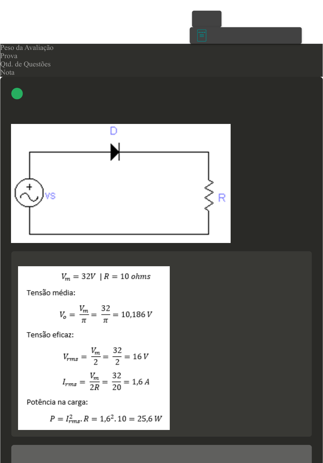 Prova Impressa GABARITO | Avaliação Final (Discursiva) - Individual (Cod.:990541) Peso da Avaliação 2,00 Prova 87691661 Qtd. de Questões 2 Nota 8,50 Observe o circuito da figura a seguir, que representa um retificador de meia-onda. Esse circuito possui uma fonte de tensão alternada, um diodo e uma carga puramente resistiva. Considere que a tensão de pico da alimentação é 32 V, a carga resistiva é de 10 ohms. Calcule o valor da tensão média e eficaz na carga e a potência entregue na carga. Resposta esperada Minha resposta VOLTAR A+ Alterar modo de visualização 1 04/12/2024, 15:34 Avaliação Final (Discursiva) - Individual about:blank 1/3 Tensão de pico = 32 V Carga = 10 Ohm Cálculo da tensão média V(média) = V(pico) / PIV(média)= 32/ 3,14 V(média) = 32/ 3,14 V(média) = 10,19 V. Cálculo da tensão eficaz V(eficaz)= V(pico) / 2 V(eficaz) = 32 / 2 V(eficaz) = 16 V. Cálculo da corrente eficaz I(eficaz) = V(pico) /2R I(eficaz) =32 / 2 x 10 I(eficaz) = 32 / 20 I(eficaz) = 1,6. O Cálculo da Potência entregue na carga Cálculo pela tensão: P = V(eficaz)^2 / R P = 16 / 10 P = 256 / 10 P = 25,6 W. Cálculo pela corrente: P= I(eficaz)^2 x R P = 1,6^2 x 10 P = 2,56 x 10 P = 25,6 W. A tensão média na carga é 10,19 V, a tensão eficaz na carga é 16 V e a potência entregue na carga é 25,6 W. Espero que tenha acertado e tenha uma justa correção, tenho estudado bastante para chegar nesta conclusão. Desde já, agradeço pela compreensão. Retorno da correção Prezado acadêmico, sua resposta contemplou alguns dos elementos da questão com base nos materiais disponibilizados, porém, poderia ter explorado mais os conteúdos fundamentais da disciplina) Em conversores CC-CC não isolados, podemos notar em suas topologias que a posição de capacitores e indutores podem variar de acordo com cada conversor. A imagem a seguir representa o circuito de um conversor elevador de tensão (Boost), onde há um indutor em séria com a fonte e um capacitor em paralelo com a carga. A chave (S) possui o estágio aberto e fechado. Considerando os estágios da chave, disserte sobre qual a função do capacitor e do indutor nesse circuito. Resposta esperada O indutor possui a função de armazenar a energia, na forma de campo magnético, criada pela fonte. Já o capacitor possui a função de armazenar energia na forma de campo elétrico. Sendo assim, no momento em que a chave está fechada, o indutor armazena energia e o capacitor alimenta a carga, reduzindo a tensão no capacitor. No momento em que a chave está aberta, o diodo começa a conduzir. Desta forma, o indutor entrega energia à carga e carrega o capacitor, elevando sua tensão. Minha resposta Com a chave (S) fechada, a energia irá fluir no indutor (L), para que a chave (S) na mesma hora, irá funcionar com by pass do circuito do Diodo (D), capacitor (C) e carga (R), e com isso o capacitor (C) alimentará a carga (R) diminuindo a tensão, já o diodo (D) ficará em bloqueio. agora Com a abertura da chave (S), a energia irá fluir no indutor (L), o diodo (D) passará a conduzir, e a energia irá fluir na carga (R), com isso o capacitor aumenta sua tensão. Desta forma, a chave (S) que controla armazenamento no indutor (L), e o capacitor se torna um filtro capacitivo, para estabelecer a tensão na carga dentro do nível desejado. O indutor (L) no 2 04/12/2024, 15:34 Avaliação Final (Discursiva) - Individual about:blank 2/3 momento de fechamento da chave (S1), funciona como limite de corrente. Espero que tenha acertado e tenha uma justa correção, tenho estudado bastante para chegar nesta conclusão. Desde já, agradeço pela compreensão. Retorno da correção Parabéns acadêmico, sua resposta se aproximou dos objetivos da questão, poderia apenas ter apresentado mais argumentos acerca dos conteúdos disponibilizados nos materiais didáticos e estudos. Imprimir 04/12/2024, 15:34 Avaliação Final (Discursiva) - Individual about:blank 3/3