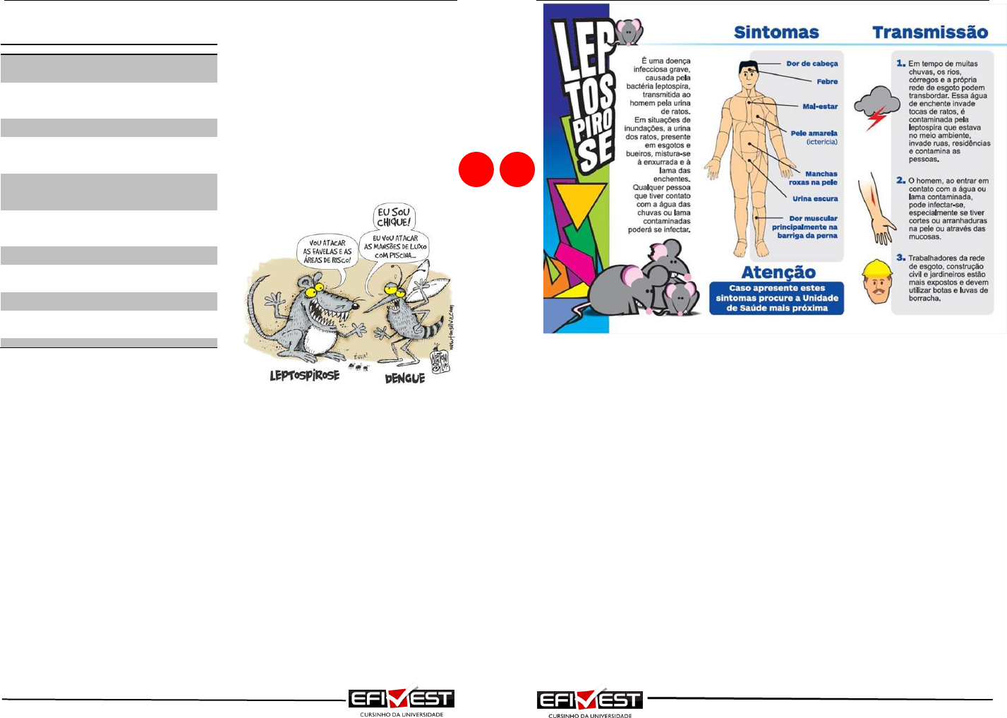 MICROBIOLOGIA & PARASITOLOGIA www.efivest.com.br 15 AS PRINCIPAIS DOENÇAS CAUSADAS POR BACTÉRIA DOENÇA MODO DE TRANSMISSÃO Tuberculose Bacilo de Koch (Mycobacterium tuberculosis), atacando os pulmões Lepra ou hanseníase É transmitida pelo bacilo de Hansen (Mycobacterium leprae) e causa lesões na pele e nas mucosas Difteria Causada pelo bacilo diftérico, que ataca principalmente crianças Coqueluche Doença que ataca crianças, produzindo uma tosse seca característica, causada pela bactéria Bordetela pertussis Tétano Produzido pelo bacilo do tétano (Clostridium tetani), que penetra no organismo por ferimentos na pele Leptospirose Leptospira interrogans transmitida pela água, alimentos e objetos contaminados com urina, com bactérias, principalmente de ratos Gonorréia Gonococo (Neisseria gonorrheage) transmitida pelo contato sexual Sífilis É provocada pela bactéria Treponema pallidum, que é transmitida pelo contato sexual Meningite meningocócica Meningoccoco transmitido por espirro, tosse ou fala Disenterias bacterianas Shigella e a Salmonela, transmitidas pela ingestão de água e alimentos contaminados Tracoma Bactéria Chlamydia trachomatis CÓLERA Causada pelo vibrião colérico (Vibrio cholerae, uma bactéria em forma de vírgula ou bastonete que se multiplica rapidamente no intestino humano eliminando potente toxina que provoca diarréia intensa), a doença (de origem indonésia) é transmitida através da ingestão de água ou alimentos contaminados. O tratamento imediato é o soro fisiológico ou soro caseiro para repor a água e os sais minerais: uma pitada de sal, meia xícara de açúcar e meio litro de água tratada. No hospital, a doença é curada com doses de antibióticos. A higiene e o tratamento da água e do esgoto são as principais formas de prevenção. A vacina existente é de baixa eficácia (50% de imunização) e de efeito retardado (de 3 a 6 meses após a aplicação). COQUELUCHE Trata-se de uma enfermidade que agride o aparelho respiratório e é causada por três bactérias do gênero Bordetella, sobretudo a B. pertussis. O contágio se dá pelas gotículas de saliva liberadas pelo doente por meio de tosse, espirro ou fala - objetos contaminados também podem transmitir a doença. O período de maior contaminação acontece quando o enfermo se encontra na primeira fase da infecção (catarral), onde os sintomas ainda não são suficientemente claros, e que ainda permitem um maior contato social do doente com pessoas sadias. primeiros sintomas que apresentam-se sob a forma de tosse com catarro, coriza, ligeiro mal-estar e, raramente, febre baixa, o que não permite diferenciar a coqueluche de qualquer gripe comum. Com o passar do tempo (duas semanas aproximadamente), a coqueluche começa a se expressar mais intensamente por meio de sintomas típicos: a tosse torna-se mais seca e curta, ocorrendo de oito a dez vezes em um único movimento expiratório (lembrando o soar de uma metralhadora). A tosse quase deixa o paciente sem ar e ao tentar inspirá-lo de volta, é possível identificar um guincho, semelhante a um assobio, característico da infecção e seguidos da eliminação de uma substância viscosa que, por vezes, provoca vômitos.Se não for tratada, a coqueluche pode provocar complicações respiratórias graves como broncopneumonia, enfisema, dispnéia, ruptura do diafragma, inflamação nos ouvidos, convulsões, coma e morte.A melhor forma de evitar a coqueluche é através da aplicação da vacina tríplice e do isolamento dos doentes. Nos casos mais graves, costuma-se administrar antibióticos, mais exatamente a eritromicina. LEPTOSPIROSE A leptospirose é uma doença infecciosa aguda causada pela bactéria Leptospira interrogans, transmitida pela urina de ratos. A rede de esgoto precária, a falta de drenagem de águas pluviais, a coleta de lixo inadequada e as conseqüentes inundações são condições favoráveis para o aparecimento de epidemias.Os sintomas da leptospirose aparecem entre dois e trinta dias após a infecção, sendo o período de incubação médio de dez dias. Febre alta, sensação de mal estar, dor de cabeça constante e acentuada, dor muscular intensa, cansaço e calafrios estão entre as manifestações da doença. Também são freqüentes dores abdominais, náuseas, vômitos e diarréia, podendo levar à desidratação. O tratamento de pessoas com leptospirose é feito principalmente com hidratação. Não devem ser utilizados medicamentes para dor ou para febre que contenham ácido acetil- salicílico, que podem aumentar o risco de sangramentos. Os anti-inflamatórios também devem ser evitados. Quando o diagnóstico é feito até o quarto dia de doença, devem ser empregados antibióticos, que reduzem as chances de evolução para a forma grave. As pessoas com leptospirose sem icterícia podem ser tratadas no domicílio. As que desenvolvem meningite ou icterícia devem ser internadas. MICROBIOLOGIA & PARASITOLOGIA (85) 3491.4000 16 FEBRE TIFOIDE Causada pela bactéria Salmonella Typhi, a febre tifóide é transmitida pela ingestão de alimentos ou água contaminados, ou pelo contato com os portadores. Seja como for, a única porta para a sua entrada é a via digestiva. A doença também é exclusiva do homem, não sendo encontrada manifestações dela em nenhuma outra espécie animal.. Os primeiros sintomas, caracterizados por dor de cabeça, fadiga, febre e agitação durante o sono. Deve ser tratada com antibióticos específicos, mais comumente o cloranfenicol e ampicilina, também deve-se tratar as complicações, caso hajam, e isolar o paciente, que mesmo curado pode tornar-se portador do bacilo por meses, até mesmo anos.Além da vacinação, para evitar o contágio da febre tifóide é necessário tratar a água e os alimentos, controlar o lixo, observar boas condições de higiene, identificar e vigiar os portadores dos bacilos. PESTE BUBÔNICA A peste é causada pela bactéria Yersinia pestis e 