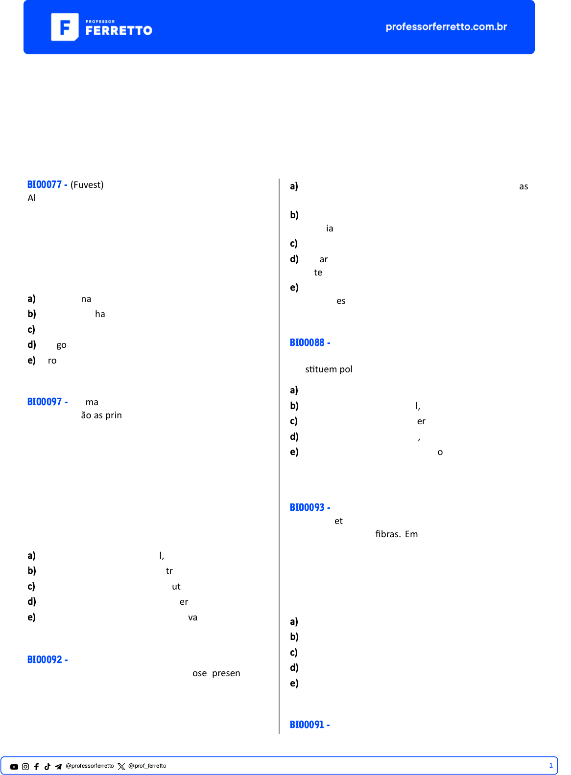 Vestibulares Bioquímica - ENEM Glicídios - ENEM BIO0077 - (Fuvest) Alimentos de origem vegetal e animal fornecem nutrientes u�lizados pelo nosso organismo para a obtenção de energia e para a síntese de moléculas. Após determinada refeição, completadas a digestão e a absorção, o nutriente majoritariamente absorvido foi a glicose. Considerando as alterna�vas abaixo, é correto afirmar que essa refeição estava cons�tuída de a) contrafilé na brasa. b) camarão na chapa. c) ovo frito. d) frango assado. e) arroz e feijão. BIO0097 - (Uema) Os glicídios são as principais fontes de energia diária para seres humanos e são classificados em monossacarídeos, oligossacarídeos e polissacarídeos, de acordo com o tamanho da molécula. Polissacarídeos são polímeros de glicose cons�tuídos fundamentalmente por átomos de carbono, hidrogênio e oxigênio que desempenham diversas funções essenciais ao bom funcionamento do organismo. Os polissacarídeos mais conhecidos são o glicogênio, a celulose, o amido e a qui�na. As funções atribuídas a essas moléculas são, respec�vamente, a) estrutural, reserva, estrutural, reserva. b) reserva, reserva, estrutural, estrutural. c) reserva, estrutural, reserva, estrutural. d) estrutural, estrutural, reserva, reserva. e) reserva, estrutural, estrutural, reserva. BIO0092 - (Unesp) O des�no de uma molécula de celulose presente nas fibras encontradas na alface ingerida por uma pessoa, numa refeição, é a) entrar nas células e ser “queimada” nas mitocôndrias, liberando energia para o organismo. b) ser “desmontada” no tubo digestório, fornecendo energia para as células. c) servir de matéria-prima para a síntese da glicose. d) entrar nas células e ser u�lizada pelos ribossomos na síntese de proteínas. e) ser eliminada pelas fezes, sem sofrer alteração no tubo digestório. BIO0088 - (Uff) O glicogênio e o amido, ambos polímeros da D-glicose, cons�tuem polissacarídeos de reserva e são encontrados: a) nas células do músculo estriado esquelé�co. b) nas células animal e vegetal, respec�vamente. c) nas células hepá�cas em diferentes quan�dades. d) nas células vegetal e animal, respec�vamente. e) tanto nas células animais quanto vegetais, na mesma proporção. BIO0093 - (Facisa) Em uma dieta alimentar foram condicionados ao paciente alimentos ricos em fibras. Embora não sejamos capazes de digeri-las, elas são importantes e úteis na alimentação, por absorverem água, es�mularem as contrações musculares do intes�no, etc. Nessa dieta alimentar, o paciente deve consumir alimentos com maior quan�dade de a) amido. b) lipídio. c) proteína. d) celulose. e) sacarose. BIO0091 - (Fuvest) 1@professorferretto @prof_ferretto Fonte: h�p://www2.uol.com.br/niquel/bau.shtmal. Acessado em 25/08/2009. Os animais que consomem as folhas de um livro alimentam-se da celulose con�da no papel. Em uma planta, a celulose é encontrada a) armazenada no vacúolo presente no citoplasma. b) em todos os órgãos, como componente da parede celular. c) apenas nas folhas, associada ao parênquima. d) apenas nos órgãos de reserva, como caule e raiz. e) apenas nos tecidos condutores do xilema e do floema. BIO0079 - (Uece) Estão �rando o carboidrato do pão. (Revista Saúde, nº 247, abril, 2004.) Tido como culpado pelo aumento da obesidade e responsável pelo aumento de triglicérides, moléculas associadas a doenças cardiovasculares, os carboidratos apresentam a seguinte fórmula geral: a) Cx(H2O)y b) CxH2yO(x – y) c) Cx(OH)y d) (CH)xOy BIO0083 - (Uemg) A intolerância à lactose produz alterações abdominais, no mais das vezes diarreia. Na super�cie mucosa do intes�no delgado há células que produzem, estocam e liberam uma enzima diges�va chamada lactase, responsável pela digestão da lactose. Quando esta é mal digerida passa a ser fermentada pela flora intes�nal, produzindo gás e ácidos orgânicos, o que resulta na assim chamada diarreia osmó�ca, com grande perda intes�nal dos líquidos orgânicos. O texto apresentado acima e outros conhecimentos que você possui sobre o assunto permitem afirmar corretamente que a) a intolerância à lactose pode ser evitada fazendo-se uso do leite de cabra. b) a enzima diges�va lactase é componente do suco pancreá�co. c) o meio intes�nal se torna hipertônico após a fermentação da lactose. d) a intolerância à lactose só acomete recém-nascidos, uma vez que, essa é a idade da lactação. BIO0089 - (Puccamp) Celulose, amido e glicogênio são polis sacarídeos que fazem parte de muitos alimentos. Ruminantes e outros herbívoros u�lizam como nutrientes esses três polissacarídeos. Isso porque são capazes de transformar (I) e (II) em glicose e, nos seus tubos diges�vos vivem, em associação mutualís�ca, microrganismos capazes de digerir (III). Para completar essa frase corretamente, basta subs�tuir I, II e III respec�vamente, por a) amido, glicogênio e celulose. b) amido, celulose e glicogênio. c) glicogênio, celulose e amido. d) celulose, glicogênio e amido. e) celulose, amido e glicogênio. BIO0098 - (Unifor) As propriedades especiais de ligação do átomo de carbono permitem a formação de uma grande variedade de moléculas orgânicas, que são capazes de exercer diferentes funções dentro das células. Dentre essas moléculas orgânicas, os carboidratos podem ser encontrados como micro e macromoléculas, desempenhando diferentes papéis fisiológicos. Em uma roda de conversa, alguns amigos discu�am sobre os carboidratos e fizeram as seguintes afirmações: - Paulo: Os carboidratos são também chamados de glicídios e cons�tuem importante fonte de energia para as células, além de propósito estrutural. - Fábio: São polímeros formados por aminoácidos que, quando sofrem hidrólise, liberam um grupo amina e um grupo carboxílico. - Marcos: A glicose é um exemplo de carboidrato u�lizado pelas célula
