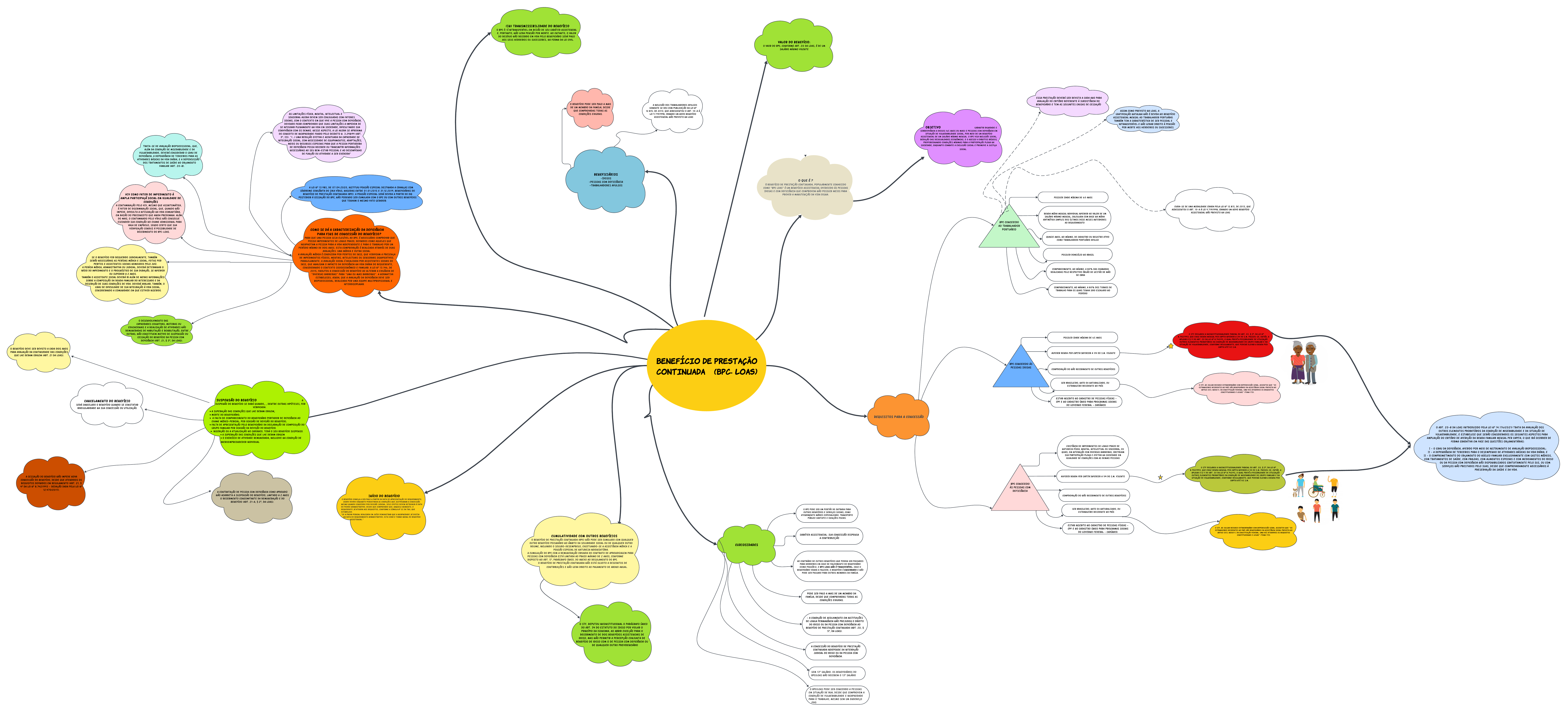 BENEFÍ CI O DE PRESTAÇÃO CONTI NUADA (bpc - l o as ) O QUE É ? O BENEFÍCIO DE PRESTAÇÃO CONTINUADA, POPULARMENTE CONHECIDO COMO "BPC LOAS" É UM BENEFÍCIO ASSISTENCIAL OFERECIDO ÀS PESSOAS IDOSAS E COM DEFICIÊNCIA QUE COMPROVEM NÃO POSSUIR MEIOS PARA PROVER A MANUTENÇÃO DA VIDA DIGNA. REQUI SI TOS PARA A CONCESSÃO BPC CONCEDIDO ÀS PESSOAS IDOSAS BPC CONCEDIDO ÀS PESSOAS COM DEFICIÊNCIA POSSUIR IDADE MÍNIMA DE 65 ANOS AUFERIR RENDA PER CAPITA INFERIOR A 1/4 DO S.M. VIGENTE Compr ovação do não r ecebiment o de out r os benef ícios SER BRASILEIRO, NATO OU NATURALIZADO, OU ESTRANGEIRO RESIDENTE NO PAÍS O STF decl ar ou a inconst it ucional idade par cial do ar t . 20 , § 3º, da Lei nº 8.742/1993, que exige r enda mensal per capit a inf er ior a 1/4 do S.M. Passou- se, ent ão, a apl icar o § 11 do ar t . 20 da Lei nº 8.742/93, o qual pr evê a possibil idade de ut il ização out r os el ement os pr obat ór ios da condição de miser abil idade do gr upo f amil iar e da sit uação de vul ner abil idade, conf or me r egul ament o, que poder á el evar a r enda per capit a at é 1/2 S.M. exist ência de impediment os de l ongo pr azo de nat ur eza f ísica, ment al , int el ect ual ou sensor ial , os quais, em int er ação com diver sas bar r eir as, obst r uam sua par t icipação pl ena e ef et iva na sociedade em igual dade de condições com as demais pessoas AUFERIR RENDA PER CAPITA INFERIOR A 1/4 DO S.M. VIGENTE Compr ovação do não r ecebiment o de out r os benef ícios SER BRASILEIRO, NATO OU NATURALIZADO, OU ESTRANGEIRO RESIDENTE NO PAÍS O STF decl ar ou a inconst it ucional idade par cial do ar t . 20 , § 3º, da Lei nº 8.742/1993, que exige r enda mensal per capit a inf er ior a 1/4 do S.M. Passou- se, ent ão, a apl icar o § 11 do ar t . 20 da Lei nº 8.742/93, o qual pr evê a possibil idade de ut il ização out r os el ement os pr obat ór ios da condição de miser abil idade do gr upo f amil iar e da sit uação de vul ner abil idade, conf or me r egul ament o, que poder á el evar a r enda per capit a at é 1/2 S.M. CURI OSI DADES O BPC pode ser um por t ão de ent r ada par a out r os benef ícios e ser viços sociais, como at endiment o médico especial izado, t r anspor t e públ ico gr at uit o e isenções f iscais. CARÁTER ASSISTENCIAL: SUA CONCESSÃO DISPENSA A CONTRIBUIÇÃO Ao cont r ár io de out r os benef ícios que podem ser passados par a her deir os em caso de f al eciment o do benef iciár io (como pensões), o BPC LOAS não é t r ansf er ível . Caso o benef iciár io venha a f al ecer , o benef ício é encer r ado e não pode ser passado par a out r os membr os da f amíl ia. BENEFI CI ÁRI OS - IDOSOS - PESSOAS COM DEFICIÊNCIA - TRABALHADORES AVULSOS O STF, ao j ul gar r ecur so ext r aor dinár io com r eper cussão ger al , assent ou que ?Os est r angeir os r esident es no País são benef iciár ios da assist ência social pr evist a no ar t igo 203, inciso V, da Const it uição Feder al , uma vez at endidos os r equisit os const it ucionais e l egais? (Tema 173). O STF, ao j ul gar r ecur so ext r aor dinár io com r eper cussão ger al , assent ou que ?Os est r angeir os r esident es no País são benef iciár ios da assist ência social pr evist a no ar t igo 203, inciso V, da Const it uição Feder al , uma vez at endidos os r equisit os const it ucionais e l egais? (Tema 173). BpC CONCEDIDO AO TRABALHADOR PORTUÁRIO POSSUIR IDADE MÍNIMA DE 60 ANOS Renda média mensal individual inf er ior ao val or de um sal ár io mínimo mensal , cal cul ada com base na média ar it mét ica simpl es dos úl t imos doze meses ant er ior es ao r equer iment o Quinze anos, no mínimo, de cadast r o ou r egist r o at ivo como t r abal hador por t uár io avul so POSSUIR DOMICÍLIO NO BRASIL Compar eciment o, no mínimo, a 80% das chamadas r eal izadas pel o r espect ivo ór gão de gest ão de mão de obr a Compar eciment o, no mínimo, a 80% dos t ur nos de t r abal ho par a os quais t enha sido escal ado no per íodo Cuida- se de uma modal idade cr iada pel a Lei nº 12.815, de 2013, que acr escent ou o ar t . 10- A à Lei 9.719/1998, cr iando um novo benef ício assist encial não pr evist o na LOAS Pode ser pago a mais de um membr o da f amíl ia, desde que compr ovadas t odas as condições exigidas. o benef ício Pode ser pago a mais de um membr o da f amíl ia, desde que compr ovadas t odas as condições exigidas. ? A condição de acol himent o em inst it uições de l onga per manência não pr ej udica o dir eit o do idoso ou da pessoa com def iciência ao benef ício de pr est ação cont inuada (ar t . 20 , § 5º, da LOAS). A concessão do benef ício de pr est ação cont inuada independe da int er dição j udicial do idoso ou da pessoa com def iciência. a incl usÃO DOS TRABALHADORES AVULSOS SOMENTE SE DEU COM PUBLICAÇÃO DA Lei nº 12.815, de 2013, que acr escent ou o ar t . 10- A à Lei 9.719/1998, cr iando um novo benef ício assist encial não pr evist o na LOAS COMO SE DÁ A CARACTERI ZAÇÃO DA Def iciênciA PARA FI NS DE CONCESSÃO DO BENEFÍCI O? Par a que uma pessoa sej a el egível ao BPC, é necessár io compr ovar que possui impediment os de l ongo pr azo, def inidos como aquel es que incapacit am a pessoa par a a vida independent e e par a o t r abal ho por um per íodo mínimo de dois anos. Est a compr ovação é r eal izada at r avés de duas aval iações: uma médica e out r a social . A aval iação médica é conduzida por per it os do INSS, que ver if icam a pr esença de impediment os f ísicos, ment ais, int el ect uais ou sensor iais signif icat ivos. Par al el ament e, a aval iação social é r eal izada por assist ent es sociais do INSS, que anal isam o impact o da def iciência na vida diár ia do r equer ent e, consider ando o cont ext o socioeconômico e f amil iar . A Lei nº 13.146, de 2015, f acil it ou a concessão do benef ício ao al t er ar a exigência de ?diver sas ba