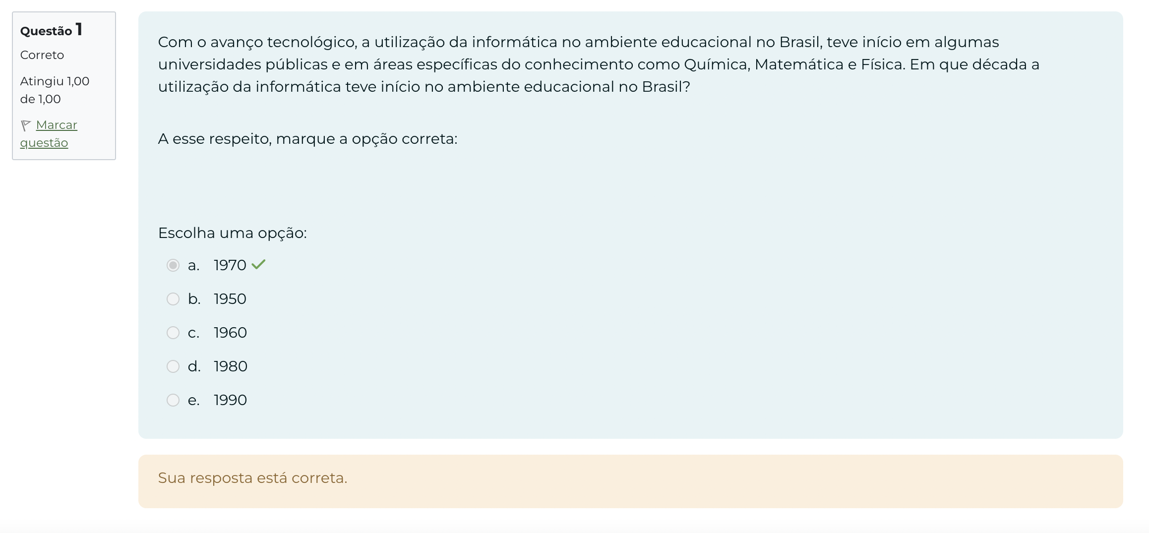 Com avanço tecnológico, a utilização da informática no ambiente educacional no Brasil, teve início em algumas universidades públicas e em áreas específicas do conhecimento como Química, Matemática e Física. Em que déca utilização da informática teve início no ambiente educacional no Brasil? A esse respeito, marque a opção correta: Escolha uma opção: a. 1970 b. 1950 C. 1960 d. 1980 e. 1990 Sua resposta está correta.