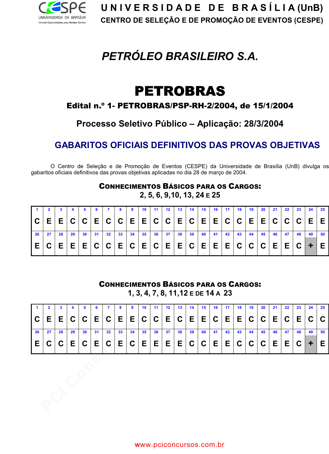 pcimarkpci MDAwMDowMDAwOjAwMDA6MDAwMDowMDAwOmZmZmY6Yzk0YzphYWRi:V2VkLCAxMCBKYW4gMjAyNCAwNjo1OTo1MSAtMDMwMA== www.pciconcursos.com.br U N I V E R S I D A D E D E B R A S Í L I A (UnB) CENTRO DE SELEÇÃO E DE PROMOÇÃO DE EVENTOS (CESPE) PETRÓLEO BRASILEIRO S.A. PETROBRASPETROBRASPETROBRASPETROBRAS Edital n.º 1- PETROBRAS/PSP-RH-2/2004, de 15/1/2004 Processo Seletivo Público – Aplicação: 28/3/2004 GABARITOS OFICIAIS DEFINITIVOS DAS PROVAS OBJETIVAS O Centro de Seleção e de Promoção de Eventos (CESPE) da Universidade de Brasília (UnB) divulga os gabaritos oficiais definitivos das provas objetivas aplicadas no dia 28 de março de 2004. CONHECIMENTOS BÁSICOS PARA OS CARGOS: 2, 5, 6, 9,10, 13, 24 E 25 1 2 3 4 5 6 7 8 9 10 11 12 13 14 15 16 17 18 19 20 21 22 23 24 25 C E E C C E C C E E C C E C E E C C E E C C C E E 26 27 28 29 30 31 32 33 34 35 36 37 38 39 40 41 42 43 44 45 46 47 48 49 50 E C E E E C C E C E C E E C E E E C C C E E C + E CONHECIMENTOS BÁSICOS PARA OS CARGOS: 1, 3, 4, 7, 8, 11,12 E DE 14 A 23 1 2 3 4 5 6 7 8 9 10 11 12 13 14 15 16 17 18 19 20 21 22 23 24 25 C E E C C E C E E C C E C E E C E E C C E C E C C 26 27 28 29 30 31 32 33 34 35 36 37 38 39 40 41 42 43 44 45 46 47 48 49 50 E C C E C E C E C E E E E C C E E C C C E E C + E www.pciconcursos.com.br www.pciconcursos.com.br www.pciconcursos.com.br pcimarkpci MDAwMDowMDAwOjAwMDA6MDAwMDowMDAwOmZmZmY6Yzk0YzphYWRi:V2VkLCAxMCBKYW4gMjAyNCAwNjo1OTo1MSAtMDMwMA== www.pciconcursos.com.br 2 CARGO 1: AUXILIAR DE SEGURANÇA INTERNA 51 52 53 54 55 56 57 58 59 60 61 62 63 64 65 66 67 68 69 70 71 72 73 74 75 C C E E E C E C E E E E C E E C E C C C E C C E C 76 77 78 79 80 81 82 83 84 85 86 87 88 89 90 91 92 93 94 95 96 97 98 99 100 C E C E C E C C C E C C E E C E E C E E E E C E C 101 102 103 104 105 106 107 108 109 110 111 112 113 114 115 116 117 118 119 120 121 122 123 124 125 E C E C E C E E C C C E C C C E E C C E E E C E E 126 127 128 129 130 131 132 133 134 135 136 137 138 139 140 141 142 143 144 145 146 147 148 149 150 E E C C C C E C C E E E C E C E C E C C E E C C C CARGO 2: CONTROLADOR(A) DE MOVIMENTAÇÃO E TRANSPORTE 51 52 53 54 55 56 57 58 59 60 61 62 63 64 65 66 67 68 69 70 71 72 73 74 75 C E C C C E E C C E E E C E E E E C C C E C C C E 76 77 78 79 80 81 82 83 84 85 86 87 88 89 90 91 92 93 94 95 96 97 98 99 100 C E C C E E E C E C C E E C C C C E C E E C E E C 101 102 103 104 105 106 107 108 109 110 111 112 113 114 115 116 117 118 119 120 121 122 123 124 125 C E C E E C C E E C C C C E E E E C E C C E C E E 126 127 128 129 130 131 132 133 134 135 136 137 138 139 140 141 142 143 144 145 146 147 148 149 150 E C C E C E E C E C E C E E C C E E C C E C E C E CARGO 3: ELETRICISTA ESPECIALIZADO(A) 51 52 53 54 55 56 57 58 59 60 61 62 63 64 65 66 67 68 69 70 71 72 73 74 75 E E E E C C C E C C E C C E E E C C E C E C C E C 76 77 78 79 80 81 82 83 84 85 86 87 88 89 90 91 92 93 94 95 96 97 98 99 100 E E E C E C E E E E C C E C C E C C E C C C E E E 101 102 103 104 105 106 107 108 109 110 111 112 113 114 115 116 117 118 119 120 121 122 123 124 125 C E C C E E C C + C E C E E C C E E C E E E C C E 126 127 128 129 130 131 132 133 134 135 136 137 138 139 140 141 142 143 144 145 146 147 148 149 150 C C C E C E C E E E E E E E C E C E C E E C C C E CARGO 4: MECÂNICO(A) ESPECIALIZADO(A) 51 52 53 54 55 56 57 58 59 60 61 62 63 64 65 66 67 68 69 70 71 72 73 74 75 E C E C E E C C C E C C E C E C E E C E C C E C E 76 77 78 79 80 81 82 83 84 85 86 87 88 89 90 91 92 93 94 95 96 97 98 99 100 E C E C C E C E C C C E E C E C E C E E C E C C E 101 102 103 104 105 106 107 108 109 110 111 112 113 114 115 116 117 118 119 120 121 122 123 124 125 C E E E C E C C C E E E E C C C C E C E C C C E C 126 127 128 129 130 131 132 133 134 135 136 137 138 139 140 141 142 143 144 145 146 147 148 149 150 E E C E C E C E E E E C C E C C E E E E C E E C C CARGO 5: OPERADOR(A) I 51 52 53 54 55 56 57 58 59 60 61 62 63 64 65 66 67 68 69 70 71 72 73 74 75 E E C C C E C C C E C C E E E C C E C E E C E C C 76 77 78 79 80 81 82 83 84 85 86 87 88 89 90 91 92 93 94 95 96 97 98 99 100 C C E E E E E E C C C C E E C E C C C C E E E C E 101 102 103 104 105 106 107 108 109 110 111 112 113 114 115 116 117 118 119 120 121 122 123 124 125 C E C C E C C C E C C C C E E E E C E C C C E E E 126 127 128 129 130 131 132 133 134 135 136 137 138 139 140 141 142 143 144 145 146 147 148 149 150 C E E E C E C C E E E C E C C E E C C E C E E C C www.pciconcursos.com.br www.pciconcursos.com.br www.pciconcursos.com.br pcimarkpci MDAwMDowMDAwOjAwMDA6MDAwMDowMDAwOmZmZmY6Yzk0YzphYWRi:V2VkLCAxMCBKYW4gMjAyNCAwNjo1OTo1MSAtMDMwMA== www.pciconcursos.com.br 3 CARGO 6: OPERADOR(A) DE MOVIMENTAÇÃO E TRANSPORTE I 51 52 53 54 55 56 57 58 59 60 61 62 63 64 65 66 67 68 69 70 71 72 73 74 75 C E C C C C E C E E E C E E C C E C E E C E C C C 76 77 78 79 80 81 82 83 84 85 86 87 88 89 90 91 92 93 94 95 96 97 98 99 100 E E C C E E E C E E E E C C C C C E C E E C E E C 101 102 103 104 105 106 107 108 109 110 111 112 113 114 115 116 117 118 119 120 121 122 123 124 125 C E C E E C C E E C C C C E E E E C E C C E C E E 126 127 128 129 130 131 132 133 134 135 136 137 138 139 140 141 142 143 144 145 146 147 148 149 150 E C C E C E E C E C E C E E C C E E C C E C E C E CARGO 7: PROGRAMADOR(A) DE COMPUTADOR I 51 52 53 54 55 56 57 58 59 60 61 62 63 64 65 66 67 68 69 70 71 72 73 74 75 E E C E E E C E C E E C E E E E C C E C C E E C C 76 77 78 79 80 81 82 83 84 85 86 87 88 89 90 91 92 93 94 95 96 97 98 99 100 C E E E E E E C C C C C C C C C C E C C C E E C C 101 102 103 104 105 106 107 108 109 110 111 112 113 114 115 116 117 118 119 120 121 122 123 124 125 E C E E E C E E E E E C C C C C E E C C E C E C E 126 127 128 129 130 131 132 133 134 135 136 137 138 139 140 141 142 143 144 145 146 147 148 149 150 E E C C E E C E C C E C C C C E E C C C E E C E E CARGO 8: SUPRIDOR(A) 51 52 53 54 55 56 57 58 59 60 61 62 63 64 65 66 67 68 69 70 71 72 73 74 75 C C C E E C E C C E C C E E E E E C C C C C E C E 76 77 78 79 80 81 