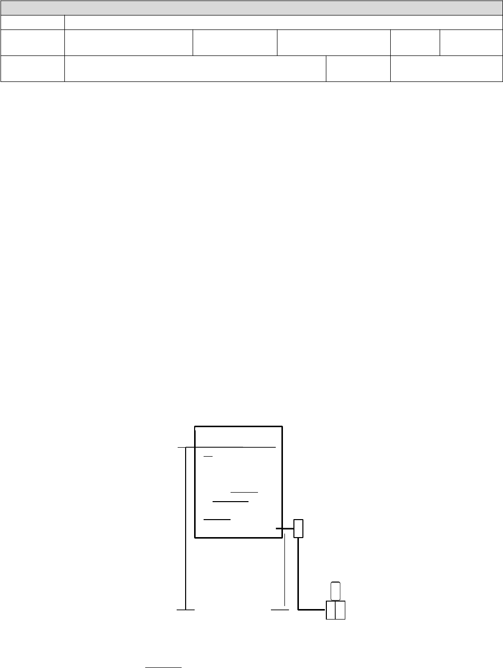 <p>1. IDENTIFICAÇÃO DOS ALUNOS</p><p>NOME:</p><p>TURNO:</p><p>TURMA:</p><p>DATA:</p><p>CURSO:</p><p>Docente:</p><p>EXERCICO – NIVEL 01</p><p>1. Defina Nível.</p><p>2. Cite três motivos que tornam a medição e o controle de Nível importante?</p><p>3. Cite três métodos utilizados para medição de Nível.</p><p>4. Cite três tipos de medidores diretos de Nível.</p><p>5. Qual o princípio de funcionamento dos Visores de Nível?</p><p>6. Quais as propriedades físicas utilizadas nos medidores indiretos de Nível?</p><p>7. Qual a aplicação para os Visores de Nível com vidro liso e vidro Reflex?</p><p>8. Cite três tipos de medidores indiretos de Nível.</p><p>9. Cite duas vantagens do medidor de Nível Radar em relação ao Ultrassônico.</p><p>10. No tanque aberto abaixo, utilizou-se um transmissor eletrônico diferencial de pressão para a medição de nível:</p><p>γ1 = 0,74g/cm3</p><p>γ2 = 0,88g/cm3</p><p>Página 1 de 7</p><p>H1 = 4000 mm</p><p>H2 = 1000 mm</p><p>A - Cálculo do Range para medição de nível.</p><p>Limite Inferior = PolH2O (pressão que deve ser aplicada na câmera Hi para que a saída seja 4mA correspondendo a 0% de nível de interface.)</p><p>Limite Superior = PolH2O (pressão que deve ser aplicada na câmera Hi para que a saída seja 20mA correspondendo a 100% de nível de interface.)</p><p>B - Considerando os limites inferior e superior, determine os demais pontos de calibração deter- mine a sinal de saída do LT quando o nível estiver em 98 PolH2O.</p><p>11. Qual a altura de uma coluna de álcool e a pressão equivalente em PSI, que irá produzir na base de um recipiente a mesma pressão de uma coluna de Hg de 5,5m? O peso específico do álcool e mercúrio vale respectivamente 0,88 gf/cm3 e 13.6 gf/cm3</p><p>12. Considere que o fluido contido no tanque abaixo possui o peso específico = 1020 Kgf/m3. Um transmissor eletrônico foi instalado na sua base e está com a saída de sinal em 12,8 mA. Calcule o Nível e a Pressão nesse ponto em cmH2O.</p><p>FLT</p><p>PONTO</p><p>ALTURA</p><p>A</p><p>0 mm</p><p>F</p><p>12500 mm</p><p>A</p><p>13. Considere um transmissor de Nível por Empuxo com os dados abaixo:</p><p>Range de saída = 4 a 20 mA; Peso do deslocador = 1,8 Kgf; peso Específico do fluido= 0,8 gf / cm3; Altura do deslocador = 0,56 m; Diâmetro do deslocador = 0,05 m</p><p>E = H . (.D2 / 4) . </p><p>Calcule os pesos para calibração quando o nível estiver em:</p><p>10</p><p>25</p><p>45</p><p>70</p><p>90</p><p>14. Considerando os princípios de medição de nível relacione corretamente as colunas:</p><p>A</p><p>Régua ou Ga-</p><p>barito</p><p>É presa a um cabo que tem sua extremidade ligada a um contra-</p><p>peso.</p><p>B</p><p>Visor de Nível</p><p>Transparente</p><p>É detectado o Nível em função do peso do produto</p><p>C</p><p>Visor de Nível</p><p>Reflex</p><p>É usado um deslocador suspenso por um sistema de alavancas,</p><p>que determina a força vertical a qual o deslocador é submetido.</p><p>D</p><p>Boia</p><p>Anula a pressurização do tanque para que esta não venha inter-</p><p>ferir na medição do Nível</p><p>E</p><p>Pressão Hidros-</p><p>tática</p><p>A determinação do nível se efetuará por meio da leitura direta do</p><p>comprimento molhado.</p><p>F</p><p>Pressão Dife-</p><p>rencial</p><p>O nível é detectado em função do atraso entre a emissão e a re-</p><p>cepção dos sinais eletromagnéticos emitidos</p><p>G</p><p>Medição por</p><p>Empuxo</p><p>Usados em reservatórios de alta pressão e temperatura e em lí-</p><p>quidos escuros.</p><p>H</p><p>Medidor Capa-</p><p>citivo</p><p>A quantidade de raios gama detectada é inversamente proporcio-</p><p>nal ao Nível</p><p>I</p><p>Medidor Ultra</p><p>sônico</p><p>Indica o Nível em função da altura e do peso específico do lí-</p><p>quido.</p><p>J</p><p>Medidor Radio-</p><p>ativo</p><p>É medido o tempo transcorrido entre a emissão e a recepção do</p><p>eco.</p><p>L</p><p>Células de</p><p>Carga</p><p>Usados em reservatórios de alta pressão e temperatura e em lí-</p><p>quidos transparentes.</p><p>M</p><p>Medidor por Ra-</p><p>dar</p><p>A variação do Nível é detectada quando o dielétrico ar é substitu-</p><p>ído pelo dielétrico do liquido.</p><p>15. Explique em que situação de instalação se deve fazer o ajuste de supressão de zero em um transmissor de Nível por pressão diferencial.</p><p>16. Explique em que situação de instalação se deve fazer o ajuste de elevação de zero em um transmissor de Nível por pressão diferencial.</p><p>17. Responda Verdadeiro ou Falso as seguintes questões: (1,8 pontos)</p><p>( ) A medição de Nível com deslocador (displacer), a densidade do deslocador deve ser maior que a do líquido;</p><p>( ) A medição de Nível com deslocador (displacer), o comprimento do deslocador deve ser sempre menor que a altura do Nível medido;</p><p>( ) A medição de Nível em tanque aberto a pressão diferencial requer apenas uma tomada fí- sica no processo;</p><p>( ) A medição de Nível pode ser continua ou discreta;</p><p>( ) A medição de Nível por Borbulhador, se baseia também na pressão diferencial;</p><p>( ) A medição precisa do nível pode aumentar a eficiência e economia da planta de processo. ( ) A unidade de nível deve ser a unidade de comprimento do Sistema Internacional de Unida- des (SI), que é o metro (m).</p><p>( ) As unidades possíveis de Nível são: altura, percentagem, volume ou massa;</p><p>( ) É importante se medir Nível, para manter um fornecimento consistente, pois, muitos proces- sos industriais requerem o suprimento estável de entradas e saídas.</p><p>( ) É possível a determinação do nível a partir da pesagem do tanque; ( ) É prática comum se referir ao nível como percentagem (%).</p><p>( ) Medir Nível não significa determinar a quantidade de uma substância em um reservatório. ( ) Na medição de nível a pressão diferencial, a densidade do fluido tem que ser con