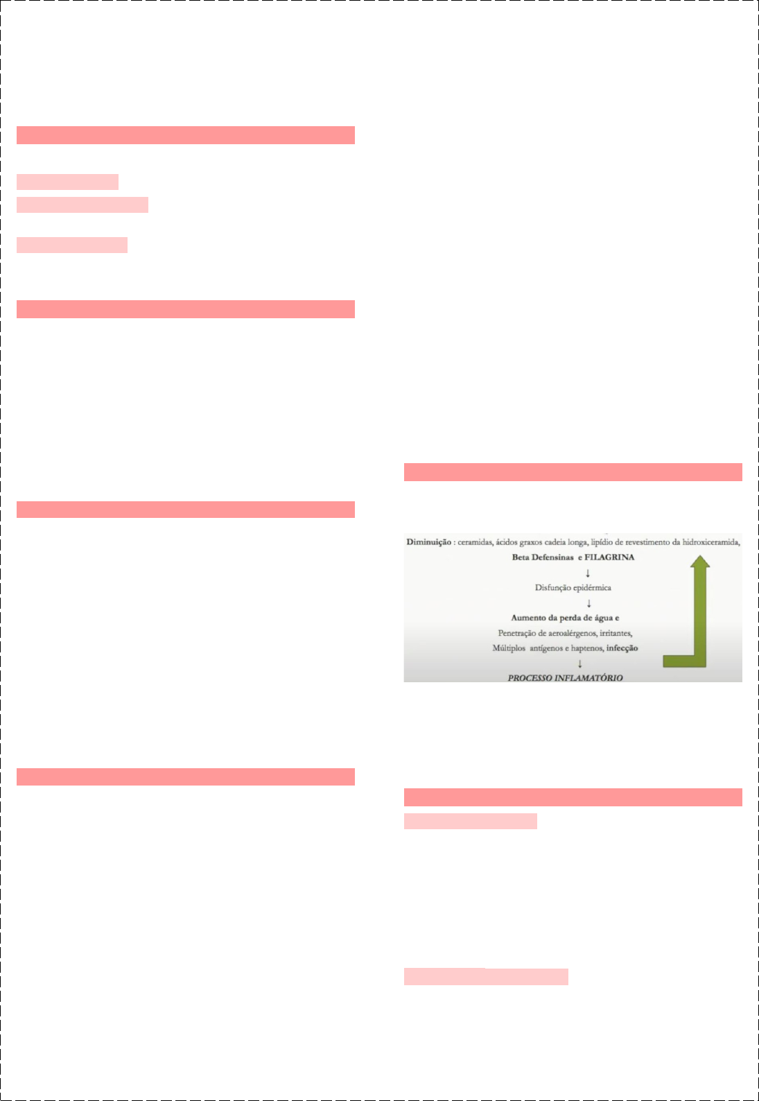 Eczemas ATÓPICO DE CONTATO Eczemas Doenças inflamatórias e pruriginosas da pele Eczema agudo - Eritema, edema, vesiculação, Eczema subagudo - formação de secreção e crostas Eczema Crônico - escamas e liquenificação Eczemas atópicos Conceito Eczema atópico, Eczema constitucional, Neurodermite disseminada Doença inflamatória crônica e recorrente da pele, pruriginosa e de etiologia multifatorial · Impactos: socioeconômico e qualidade de vida do paciente e dos pais · 90% ocorre antes dos 5 anos · Fase inicial da Marcha Atópica (manifestação precoce da atopia) Epidemiologia Geral: 10 – 15% · Crianças 15-30%/ Adultos: 2-10% América Latina: 15-20% Brasil: média de 13 % 20% consultas – dermatologia pediátrica Duração variável: diminuição no início da idade escolar e adolescência – 60% Aumento da prevalência últimos 30 anos, especialmente aos países desenvolvidos Associação com outras formas de atopia · DA + alergias respiratórias (69,7%) Etiopatogenia Evidências de depressão da imunidade celular de modo bem estabelecido Grande suscetibilidade a infeções virais, bacterianas e fúngicas, S.aureus coagulus coloniza intensamente 75 a 100% dos doentes com DA e atua como superantígeno ativando diretamente células T Alterações na quimiotaxia de monócitos, macrófagos e netrófilos A dermatite atópica possui predisposição genética: · 75 a 80% dos pacientes possuem história familiar ou pessoal de atopia · Mutações de perda de função no gene da filagrina (proteínas que mantém a função de barreira da pele) · Propicia perda de água transepidérmica (que leva ao ressecamento da pele) e infecções secundárias Fatores imunológicos envolvidos: · Predominância do padrão TH2 (humoral) · Imunidade humoral — maioria dos pacientes possui IgE elevado (principalmente associado a alergias respiratórias) · Níveis de IgE tendem mas a elevar recorrelacionam-se com a gravidade da dermatite · Imunidade celular—infiltrados cutâneos com células TCD4 com poucos linfócitos supressores (CD8) — IF2 e IFNγ Fisiopatologia: Barreira Cutânea Associada principalmente à diminuição da manutenção da barreira cutânea Esse processo inflamatório, que se torna crônico, piorando ainda mais a função barreira =↓ceramidas, ácidos graxos... Importância da hidratação como base do tratamento para manter a base cutânea Fatores Agravantes Fatores ambientais · Alergias, infecções, fatores emocionais, climáticos · Exposição precoce a microorganismos => maturação do sistema imune · Induzida ou exacerbada por toxinas estafilocócicas e presença de Malassezia · Sensibilização alérgica maior no 1º filho Alérgenos Alimentares · Pioram o quadro de 30% a 40% dos pacientes com dermatite atópica moderada a grave · Leite de vaca, ovos · Amendoim, soja · Trigo, nozes · Pescados, mariscos · Porco, frango Aeroalérgenos: ácaros, baratas, pelo de cães e gatos, pólen Fatores emocionais: Siress – Aumento do eosinófilo ao sangue periférico Infecções fúngicas · Aumento de IgE específica na DA · Mais em pescoço e cabeça · Melhora da DA com terapia antifúngica · Pitirosporum ovale · Malassezia sp. · Candida sp. Vírus: IVAS, Herpes simples Manifestações Clínicas Xerose · Descamação fina · Prurido · Alteração dos queratinócitos · Libera citocinas e mediadores inflamatórios pruridogênicos Eczema · Eritema: vasodilatação, prurido · Edema · Vesiculação · Exsudação · Crostas · Descamação DA Infantil · Acomete bochechas, pregas retro e infra-articulares, couro, cabeludo, superficies extensoras, dorso, mãos e pés, tronco · Pode acompanhar Irritabilidade, insônia Pré-puberal · Continuação da fase inicial, podendo haver liquenificação e acometendo sobretudo pregas de cotovelos e joelhos · O prurido causa lesões de pele, tornando a ferida uma porta de entrada para infecções secundárias · Hipocromia pós-inflamatória (dermatite do vaso sanitário)/ dermatite de contato (sinal de dermatite atópica) Critérios Critérios Absolutos – necessário mesmo de 2 1. Prurido: manifestação constante na dermatite atópica, todas as fases 2. Morfotopografia: localizações típicas – criança (região facial com lesões eczematosas agudas e subagudas na fronte e regiões malares, poupando o maciço centro-facial) e adulto (liquenificação nas áreas flexurais, dobras antecubitais, poplíteas e região do pescoço) 3. Tendência à cronicidade e/ou recidivas frequentes 4. História Familiar e/ou pessoal de atopia Critérios Menores · Demografismo branco · Xerose (prurido); ictiose (ressecamento); hiperlinearidade palmar; eczema mamilar · Pitiríase alba (manchas hipocrômicas com descamação); queratose pilar; palidez centro-facial com escurecimento orbitário; · Prega de Dennie-Morgan (pregas infra-orbitárias), sinal de Hertogue · Tendência a dermatoses crônicas recidivantes das mãos; tendência a infecções cutâneas repetidas; · Alterações oculares (ceratocone, catarata subcapsular) · Dupla prega (olhos) · Seratose papilar (braços – falta de hidratação) · Face com manchas hipocrômicas (não é pano branco) Complicações: Infecções · Bacterianas - S.aureus · Virais -molusco contagioso , papilomavírus, herpes Simples, varicela Zoster, eczema Herpetico · Fungicas – Trichophyton rubrum, dermatófitos Tratamento: Objetivos · Melhora dos sintomas, prevenir recorrências e exacerbações · Educação do paciente e familiares Evitar: Fatores Agravantes/Irritantes · Irritantes – Sabões, roupas de lâ e sintéticos, temperaturas externas, baixa imunidade, banhos quentes, exercícios, piscinas · Infecções · Alérgenos Cuidados Gerais · Banhos – evitar água quente e máximo 3-5 min; sabonetes suaves ou neutros (usar o menos possível); evitar buchas; emolientes e corticoides logo após banho · Hidratação e lubrificação – emolientes ou lubrificant