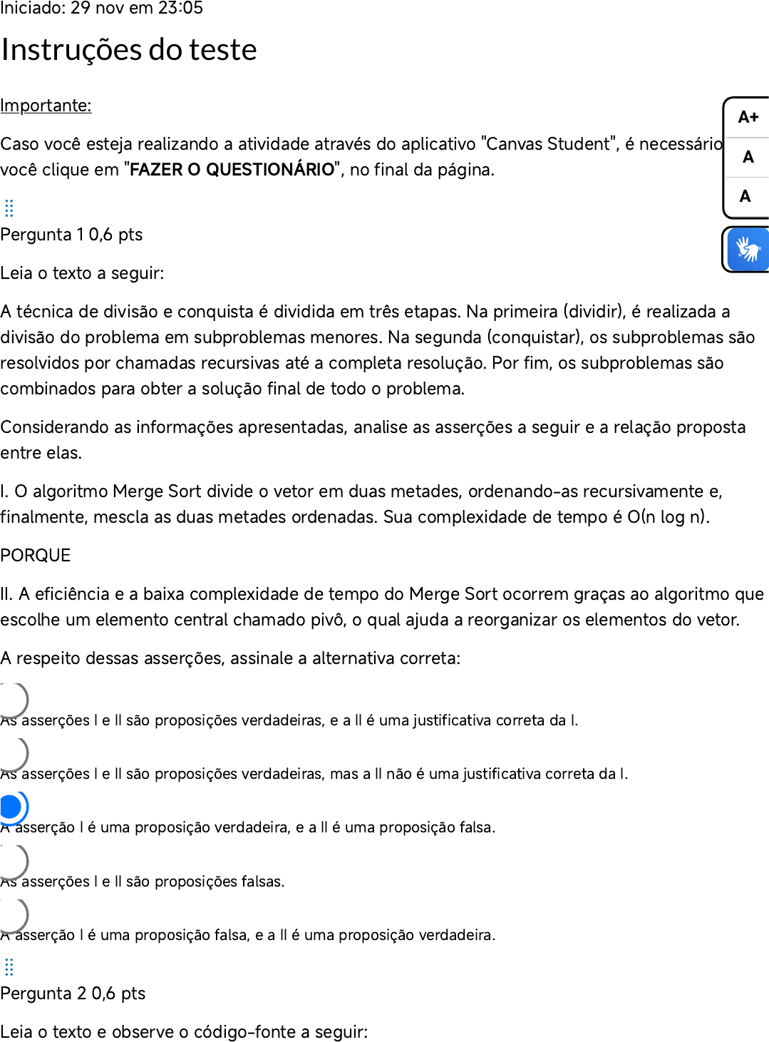 AO2 Iniciado: 29 nov em 23�05 Instruções do teste Pergunta 1 0,6 pts Pergunta 2 0,6 pts Importante: Caso você esteja realizando a atividade através do aplicativo "Canvas Student", é necessário que você clique em "FAZER O QUESTIONÁRIO", no final da página. Leia o texto a seguir: A técnica de divisão e conquista é dividida em três etapas. Na primeira (dividir), é realizada a divisão do problema em subproblemas menores. Na segunda (conquistar), os subproblemas são resolvidos por chamadas recursivas até a completa resolução. Por fim, os subproblemas são combinados para obter a solução final de todo o problema. Considerando as informações apresentadas, analise as asserções a seguir e a relação proposta entre elas. I. O algoritmo Merge Sort divide o vetor em duas metades, ordenando�as recursivamente e, finalmente, mescla as duas metades ordenadas. Sua complexidade de tempo é O(n log n). PORQUE II. A eficiência e a baixa complexidade de tempo do Merge Sort ocorrem graças ao algoritmo que escolhe um elemento central chamado pivô, o qual ajuda a reorganizar os elementos do vetor. A respeito dessas asserções, assinale a alternativa correta: As asserções I e II são proposições verdadeiras, e a II é uma justificativa correta da I. As asserções I e II são proposições verdadeiras, mas a II não é uma justificativa correta da I. A asserção I é uma proposição verdadeira, e a II é uma proposição falsa. As asserções I e II são proposições falsas. A asserção I é uma proposição falsa, e a II é uma proposição verdadeira. Leia o texto e observe o código�fonte a seguir: A+ A A- Pergunta 3 0,6 pts Em Python, podemos utilizar os operadores aritméticos para manipular os dados de variáveis, bem como realizar cálculos - assim como na matemática. Considerando as informações apresentadas, avalie as seguintes asserções e a relação proposta entre elas. I. O algoritmo apresentado tem a complexidade de tempo O(1), sendo considerada a complexidade de tempo mais eficiente. PORQUE II. Ao executar um algoritmo no tempo O(1), não importa o valor do elemento que você está pedindo para a função imprimir, apenas uma etapa é necessária. A respeito dessas asserções, assinale a opção correta: A asserção I é uma proposição verdadeira, e a II é uma proposição falsa. As asserções I e II são proposições verdadeiras, e a II é uma justificativa da I. As asserções I e II são proposições falsas. A asserção I é uma proposição falsa, e a II é uma proposição verdadeira. As asserções I e II são proposições verdadeiras, mas a II não é uma justificativa da I. Leia o texto a seguir: Um algoritmo é uma lista passo a passo de instruções usadas para executar uma tarefa final. Um bom engenheiro de software considerará a complexidade do tempo ao planejar seu programa. Desde o início, um engenheiro deve considerar um cenário que seu programa pode encontrar e que exigirá mais tempo para ser concluído. Isso é conhecido como a complexidade de tempo do pior caso de um algoritmo. Considerando as informações apresentadas, avalie as seguintes asserções e a relação proposta entre elas. I. O tempo de execução de uma tarefa constante não mudará, independentemente de qual seja o valor de entrada, sendo representada por O(n), onde O é chamado de Big O. A+ A A- Pergunta 4 0,6 pts PORQUE II. A notação Big O é a métrica mais comum para calcular a complexidade do tempo. A respeito dessas asserções, assinale a opção correta: As asserções I e II são proposições verdadeiras, e a II é uma justificativa da I. As asserções I e II são proposições verdadeiras, mas a II não é uma justificativa da I. A asserção I é uma proposição falsa, e a II é uma proposição verdadeira. A asserção I é uma proposição verdadeira, e a II é uma proposição falsa. As asserções I e II são proposições falsas. Leia o texto e observe o código a seguir: Em Python e em outras linguagens de programação, para que seja possível manipular dados uma das necessidades é criar variáveis que armazenem temporariamente valores, os quais podem ser numéricos (int ou float), textos (string) ou booleanos (bool). Qual a classe de complexidade de tempo do algoritmo apresentado? O(n) – Complexidade Linear. O(n²) – Complexidade Quadrática. O(1) – Complexidade Constante. O(2n) – Complexidade Exponencial. O(log n) – Complexidade Logarítmica. A+ A A- Pergunta 5 0,6 pts Pergunta 6 0,6 pts Leia o texto e observe o pseudocódigo a seguir: Um algoritmo é uma sequência finita de instruções que podem ser representadas de maneira declarativa, por meio de fluxogramas ou em um pseudocódigo, por exemplo. Essa sequência de instruções pode ser mais longa ou mais curta e pode ser alterada preservando a essência do algoritmo, ou seja, mantendo seu propósito. Considerando as informações apresentadas, assinale a alternativa correta: O algoritmo executará 5 instruções e, para diminuir esse valor, basta remover uma das linhas de instruções do tipo escreva. O algoritmo executará 4 instruções e, para diminuir esse valor, basta colocar um “else” substituindo a segunda instrução “se” (na linha 6). O algoritmo executará 7 instruções e, para diminuir esse valor, basta colocar um “else if” substituindo a segunda instrução “se” (na linha 6). O algoritmo executará 5 instruções e, devido às características do algoritmo, torna�se inviável diminuir o número de instruções. O algoritmo executará 5 instruções e, para diminuir esse valor, basta colocar um “else” substituindo a segunda instrução “se” (na linha 6). Leia o texto a seguir: Do ponto de vista da complexidade computacional, existem alguns tipos de problemas para os quais não existem algoritmos eficientes para resolvê�los. A maioria desses problemas tem um algoritmo que fornece uma solução, e esse algoritmo é a busca de 