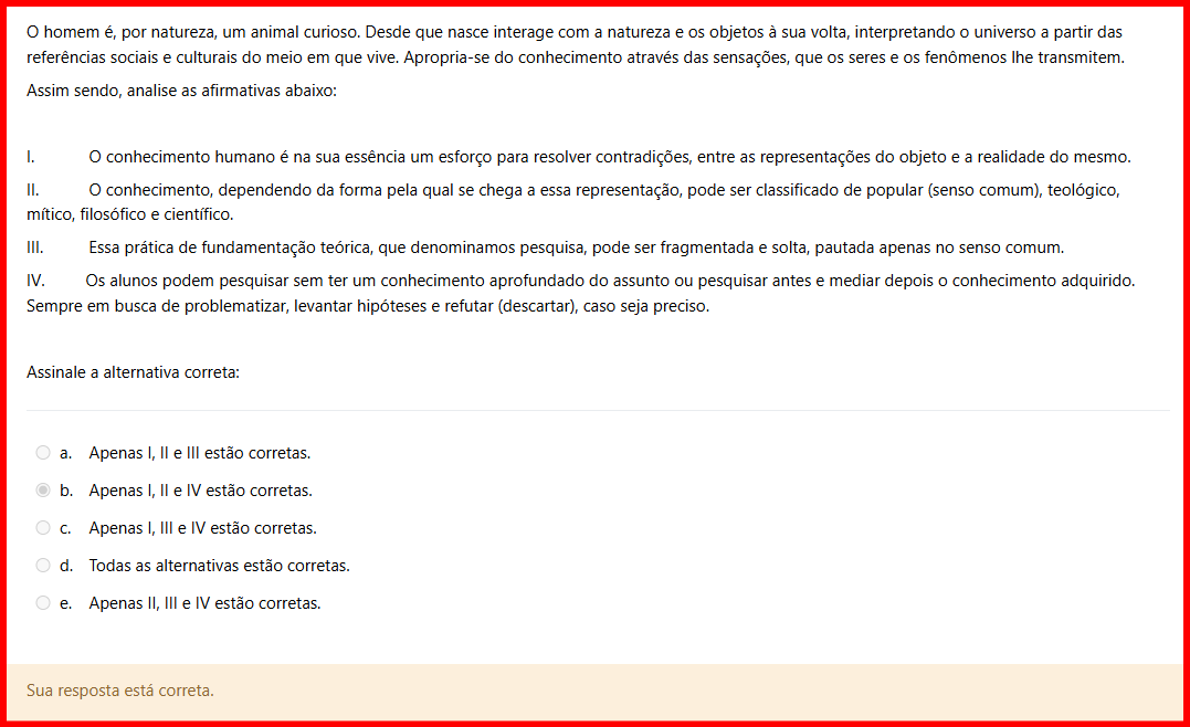 o homem é, por natureza, um animal curioso. Desde que nasce interage com a natureza e os objetos à sua volta, interpretando o universo a partir das referências sociais e culturais do meio em que vive. Apropria-se do conhecimento através das sensações, que os seres e os fenômenos lhe transmitem. Assim sendo, analise as afirmativas abaixo: I. conhecimento humano é na sua essência um esforço para resolver contradições, entre as representações do objeto e a realidade do mesmo. II. conhecimento, dependendo da forma pela qual se chega a essa representação, pode ser classificado de popular (senso comum), mítico, filosófico e científico. III. Essa prática de fundamentação que denominamos pesquisa, pode ser fragmentada e solta, pautada apenas no senso comum. IV. Os alunos podem pesquisar sem ter um conhecimento aprofundado do assunto ou pesquisar antes e depois conhecimento adquirido. Sempre em busca de problematizar, levantar hipóteses e refutar (descartar), caso seja preciso. Assinale a alternativa correta: a. Apenas I, II e III estão corretas. b. Apenas I, II e IV estão corretas. Apenas I, III e IV estão corretas. d. Todas as alternativas estão corretas. e. Apenas II, III e IV estão corretas. Sua resposta está correta.