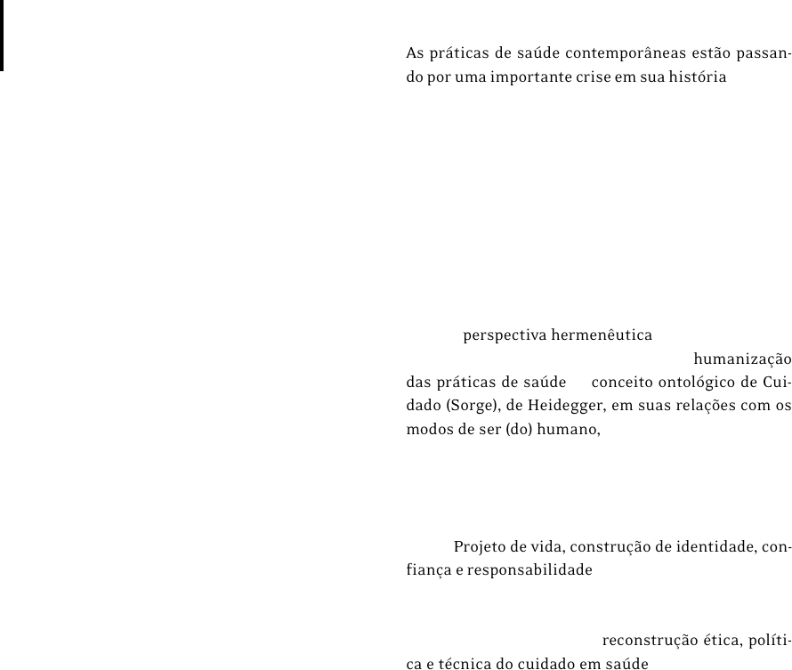 Resumo As práticas de saúde contemporâneas estão passan- do por uma importante crise em sua história. Em con- traste com seu expressivo desenvolvimento científico e tecnológico, estas práticas vêm encontrando sérias limitações para responder efetivamente às complexas necessidades de saúde de indivíduos e populações. Recentes propostas de humanização e integralidade no cuidado em saúde têm se configurado em podero- sas e difundidas estratégias para enfrentar criativa- mente a crise e construir alternativas para a organi- zação das práticas de atenção à saúde no Brasil. Este ensaio de reflexão tem como objetivo examinar, des- de uma perspectiva hermenêutica, alguns dos desafi- os filosóficos e práticos no sentido da humanização das práticas de saúde. O conceito ontológico de Cui- dado (Sorge), de Heidegger, em suas relações com os modos de ser (do) humano, é a base da revisão crítica empreendida acerca das características atuais da atenção à saúde. O desenvolvimento da análise é orien- tado por um estudo de caso de atenção primária à saú- de, extraído da experiência profissional do próprio autor. Projeto de vida, construção de identidade, con- fiança e responsabilidade são apontados como traços principais a serem considerados na compreensão das interações entre profissionais de saúde e pacientes e como pontos-chave para a reconstrução ética, políti- ca e técnica do cuidado em saúde. Palavras-chave: Cuidado; Integralidade; Humaniza- ção; Hermenêutica; Fenomenologia. José Ricardo de Carvalho Mesquita Ayres Livre-Docente, Professor Associado, Departamento de Medicina Preventiva da Faculdade de Medicina da USP E-mail: jrcayres@usp.br O cuidado, os modos de ser (do) humano e as práticas de saúde Care, (the) human being and health practices 16 Saúde e Sociedade v.13, n.3, p.16-29, set-dez 2004 Giovana Realce Giovana Realce Giovana Realce Giovana Realce Giovana Realce Giovana Realce Abstract Contemporary health practices are facing an impor- tant crisis in their history. In contrast with their huge scientific and technological development, these prac- tices are finding severe limitations for effectively responding to the complex needs for care of indivi- duals and populations. Recent proposals on humani- zed and comprehensive approaches are powerful and disseminated strategies for creatively facing the crisis and building alternatives for the organization of health care in Brazil. This reflexive essay aims to exa- mine from a hermeneutical point of view some of the philosophical and practical challenges to be faced in the way of the humanization of health practices. Heidegger‘s ontological concept of Care (Sorge), in its relations with (the) human being is the basis for a cri- tical review of current characteristics of health care. The analysis is driven by a case study on primary health care, taken from the author’s own professional experience. Life project, identity building, confidence and responsibility are pointed out as main features to be considered in the comprehension of interactions between health professionals and patients and as key issues in the ethical, political and technical renewal of health care. Key words: Care; Comprehensive Care; Humanization; Hermeneutics; Phenomenology. Relato de um Caso “Saí do consultório e caminhei pelo corredor lateral até a sala de espera, cartão de identificação à mão, para chamar a próxima paciente. Já era final de uma exaustiva manhã de atendimento no Setor de Atenção à Saúde do Adulto da unidade básica. Ao longo do per- curso fiquei imaginando como estaria o humor da paciente naquele dia – o meu, àquela hora, já estava péssimo. Assim que a chamei, D. Violeta1 veio, uma vez mais, reclamando da longa espera, do desconforto, do atraso de vida que era esperar tanto tempo. Eu, que usualmente nesse momento, sempre repetido, busca- va compreender a situação da paciente, acolher sua impaciência e responder com uma planejada sereni- dade, por alguma razão nesse dia meu sentimento foi outro. Num lapso de segundo tive vontade de revidar, nesse primeiro contato, o tom rude e agressivo de que sempre era alvo. Quase no mesmo lapso, senti-me sur- preso e decepcionado com esse impulso, que me pare- ceu a antítese do que sempre acreditei ser a atitude de um verdadeiro terapeuta, seja lá de que profissão ou especialidade for. Essa vertigem produziu em mim muitos efeitos. Um deles, porém, foi o que marcou a cena. Ao invés da calculada e técnica paciência habi- tual, fui invadido por uma produtiva inquietude, um inconformismo cheio de uma energia construtora. Após entrar no consultório com D. Violeta, me sentar e esperar que ela também se acomodasse, fechei o prontuário sobre a mesa, que pouco antes estivera consultando, e pensei: ‘Isto não vai ser muito útil. Hoje farei com D. Violeta um contacto inteiramente diferen- te’. Sim, porque me espantava como podíamos ter repe- tido tantas vezes aquela mesma cena de encontro (en- contro?), com os mesmos desdobramentos, sem nunca conseguir dar um passo além. Inclusive do ponto de vista terapêutico, pois era sempre a mesma hipertensa descompensada, aquela que, não importa quais dro- gas, dietas ou exercícios prescrevesse, surgia diante de mim a intervalos regulares. Sempre a mesma hiper- tensão, o mesmo risco cardiovascular, sempre o mes- mo mau humor, sempre a mesma queixa sobre a falta de sentido daquela longa espera. A diferença hoje era a súbita perda do meu habitual autocontrole; lamentá- vel por um lado, mas, por outro lado, condição para que uma relação inédita se estabelecesse. 1 Nome fictício. Saúde e Sociedade v.13, n.3, p.16-29, set-dez 2004 17 Para espanto da minha aborrecida paciente não comecei com o tradicional ‘Como passou desde a últi- ma consulta?’. Ao invés disso, prontuário fechado, ca- neta de volta ao bolso, olhei bem em seus olhos e dis- se: ‘Hoje eu q