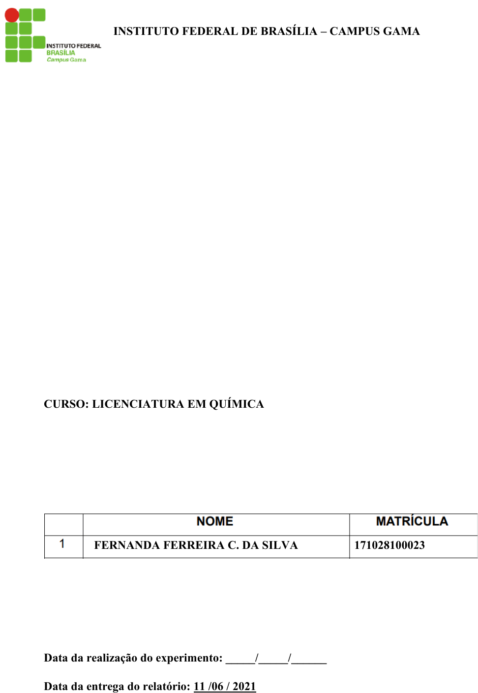INSTITUTO FEDERAL DE BRASÍLIA – CAMPUS GAMA LABORATÓRIO DE QUÍMICA INORGÂNICA EXPERIMENTO 1 - REATIVIDADE DOS METAIS E A PRODUÇÃO DE GÁS HIDROGÊNIO CURSO: LICENCIATURA EM QUÍMICA FERNANDA FERREIRA C. DA SILVA 171028100023 Data da realização do experimento: _____/_____/______ Data da entrega do relatório: 11 /06 / 2021 OBJETIVO DA EXPERIÊCIA Produção de gás hidrogênio: Objetivo da experiência é a produção do gás hidrogênio, que ocorre a partir da reação entre o hidróxido de sódio em meio aquoso e o alumínio. E também a combustão do gás hidrogênio que causou uma pequena explosão com a bexiga. Reatividade de metais: O experimento tem o objetivo de mostrar a reatividade de metais em função da velocidade com que os metais reagem com a solução aquosa de ácido clorídrico (HCl). INTRODUÇÃO Produção de gás hidrogênio: O hidrogênio é considerado o átomo mais abundante da tabela periódica, mesmo sendo conhecido muitas vezes como um elemento simples. É considerado um elemento que possui propriedades químicas muito ricas. Sua massa está em nono lugar como a mais abundante, já na tabela periódica ele está em terceiro lugar. O hidrogênio é um ametal que possui semelhanças com os halogênios, sendo que precisa de apenas um elétron de valência para completar sua configuração e ficar com a sua configuração de um gás nobre, lembrando que as propriedades químicas do hidrogênio se diferem das propriedades dos halogênios dessa forma o hidrogênio não pode ser identificado com nenhum grupo de elemento da tabela periódica. Hidrogênio pode ser encontrado nos minerais, oceanos e em todos os seres vivos. Mesmo possuindo um único elétron ele tem propriedades químicas variadas, além de variar quando está em meio básico forte de Lewis ou em um ácido forte dele Lewis. Estado mais estável do hidrogênio é quando forma uma molécula de atômica, ou seja, a formação do gás hidrogênio que é a combinação de dois átomos de hidrogênio. Essas reações sim o Silvinho envelhecer muito só podem ser produzidas com temperaturas altíssimas. O fato é que o hidrogênio atômico para ser produzido necessita do fornecimento de temperatura entre 2000 a 3000 k ou através de um arco elétrico. Através da decomposição da água o gás hidrogênio pode ser obtido, nesse processo o hidrogênio queima sem poluir o ar fazendo com que não contribua consideravelmente para o efeito estufa. Por conta de sua abundância o hidrogênio pode ser considerado uma fonte de combustível para utilizado no futuro levando em conta que o petróleo, o carvão e o gás natural se tornarão cada vez mais escassos. Os métodos mais utilizados para obtenção do hidrogênio são a reforma catalítica do gás natural e a eletrólise, mas no caso desses processos ocorre a liberação do dióxido de carbono na atmosfera além da alta demanda de energia para que a reação ocorra, tornando esses processos muitas vezes inviável se considerarmos a poluição além do gasto de energia. Por isso a necessidade da produção de hidrogênio com a utilização de metais em meio aquoso, sendo que o alumínio se destaca dentre os metais reativos, e também por ser um metal que pode ser encontrado de forma abundante na natureza. Dessa forma, o experimento realizado tem como objetivo promover a visibilidade da produção de gás hidrogênio através da reação entre o alumínio e a solução aquosa de hidróxido de sódio. Reatividade dos metais: A reatividade dos metais varia de acordo com a eletropositividade, ou seja, quanto mais eletropositivo o metal for por ele será mais reativo, lembrando que quanto mais reativo foram metais, maior será a tendência de perder elétrons, dessa maneira poderão ser formados mais facilmente os íons positivos. Quanto mais reativo o metal for menos Nobre ele vai ser. Um exemplo é o cobre metálico utilizado no experimento, que por ser um metal nobre ele não reage facilmente com o ácido clorídrico. De acordo com a fila de reatividade dos metais podemos observar que os metais mais reativos que o hidrogênio reage com ácidos isso faz com que o H+ seja deslocado e forme o gás hidrogênio, se na reação for adicionado ácido clorídrico no caso dos metais nobres como ouro, cobre, por exemplo, a reação não acontecerá. APARELHAGEM UTILIZADA: Experimento - Produção de gás hidrogênio: • Kitassato de 500ml • Uma mangueira • Hidróxido de sódio (NaOH) • A água • Funil Experimento - Explicando a reatividade de metais: experimentos com alguns metais em HCl: • HCl aquoso • Cobre metálico(Cu) • Ferro em pó (Fe) • Zinco metálico (Zn) • Magnésio metálico (Mg) METODOLOGIA Produção de gás hidrogênio: • Inicialmente deve-se acoplar a mangueira ao kitassato, depois acoplar a outra extremidade da mangueira a bexiga (passar uma fita isolante em volta dá boca da bexiga para que não escape ar ou pressionar para que não ocorra a fuga do gás hidrogênio); • Segundo passo: é adicionar soda cáustica ou hidróxido de sódio (NaOH) granulado no kitassato com o auxílio do funil, deve ser adicionado uma colher de sopa cheia de soda cáustica no funil para dentro do kitassato; • Terceiro passo: depois devemos colocar um punhado de bolinhas de papel alumínio dentro do kitassato; • Quarto passo: é adicionar água no kitassato e obstruir a entrada com uma tampa rapidamente após colocar a água. Podemos observar que depois de mexer o que kitassato começa a efervescência do papel alumínio formando bolhas, e uma fumaça que é a formação do gás hidrogênio que está sendo produzido. O gás passa pela gandula direcionada pela mangueira até a bexiga, onde será armazenada para em seguida gerar a sua combustão. É importante que a bexiga fique na posição vertical. Após a bexiga encher com até o término dá reação, devemos tirar a bexiga da mangueira rapidamente e amarrar as pontas para fechar a bexiga. Hidr