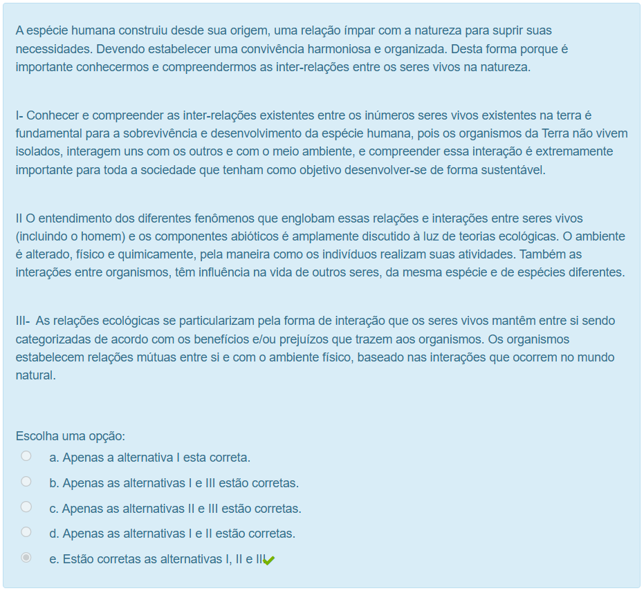 A espécie humana desde sua origem, uma relação impar com a natureza para suprir suas necessidades. Devendo estabelecer uma convivência harmoniosa e organizada. Desta forma porque é importante conhecermos e compreendermos as inter-relações entre os seres vivos na natureza. Conhecer e compreender as inter-relações existentes entre os inúmeros seres vivos existentes na terra é fundamental para a sobrevivência e desenvolvimento da espécie humana, pois os organismos da Terra não vivem isolados, interagem uns com os outros e com meio ambiente, e essa interação é extremamente importante para toda a sociedade que tenham como objetivo desenvolver-se de forma sustentável. II entendimento dos diferentes fenômenos que englobam essas relações e interações entre seres vivos (incluindo homem) e os componentes abióticos é amplamente discutido à luz de teorias ecológicas. ambiente é alterado, físico e quimicamente, pela maneira como os indivíduos realizam suas atividades. Também as interações entre organismos, têm influência na vida de outros seres, da mesma espécie e de espécies diferentes. III- As relações ecológicas se particularizam pela forma de interação que os seres vivos mantêm entre si sendo categorizadas de acordo com os benefícios e/ou prejuízos que trazem aos organismos. Os organismos estabelecem relações mútuas entre si e com o ambiente físico, baseado nas interações que ocorrem no mundo natural. Escolha uma opção: a. Apenas a alternativa esta correta. b. Apenas as alternativas e III estão corretas. C. Apenas as alternativas II e III estão corretas. d. Apenas as alternativas e II estão corretas. e. Estão corretas as alternativas I, II e