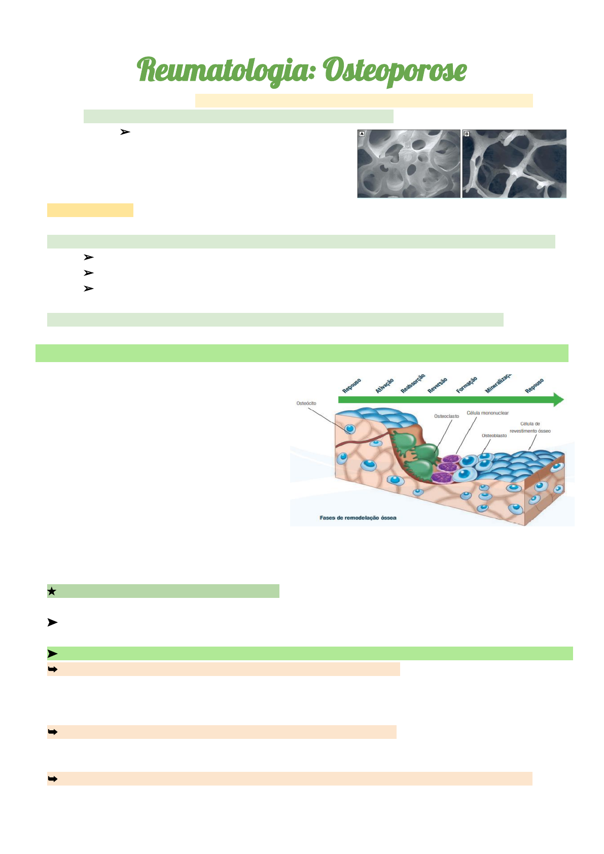 Alexandre Garrido _________ ____ Osteoporose / 7º Período - Turma 105 B ________________________________________________________________________________________________ Reumatologi�: Osteopor�� ⇒ Doença caracterizada por baixa massa óssea, ruptura da microarquitetura e fragilidade do esqueleto; ⥹ Diminuição da resistência óssea → Aumento do risco de fratura ➢ Tratamento para redução do risco ⧭ Exame de imagem demonstrando a TC tridimensional de osso esponjoso e a diferença entre espaços ósseos na osteoporose; ⦽ Epidemiologia : risco de fraturas por fragilidade é maior em brancos > 50 anos, 40% em M e 13% em H; ⧭ Fratura do quadril, por si só, é problemá�co → risco de infecção urinária, pulmonar, imobilidade, trombose; ➢ Risco de Fratura em Homens 6% e Mulheres 17%; — com aumento do risco após 50 anos ➢ Quadro grave e cirúrgico; ➢ Sobrevida em 5 anos = 80% ⧭ Fratura vertebral → 2/3 assintomá�cas, mas aumenta em 4x a possibilidade de uma nova fratura __+______________________ — Remodelação óssea — ___________________________+_ ➧ Osteoclastos reabsorvem o osso velho e os osteoblastos formam os novos ossos constantemente, mas após os 50 anos (principalmente na pós menopausa por redução do estrogênio, responsável por es�mular o osteoblasto e inibir o osteoclasto) há mais reabsorção do que formação, com mais presença de osteoclastos. O osso é um tecido altamente dinâmico; ➧ Na osteoporose há um desequilíbrio entre essas células, podendo ocorrer aumento da reabsorção óssea com redução da matriz, ou pode ocorrer uma diminuição da produção óssea, que também reduz sua matriz; ★ Regulação pelo hormônio PTH – paratormônio ➢ Início na fase de repouso ⇒ a�vação ⇒ reabsorção ⇒ reversão ⇒ ;formação ⇒ mineralização ⇒ repouso ➤ Vias de Sinalização (não precisa decorar) ➤ Hormônios que Modulam a Reabsorção Óssea ______ ➥ Paratormônio PTH: Es�mulo é con�nuo, aumentando a reabsorção óssea. ⤐ Se fosse intermitente travaria o processo; ⤐ Tratamento pode relacionar-se com o PTH ➥ Estrogênio: Inibe sinalização RANK-RANKL ⇒ Diminui a reabsorção óssea ⤐ Ausência de estrogênio → menopausa, perda óssea, perde efeito protetor que inibe a sinalização ➥ Glicocor�coide exógeno: Diminuição da formação óssea, perda de osteócitos e aumento da reabsorção ⤐ A osteoporose pode ser induzida por glicocor�coide Alexandre Garrido _________ ____ Osteoporose / 7º Período - Turma 105 B ________________________________________________________________________________________________ ⟴ PICO DE MASSA ÓSSEA : 20 A 30 ANOS , depois dessa idade começa o processo de perda, mas não é o mesmo que osteoporose/osteopenia. A queda no homem é mais lenta do que na mulher. ★ Depois do pico, a perda estável pode chegar a ser de 2 a 3% de massa óssea por ano; ⤐ Fatores ambientais : exposição à vitamina D, ingestão de cálcio na infância e adolescência. ■ Exercício �sico contra resistência ⤐ Gené�cos : predisposição à baixo pico, sexo feminino ➠ Fatores de Risco modificáveis ⤐ Tabagismo; ⤐ E�lismo (3 doses/dia); ⤐ Sedentarismo; ⤐ Baixa ingestão de cálcio; ⤐ Baixo peso ( 2 cm no úl�mo ano; ➢ Fratura de Colle: Extremidade do rádio fica desviada para cima; ➢ Fratura do Fêmur: Ruptura do osso, quedas da própria altura, comum entre idosos e em acidentes automobilís�cos; ➤ Densitometria óssea : Medição de massa mineral + cálculo de sua densidade – deve-se medir em dois sí�os, principalmente na coluna lombar e no fêmur . ⥭ Coluna Lombar = L1 a L4, deve-se descartar valores isoladamente alterados, considerar TOTAL ⥭ Fêmur = Analisa tudo, mas privilegia o valor do colo ( neck ) ➢ Medir em Antebraço – Caso de impossibilidade de avaliar coluna e fêmur, obesos… ➧ Visualiza risco de fratura , determina necessidade de tratamento e monitora sua resposta terapêu�ca; ⥭ Imagens Blás�cas: esclerose óssea, osteófito, sindesmófito, calcificações = Aumenta densidade ⥭ Imagens Lí�cas: metástases lí�cas, re�rada de fragmentos, etc = Diminuem a densidade ➤ Densitometria óssea – Indicações ⤇ Mulheres ≥ 65 anos ou Homens ≥ 70 anos ⤇ Com fatores de risco: Mulheres em pós menopausade mais de 1 DP entre a vértebra em questão e a adjacente ■ Mínimo = duas vértebras para o diagnós�co ⟴ FRAX: Além da densitometria, há o FRAX, calculadora com aspectos anatômicos, clínicos e de anamnese ➢ FRAX = Fracture Risk Assessment Tool ➢ Tratar se risco elevado de fratura quando o de osteoporose grave (fraturas globais) ser maior que 20% , e a do quadril é maior que 3% ⟼ “major osteoporo�c” e “hip fracture” ❖ Avaliação Inicial – laboratório para afastar causas secundárias → hemograma, VHS, PCR, crea�nina, FA, PTH, fósforo (avalia o metabolismo do cálcio), cálcio, 25-ph-vitamina D (vitamina D, verificar se precisa de reposição), TSH, eletroforese de proteínas ➢ Radiografias sí�os de coluna dorsal e lombar Alexandre Garrido _________ ____ Osteoporose / 7º Período - Turma 105 B ________________________________________________________________________________________________ ❖ Prevenção ______ ➢ Alta ingestão de Ca e Vitamina D ➢ Exercício �sico de alto impacto ou contra resistência para evitar sedentarismo ➢ Exposição solar adequada ➢ Cessar tabagismo / alcoolismo ➢ Evitar medicamentos que diminuam a massa óssea ⧭ Prevenção das Quedas ______ ➧ Evitar tapetes, chinelo de pano ➧ Apoiar em móveis leves ➧ Iluminar adequadamente o ambiente ➧ Apoio adequado → corrimão, traves; ➧ Avaliação frequente da visão e do equilíbrio ⧭ Prevenção + Tratamento ______ ⟳ Exercícios contra resistência – musculação para aumento da força muscular e mais massa óssea ⟳ Equilíbrio ⟳ Cu