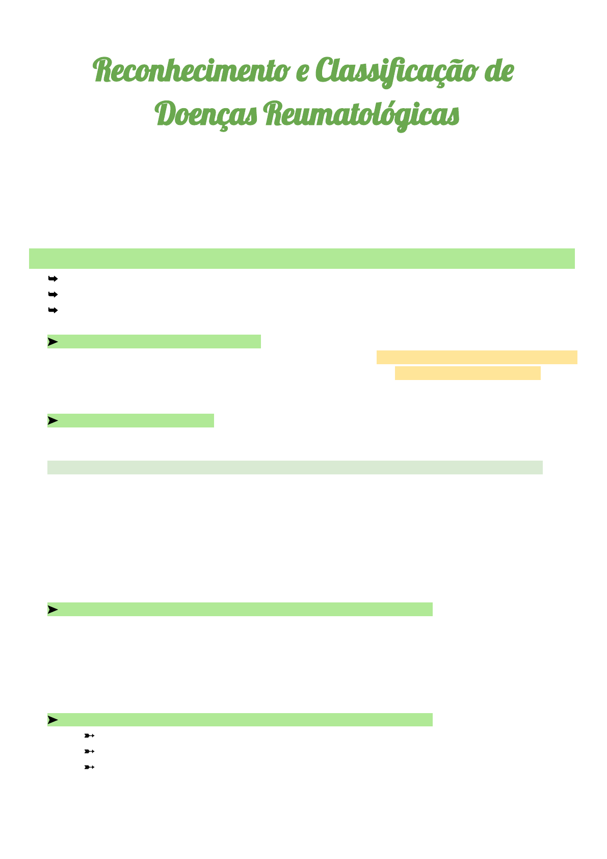 Alexandre Garrido Reumato: Reconhecimento e Classificação / 7º Período - Turma 105 B ________________________________________________________________________________________________ Reconheciment� � Classificaçã� d� Doença� Reumatológica� ⇒ Introduzir as caracterís�cas da disciplina, incluindo seu caráter mul�ssistêmico; ⇒ Os efeitos financeiros de uma doença podem ser avaliados por meio de: custos diretos (relacionados diretamente ao tratamento da doença, como medicações e hospitalizações) e custos indiretos (perda de dias de trabalho devido à doença ou para seu tratamento, além de perda de trabalho do acompanhante/cuidador); ● Queixas musculoesquelé�cas são a 2ª causa de falta ao trabalho (1ª são IVAS) ⇒ Custos intangíveis —> perda da qualidade de vida, sofrimento pela dor ou a incapacidade; __+_____ — Doenças do Sistema Osteomuscular e do Tecido Conjuntivo — ____+_ ➥ M00-M25 = Artropa�as // M30-M36 = Doenças sistêmicas do tecido conjun�vo ➥ M60-M79 = Transtornos dos tecidos moles // M80-M94 = Osteopa�as e condropa�as ➥ M950M99 = Outros transtornos do sistema osteomuscular e do tecido conjun�vo ➤ Queixa mais frequente em Reumatologia? DOR ⇀ Intensidade ⇀ Ritmo (hora do dia, piora ou não com movimento) ⇀ Sintomas inflamatórios (calor, rubor, febre) — buscar no exame �sico ⇀ Deformidade, limitação funcional ➤ Dor Ar�cular / Partes Moles? Lesão ou inflamação das estruturas que estão em volta das ar�culações, resultando em bursites, tendinites, entesites e dor miofascial; ⧭ Síndrome de Dor Musculoesquelé�ca Difusa (Sd. Fibromiálgica) ⇨ Início dos sintomas geralmente é insidioso ⇨ A dor pode ser relatada como queimação, peso, contusão ou “exaustão” da região afetada ⇨ Pode haver rigidez ma�nal, porém de curta duração ➨ Dor generalizada ➨ Fadiga (geralmente pior na manhã e no fim do dia) ➨ Insônia (sono não reparador) ➨ Parestesias, cefaleia, zumbido ➨ Distúrbios disfuncionais variados (sintomas gastrointes�nais, urinários, psiquiátricos…) ➤ Diagnós�co Diferencial das Artrites ➧ Artrite → dor, calor edema, inflamação / Artralgia → Dor na ar�culação; ➧ Dor inflamatória ⇒ Relacionado com doenças sistêmicas, com repouso, aumenta na manhã ➧ Dor mecânica ⇒ Estresse no movimento, piora no movimento e melhora em repouso ■ Mono artrite ( 1 ) – Oligo artrite ( 2-4 ) – Poli artrite ( 5 ou + ) ⤷ Priorizar anamnese, exame �sico, depois laboratório e imagens ➤ Sequência do Comprome�mento Ar�cular ➳ Adi�vo, surge em um lugar e depois em mais outro ⇒ Artrite reumatóide ➳ Migratório, passa a dor de um lugar para outro ⇒ Febre reumá�ca (comum em crianças) ➳ Intermitente , surge e desaparece ⇒ Artrite microcristalinas (gota) Alexandre Garrido Reumato: Reconhecimento e Classificação / 7º Período - Turma 105 B ________________________________________________________________________________________________ ➤ Padrão de Distribuição da Artrite ➧ Simétrico: Artrite reumatoide / Artrites virais / Osteoartrite erosiva ➧ Assimétrico: Espondiloartrites / Gota tofácea crônica (estágio final) ➤ Qual o modo de instalação do Processo Ar�cular? Qual a duração? ➸ Artrites agudas —> > 6 semanas — artrite reumatoide e espondiloartrites ➤ Qual a topografia das Ar�culações Inflamadas? ➧ Periférica: Artrite reumatóide / Artrites microcristalinas / Febre reumá�ca ➧ Axial ou Axial + Periférica: Espondiloartrites ➧ Localizado ou Generalizado? ⧭ Diagnós�co Diferencial das Artrites ⇨ Condições músculo-esquelé�cas ■ Primárias — quando é primária ao tecido, onde está lesionado ■ Infecções — condição musculoesquelé�ca por infecção, febre, suor ■ Doenças metabólicas ■ Neoplasias ⇛ Alterações das interfalangeanas distais e de suas respec�vas unhas ⤇ Artrite psoriá�ca, já na AM não acomete as interfalangeanas distais ⇛ Nódulos de Heberden (IFD) e Bouchard (IFP) ➨ IFD: Aumento - interfalangeanas distais ➨ IFP: Aumento das interf. proximais Alexandre Garrido Reumato: Reconhecimento e Classificação / 7º Período - Turma 105 B ________________________________________________________________________________________________ Alexandre Garrido Reumato: Reconhecimento e Classificação / 7º Período - Turma 105 B ________________________________________________________________________________________________ ➤ Existem antecedentes patológicos ou comorbidades relevantes? ➳ Psoríase — unhas, couro cabelo, extremidades (cotovelos, joelhos, mãos) ➳ Artrite psoriá�ca costuma cursar com entesite —> entese é o local de inserção dos tendões ➤ Há dados de história familiar ou fatores ambientais importantes? ➧ Fotossensibilidade, marca da camisa ⧭ CASO AULA: Paciente – CA próstata prévio e dor lombar inflamatória: caracterís�cas da dor→ piora com repouso, alívio durante o dia. ⇒ Problemas reumatológicos por metástase ⥸ Manifestações Sistêmicas ⇨ Alterações do Hábito Intes�nal? Uma diarreia infecciosa precedendo quadro de oligoartrite por 4-6 semanas pode ser capital para o diagnós�co de artrite rea�va; ⥸ Monoartrites Agudas ➤ Infecciosas — Bacterianas; ➤ Inflamatórias — Gota, pseudogota; ➤ Traumá�cas — fratura, hemartrose; ➤ Outras — Sinovite por corpo estranho; ⥧ Anamnese – saber se é aguda ou crônica, se há outra ar�culação envolvida, se houve febre, procurar infecção recente, que momento piora a dor, ou se melhora; ➽ Líquido Sinovial —> transparente ⤨ Monoartrites Crônicas ➤ Infecciosas — BK, fungos; ➤ Inflamatórias — AIJ, gota, pseudogota ; ➤ Traumá�cas — Fraturas; ➤ Outras — Osteonecrose, osteoartrite, tumores ; Alexandre Garrido Reumato: Reconhecimento e Classificação / 7º Período - Turma 105 B __