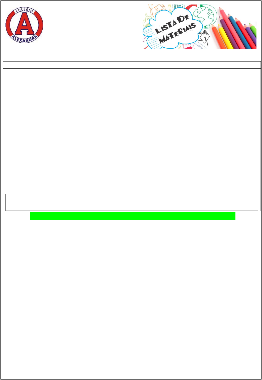 LISTA DE MATERIAL – 2024 “Ora, a fé é a certeza de coisas que se esperam, a convicção de fatos que se não veem.” Hb 11.1 ENSINO MÉDIO 1º ANO Orientações Importantes: Reunião de Apresentação: 02/02/2024 – Enviaremos o horário posteriormente. Início das aulas: 05/01/2024. O(A) ESTUDANTE DEVERÁ ADQUIRIR E PORTAR UMA AGENDA ESCOLAR, DE USO OBRIGATÓRIO durante o ano letivo, que servirá para as anotações das tarefas e para a comunicação entre a escola e a família. Todo o material é de uso e responsabilidade do estudante e deve ser identificado com seu nome, ano e turma. - Todo o material de uso individual deverá conter o nome completo e série/ano do aluno e ser entregue na reunião de pais na secretaria do colégio. As listas já estarão disponíveis em nosso site para compra. No decorrer do ano, os educadores poderão solicitar textos, atividades e outros materiais disponibilizados no ambiente virtual Plurall. O UNIFORME DIÁRIO É DE USO OBRIGATÓRIO, conforme o Contrato de Prestação de Serviços Educacionais. Para as atividades e o desenvolvimento de projetos nos laboratórios, é obrigatório o uso de jaleco branco, com mangas compridas e a logomarca do Colégio. Observação: Todos os materiais solicitados são de uso individual do estudante. Portanto, devem ser apresentados quando houver necessidade do uso, não sendo, assim, recolhidos. ATESTADO MÉDICO PARA AS AULAS DE EDUCAÇÃO FÍSICA Para que o estudante possa participar das aulas de Educação Física o atestado médico deverá ser enviado pelo pediatra ou responsável do aluno até 09/02/2024 na secrétaria do colégio. LISTA DE MATERIAL ESCOLAR 2024 – 1ª SÉRIE ENSINO MÉDIO COLÉGIO ALEXANDRA Matriz: Rua Alencar Araripe,1301 –Sacomã/SP Unidade II: Rua Boiçununga, 189 – São João Clímaco/ SP Unidade III: Rua Salvador Pedroso, 92 – Sacomã / SP Unidade IV: Avenida Patente, 654- Jardim Patente/ SP Unidade V: Rua Marechal Pimentel, 390 – Sacomã /SP - MATERIAL INDIVIDUAL – - 01 Agenda 2022 (com anotação diária) - 01 Mochila escolar - 01 Estojo (grande) - 01 Garrafinha de água – tipo Squeeze - 01 Calculadora científica - 01 Avental Branco de mangas longas (laboratório) - 01 Caderno Universitário 10 Matérias (aprox. 200 folhas) - 01 Pasta de plástico fina com elástico (Fumê) - 03 Lápis pretos n°02 - 02 Lápis desenho/técnico ( 2B e 6B – 1 de cada) - 03 Canetas esferográficas (Azul – Preto – Vermelho) - 02 Canetas marca texto - 01 Régua 30cm - 01 Compasso - 01 Apontador com depósito - 01 Tesoura sem ponta - 02 Borrachas macias - 01 Tubo cola branca pequena - 01 Tubo Cola bastão 20gr - 01 Lápis de cor 12 cores - 01 Corretivo líquido - MATERIAL USO PAPELARIA PARA SER ENTREGUE NO COLÉGIO - 01 Pasta de plástico fina com elástico (azul) - 20 Sacos plásticos transparente com 4 furos - 01 Bloco de canson A3 - 06 Folhas vegetal - 20 Folhas de almaço - 04 Cartolinas (branca) - 500 Folhas de sulfite A4 (branca) -100 Folhas de sulfite A4 (Amarelo) - 05 Tubos de cola quente (grosso) - 01 Pacote de color set (cor sortidas) - 15 Folhas de almaço - 01 Durex / grande - largo - 05 placas E.V.A. (2:com glitter + 3: sortidas) - 03 metros de TNT Branco MATERIAL DIGITAL – 1ª Série Ensino Médio Material Digital Cloe (chromebook) LIVROS PARADIDÁTICOS (LEITURA) 1º TRIMESTRE: Farsa de Inês Pereira AUTOR: Gil Vicente 2º TRIMESTRE: Dez dias de cortiço Autor: Ivan Jaf – Ed. Ática 3º TRIMESTRE: Auto da barca do Inferno Autor: Gil Vicente