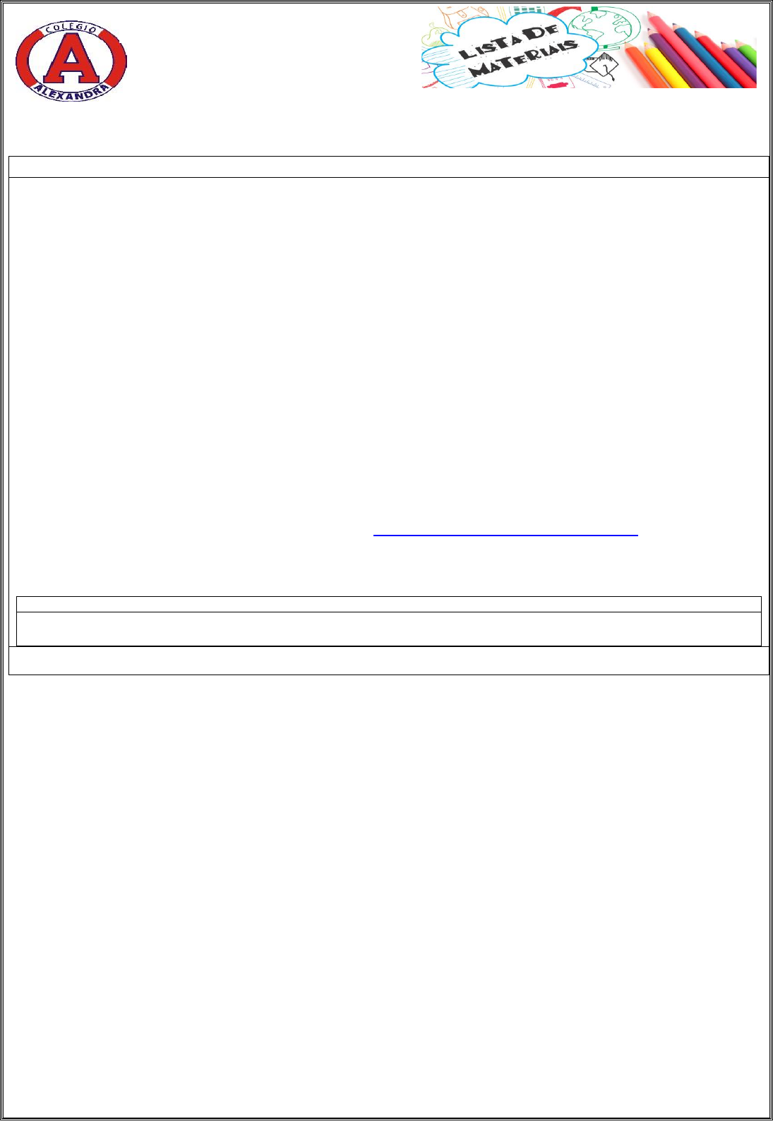 LISTA DE MATERIAL – 2024 “Ora, a fé é a certeza de coisas que se esperam, a convicção de fatos que se não veem.” Hb 11.1 ENSINO FUNDAMENTAL– 9º ANO Orientações Importantes: Reunião de Apresentação: 02/02/2024 – Enviaremos o horário posteriormente. Início das aulas: 05/02/2024. O(A) ESTUDANTE DEVERÁ ADQUIRIR E PORTAR UMA AGENDA ESCOLAR, DE USO OBRIGATÓRIO durante o ano letivo, que servirá para as anotações das tarefas e para a comunicação entre a escola e a família. Todo o material é de uso e responsabilidade do estudante e deve ser identificado com seu nome, ano e turma. - Todo o material de uso individual deverá conter o nome completo e série/ano do aluno e ser entregue na reunião de pais na secretaria do colégio. As listas já estarão disponíveis em nosso site para compra. No decorrer do ano, os educadores poderão solicitar textos, atividades e outros materiais disponibilizados no ambiente virtual Plurall. O UNIFORME DIÁRIO É DE USO OBRIGATÓRIO, conforme o Contrato de Prestação de Serviços Educacionais. Para as atividades e o desenvolvimento de projetos nos laboratórios, é obrigatório o uso de jaleco branco, com mangas compridas e a logomarca do Colégio. Livros Didáticos - Sistema Mackenzie de Ensino Obs. Os livros estão disponíveis para venda até 23/01/2024 com frete grátis site da editora. Segue o link e código de acesso Link: https://www.livrofacil.net/#colegioalexandra Código de acesso: alexandra@2024 Observação: Todos os materiais solicitados são de uso individual do estudante. Portanto, devem ser apresentados quando houver necessidade do uso, não sendo, assim, recolhidos. ATESTADO MÉDICO PARA AS AULAS DE EDUCAÇÃO FÍSICA Para que o estudante possa participar das aulas de Educação Física o atestado médico deverá ser enviado pelo pediatra ou responsável do aluno até 09/02/2024 na secrétaria do colégio. Atenção: O MATERIAL SOLICITADO É UM RECURSO QUE FUNCIONA COMO FIO CONDUTOR DE APREDIZAGEM, TODO ALUNO DEVERÁ TER SEU MATERIAL COMPLETO. COLÉGIO ALEXANDRA Matriz: Rua Alencar Araripe,1301 –Sacomã/SP Unidade II: Rua Boiçununga, 189 – São João Clímaco/ SP Unidade III: Rua Salvador Pedroso, 92 – Sacomã / SP Unidade IV: Avenida Patente, 654- Jardim Patente/ SP Unidade V: Rua Marechal Pimentel, 390 – Sacomã /SP - MATERIAL INDIVIDUAL – - 01 Agenda (com anotação diária)14x20 - 01 Mochila escolar - 01 Estojo (grande) - 01 Garrafinha de água – tipo Squeeze - 01 Dicionário - 01 Dicionário de Inglês -01 Avental Branco de mangas longas com logo do colégio (laboratório) VENDA NO COLÉGIO. - 01 Caderno Universitário 10 Matérias (aprox.200 folhas) - 02 Cadernos Universitário 1 Matéria (aprox.100 folhas) - 01 Pasta de plástico fina com elástico (Transparente) - 03 Lápis pretos n°02 - 01Lápis aquarelado - 02 Lápis desenho/técnico ( 2B e 6B – 1 de cada) - 03 Canetas esferográficas (Azul – Preto – Vermelho) - 02 Canetas marca texto - 01 Régua 20cm - 01 Esquadro 21x45 acrílico - 01 Esquadro 21x60 acrílico - 01 Transferidor 360º - 01 Compasso - 01 Apontador com depósito - 01 Tesoura sem ponta - 02 Borrachas macias - 01 Corretivo - 01 Tubo cola branca pequena - 01 Tubo Cola bastão 20gr - 01 Lápis de cor 12 cores MATERIAL DE PAPELARIA PARA SER ENTREGUE NO COLÉGIO- 9º ANO - 01 Pasta de plástico fina com elástico (vermelha) - 20 Sacos plásticos transparente com 4 furos (grosso) - 01 Bloco de canson – A3 - 500 Folhas de sulfite A4 - 05 Tubos de cola quente (grosso) - 05 placas E.V.A.(3 comum +2 com glitter ) - 02 Folhas de papel Craft - 01 papel preta - 01 Caneta permanente grossa - 02 Folhas de cartolina - 01 Metro de feltro azul - 03 Metros de tnt cinza -01 Rolo de Fio de Nylon 0,50mm - 01 Durex 48x45 - 01 Tela para pintura – tamanho 40 cm x 50 cm https://www.livrofacil.net/#colegioalexandra Livros literários a serem adquiridos em livrarias 1º TRIMESTRE: RAMOS, Graciliano. Vidas Secas. Record. 2º TRIMESTRE: VICENTE, Gil, A Farsa de Inês Pereira-Editora Global. 3º TRIMESTRE: ORWELL, George. A Revolução dos Bichos. Companhia das Letras.. Objetivos Educacionais e Metodologias Empregadas Lei Distrital Nº 4311/2009 A Educação Básica tem por finalidade desenvolver o educando, assegurar-lhe a formação comum indispensável para o exercício da cidadania e fornecer-lhe meios para progredir no trabalho e em estudos posteriores. Objetivos: I) oportunizar o desenvolvimento da capacidade de aprender, tendo como meios básicos o pleno domínio da leitura, da escrita e do cálculo; II) favorecer a compreensão do ambiente natural e social, do sistema político, da tecnologia, das artes e dos valores em que se fundamenta a sociedade; III) assegurar o desenvolvimento da capacidade de aprendizagem, tendo em vista a aquisição de conhecimentos e habilidades e a formação de atitudes e valores; IV) propiciar o fortalecimento dos vínculos de família, dos laços de solidariedade humana e de tolerância recíproca em que se assenta a vida social. Metodologia: A metodologia do trabalho pedagógico é diversificada e busca atender às necessidades de cada estudante. O Mackenzie promove a articulação entre teoria e prática, vinculando a apropriação cognitiva por meio de atividades específicas, tais como: aulas expositivas, trabalhos individuais e em grupo, pesquisas, seminários, projetos didáticos, produções acadêmicas, artísticas, musicais e teatrais, atividades esportivas e desportivas.