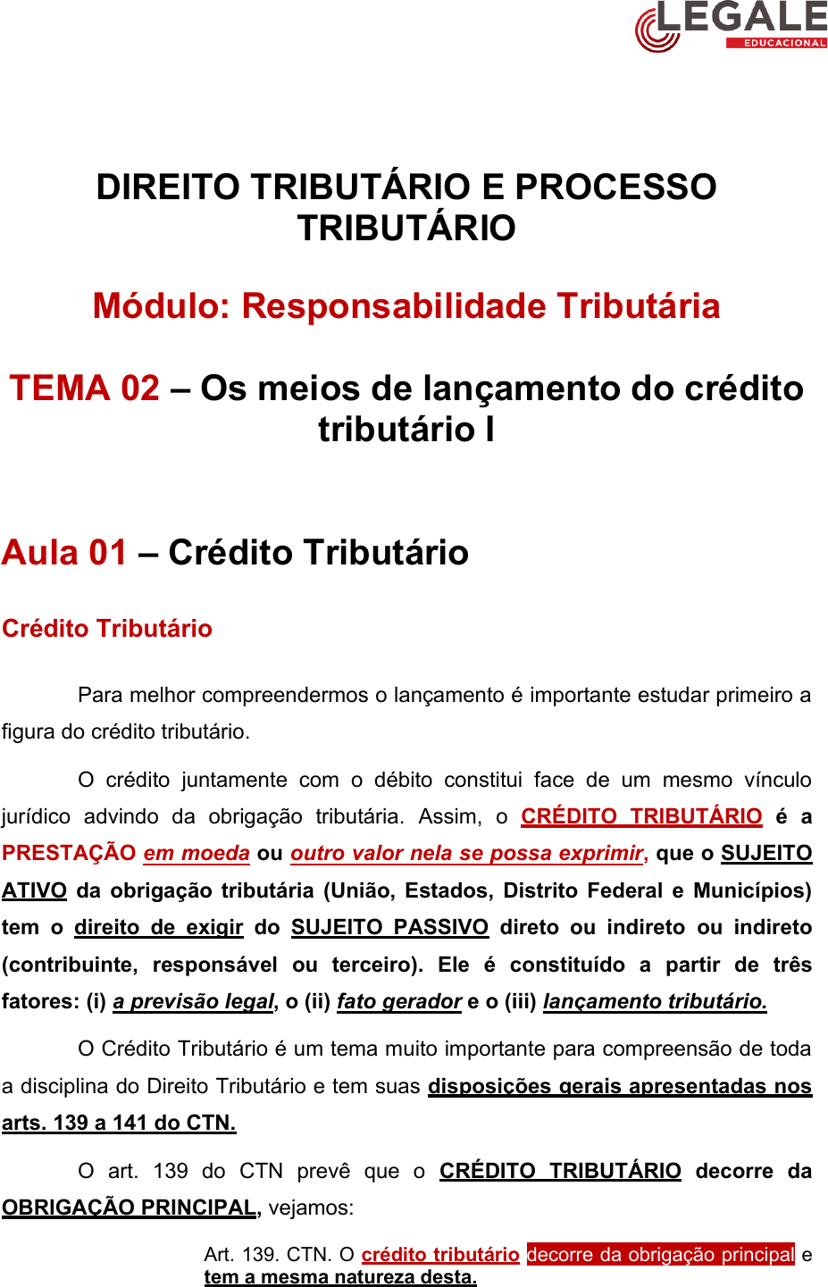 DIREITO TRIBUTÁRIO E PROCESSO TRIBUTÁRIO Módulo: Responsabilidade Tributária TEMA 02 – Os meios de lançamento do crédito tributário I Aula 01 – Crédito Tributário Crédito Tributário Para melhor compreendermos o lançamento é importante estudar primeiro a figura do crédito tributário. O crédito juntamente com o débito constitui face de um mesmo vínculo jurídico advindo da obrigação tributária. Assim, o CRÉDITO TRIBUTÁRIO é a PRESTAÇÃO em moeda ou outro valor nela se possa exprimir, que o SUJEITO ATIVO da obrigação tributária (União, Estados, Distrito Federal e Municípios) tem o direito de exigir do SUJEITO PASSIVO direto ou indireto ou indireto (contribuinte, responsável ou terceiro). Ele é constituído a partir de três fatores: (i) a previsão legal, o (ii) fato gerador e o (iii) lançamento tributário. O Crédito Tributário é um tema muito importante para compreensão de toda a disciplina do Direito Tributário e tem suas disposições gerais apresentadas nos arts. 139 a 141 do CTN. O art. 139 do CTN prevê que o CRÉDITO TRIBUTÁRIO decorre da OBRIGAÇÃO PRINCIPAL, vejamos: Art. 139. CTN. O crédito tributário decorre da obrigação principal e tem a mesma natureza desta. KELVIN CARLOS JONASSON - 06536528956 Logo, o CRÉDITO TRIBUTÁRIO decorre da obrigação de levar recursos aos cofre públicos seja através do pagamento do tributo ou através do pagamento de penalidade pecuniária. Diante disso, conclui-se que o crédito tributário decorre da OBRIGAÇÃO TRIBUTÁRIA PRINCIPAL. Lembre-se que a OBRIGAÇÃO TRIBUTÁRIA pode ser: (i) principal ou (ii) acessória, nos termos do art. 113 do CTN: Art. 113, CTN: A obrigação tributária é principal ou acessória § 1o A obrigação principal surge com a ocorrência do fato gerador, tem por objeto o pagamento de tributo ou penalidade pecuniária e extingue-se juntamente com o crédito dela decorrente. § 2o A obrigação acessória decorre da legislação tributária e tem por objeto as prestações, positivas ou negativas, nela previstas no interesse da arrecadação ou da fiscalização dos tributos. § 3o A obrigação acessória, pelo simples fato da sua inobservância, converte-se em obrigação principal relativamente à penalidade pecuniária. A OBRIGAÇÃO PRINCIPAL surge com a ocorrência do fato gerador e tem por objeto o pagamento de (i) tributo ou (ii) penalidade pecuniária. Não se esqueça: que a obrigação principal se extingue juntamente com o crédito dela decorrente. Já a OBRIGAÇÃO ACESSÓRIA decorre da legislação tributária e tem por objeto prestações de fazer ou não fazer no interesse da arrecadação ou fiscalização dos tributos, ou seja, são os deveres instrumentais prestados pelo sujeito passivo. Relembrado este conceito, voltemos ao estudo do crédito tributário. Nas palavras do professor Hugo de Brito Machado, o CRÉDITO TRIBUTÁRIO: É o vínculo jurídico, de natureza obrigacional, por força do qual o Estado (sujeito ativo) pode exigir do particular, o contribuinte ou responsável (sujeito passivo), o pagamento do tributo ou da penalidade pecuniária (objeto da relação obrigacional)1. 1 MACHADO. Hugo de Brito. Curso de Direito Tributário. 36. ed. São Paulo: Malheiros, 2015, p.176. KELVIN CARLOS JONASSON - 06536528956 Para Eduardo Sabbag O crédito tributário representa o momento da exigibilidade da relação jurídico tributária. Seu nascimento ocorre com o lançamento tributário (art. 142 do CTN) o que permite defini-lo como uma obrigação tributária ‘lançada’ ou, com maior rigor terminológico, obrigação tributária em estado ativo2. Por fim, para Regina Helena Costa, Inicialmente, o art. 139 preceitua que ‘ o crédito tributário decorra da obrigação principal e tem a mesma natureza jurídica desta’. A dicção do Código não é técnica, porquanto sugere que o crédito nasce em consequência da obrigação, quando, em verdade o crédito, aliado ao débito, é face da própria obrigação. No entanto, assim o afirma porque na concepção adotada pelo legislador, o crédito somente ‘nasce’ após sua constituição pelo lançamento3. Atente-se ao seguinte julgado para melhor compreender implicações entre o fato, a obrigação e o crédito. PROCESSUAL CIVIL. TRIBUTÁRIO. EMBARGOS À EXECUÇÃO FISCAL. EXCESSO DE EXECUÇÃO. ITR. ERRO NA BASE DE CÁLCULO. DECLARAÇÃO DO SUJEITO PASSIVO. LANÇAMENTO. ART. 147, § 1.o, DO CPC. CORREIÇÃO DO ERRO PELO PODER JUDICIÁRIO. POSSIBILIDADE. (...) 4. O crédito tributário, na expressa dicção do art. 139 do CTN, decorre da obrigação principal e, esta, por sua vez, nasce com a ocorrência do fato imponível, previsto na hipótese de incidência, que tem como medida do seu aspecto material a base imponível (base de cálculo). 5. Consectariamente, o erro de fato na valoração material da base imponível significa a não ocorrência do fato gerador em conformidade com a previsão da hipótese de incidência, razão pela qual o lançamento feito com base em erro "constitui" crédito que não decorre da obrigação e que, por isso, deve ser alterado pelo Poder Judiciário. (STJ, 1aT., REsp 770.236/PB) Observa-se do julgado que existe uma relação intrínseca entre essas situações. Eu tenho uma obrigação tributária que surge com o cumprimento do 2 SABBAGG. Eduardo. Manual de Direito Tributário, 13 ed., São Paulo: Saraiva Educação, 2021, p.936. 3 COSTA. Regina Helena. Direito Tributário Brasileiro. 1 ed., São Paulo: Saraiva, 2009, p. 215. KELVIN CARLOS JONASSON - 06536528956 fato gerador ou de uma expressa disposição da lei, ao cumprir com o fato gerador deflagra-se uma relação jurídico tributária entre o sujeito ativo e o sujeito passivo. Ora se existe uma obrigação tributária existe a exigência do cumprimento de um crédito tributário e este somente existe com a sua formalização. Mas afinal, o que formaliza a externalização da obrigação tributária, do cr